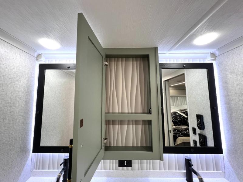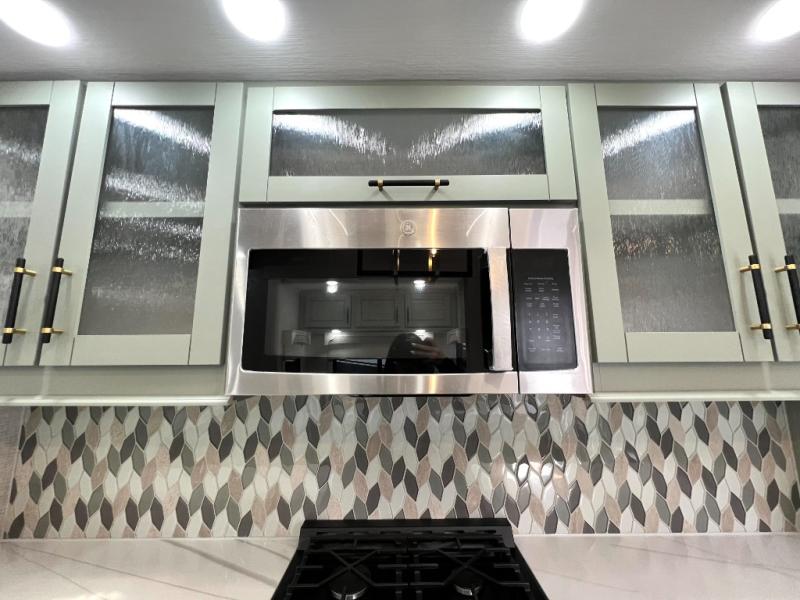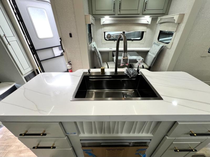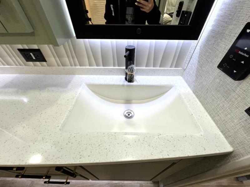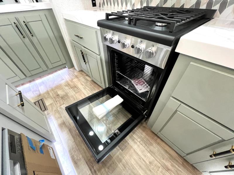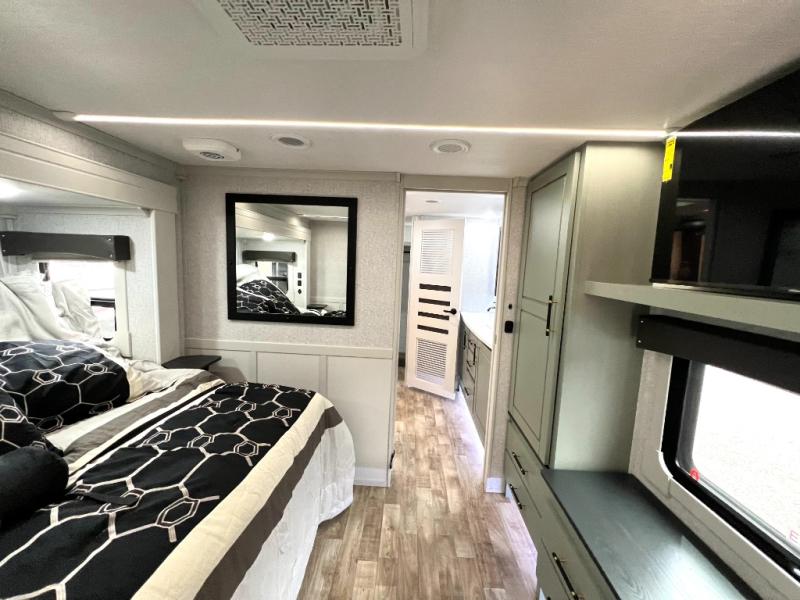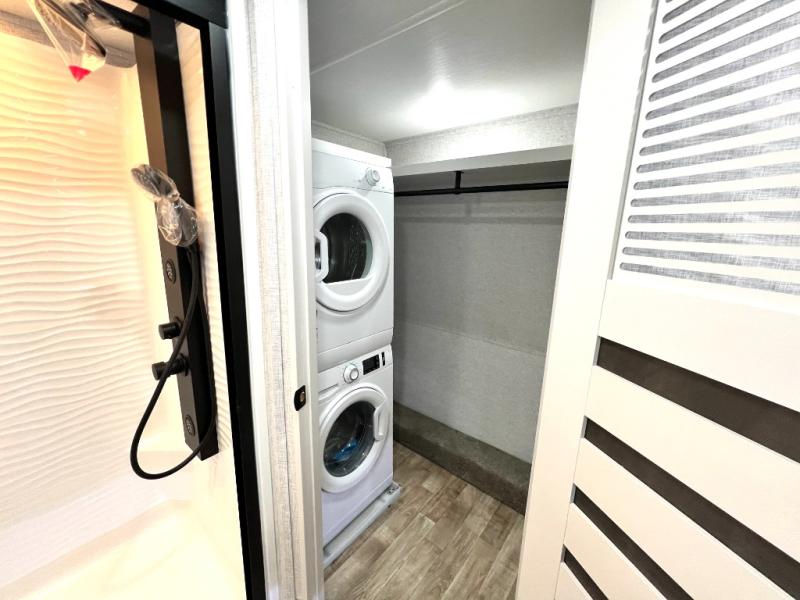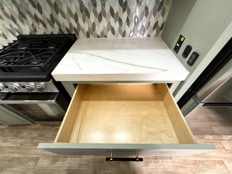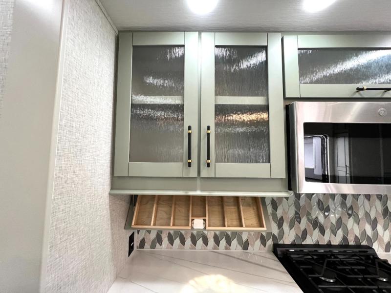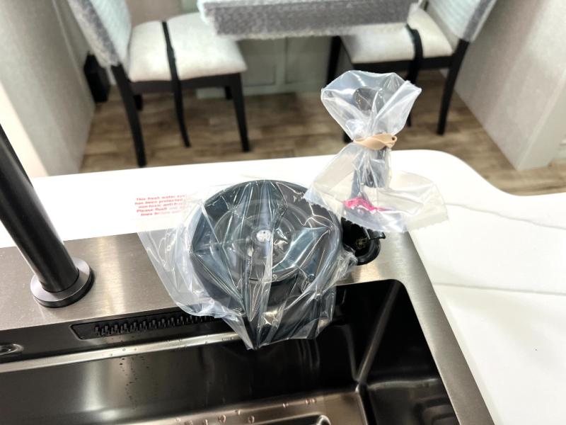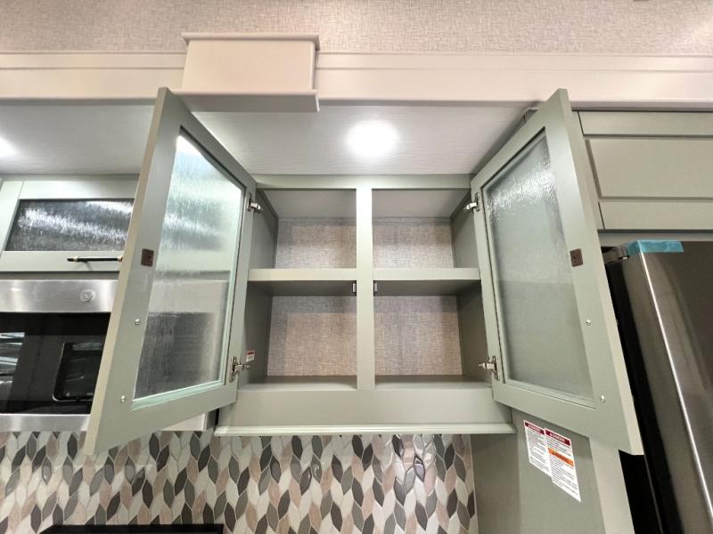 This Redwood fifth wheel is going to make you say wow! The rear living room is fully impressive with its 72" tri-fold sofa slides that are across from one another, its 60" theater sofa, its entertainment center with 65" TV, and its ceiling fan. All in all, it will feel like you're lounging back at home. The kitchen is also completely decked out with opposing slides, a pull-out waste basket at the large island, two buffets, a pantry, and a message center, and just a few steps away from the kitchen is where you will find the luxurious master suite. This space has a full bathroom up at the front where you will find a huge walk-in closet, and within the bedroom, the king bed slide rests across from the 39" TV so that you can watch a movie in comfort.