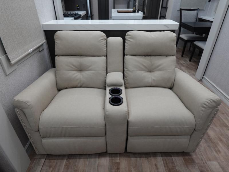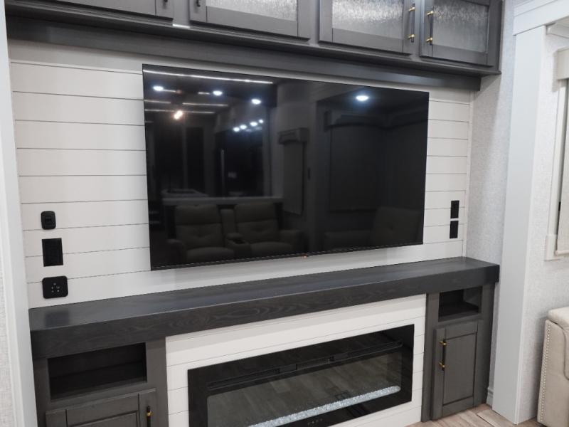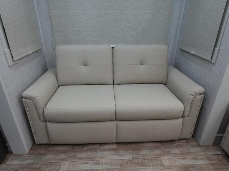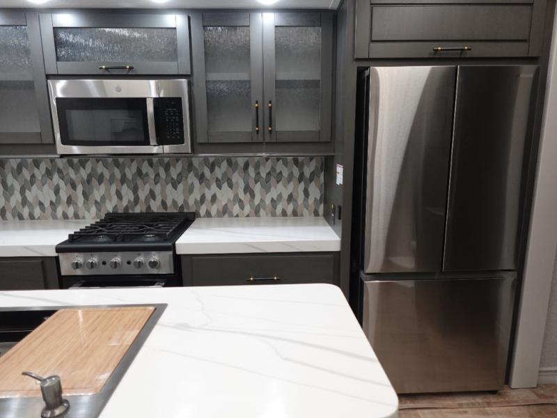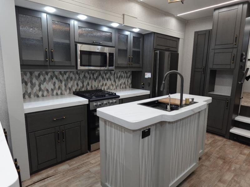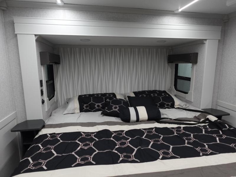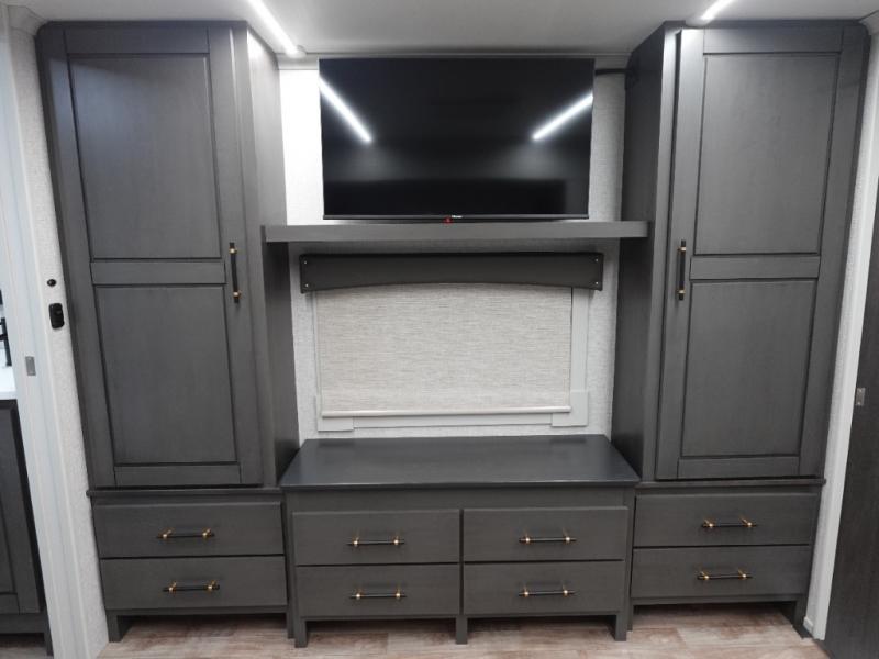 This Redwood fifth wheel is going to make you say wow! The rear living room is fully impressive with its 72" tri-fold sofa slides that are across from one another, its 60" theater sofa, its entertainment center with 65" TV, and its ceiling fan. All in all, it will feel like you're lounging back at home. The kitchen is also completely decked out with opposing slides, a pull-out waste basket at the large island, two buffets, a pantry, and a message center, and just a few steps away from the kitchen is where you will find the luxurious master suite. This space has a full bathroom up at the front where you will find a huge walk-in closet, and within the bedroom, the king bed slide rests across from the 39" TV so that you can watch a movie in comfort.
