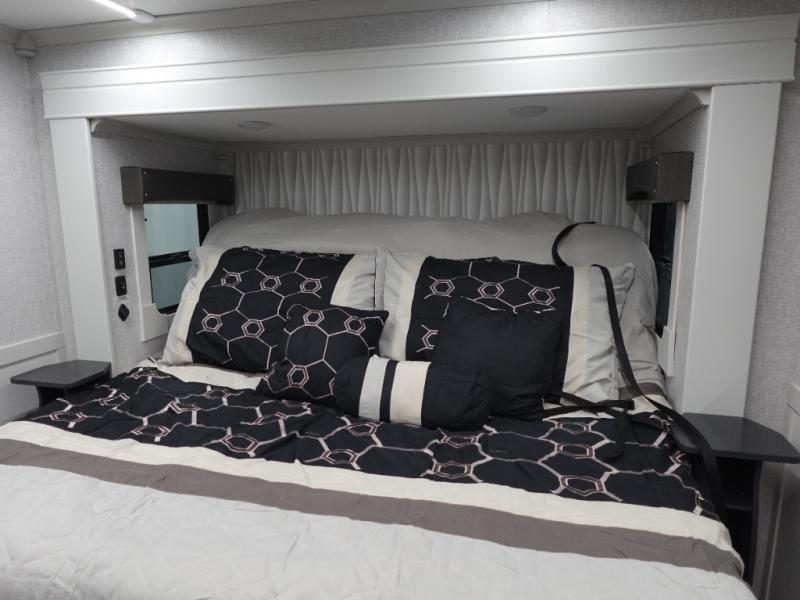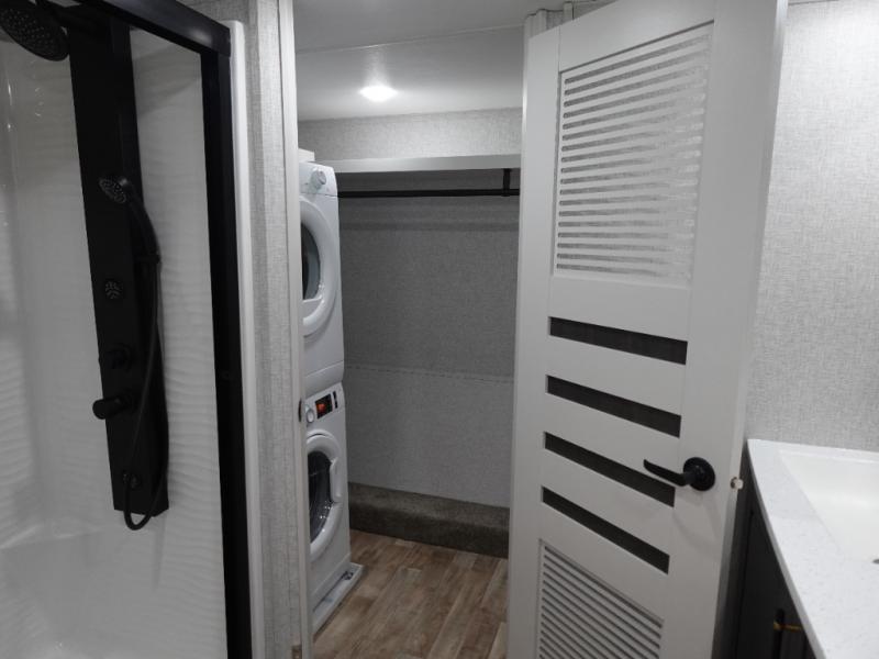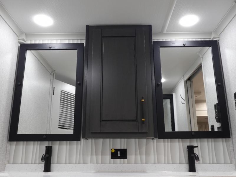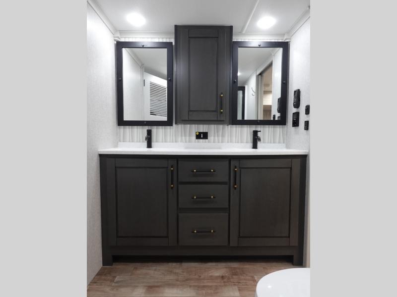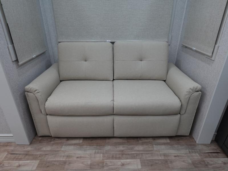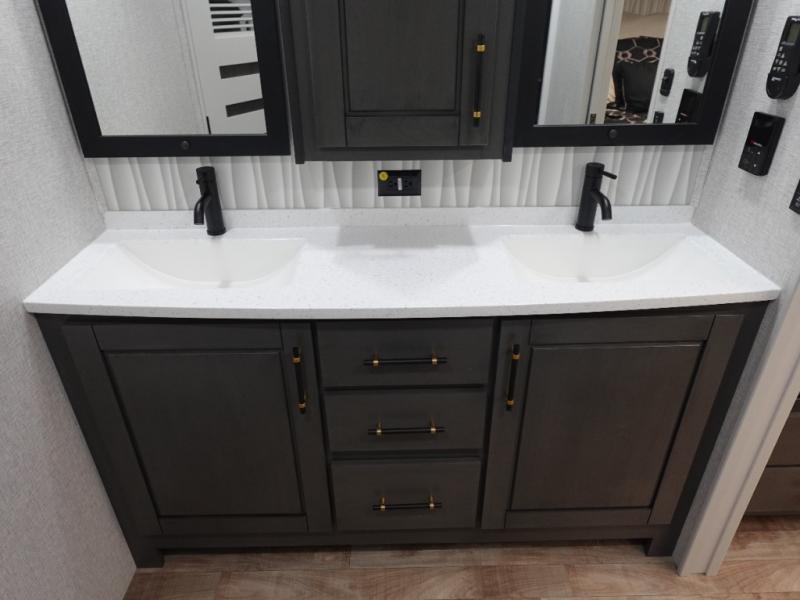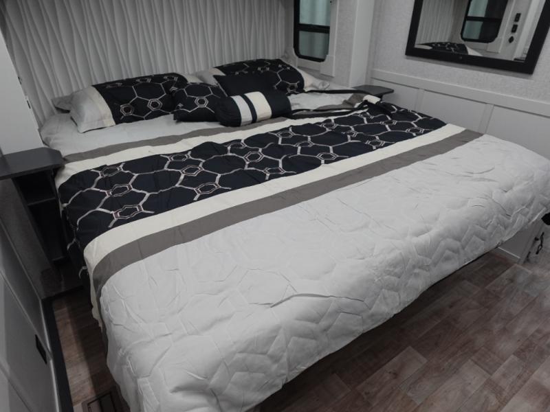 This Redwood fifth wheel is going to make you say wow! The rear living room is fully impressive with its 72" tri-fold sofa slides that are across from one another, its 60" theater sofa, its entertainment center with 65" TV, and its ceiling fan. All in all, it will feel like you're lounging back at home. The kitchen is also completely decked out with opposing slides, a pull-out waste basket at the large island, two buffets, a pantry, and a message center, and just a few steps away from the kitchen is where you will find the luxurious master suite. This space has a full bathroom up at the front where you will find a huge walk-in closet, and within the bedroom, the king bed slide rests across from the 39" TV so that you can watch a movie in comfort.