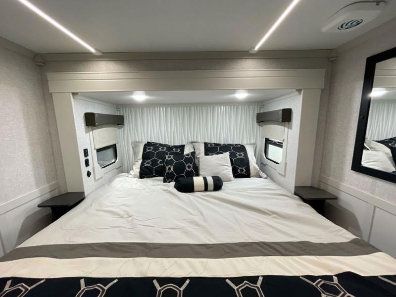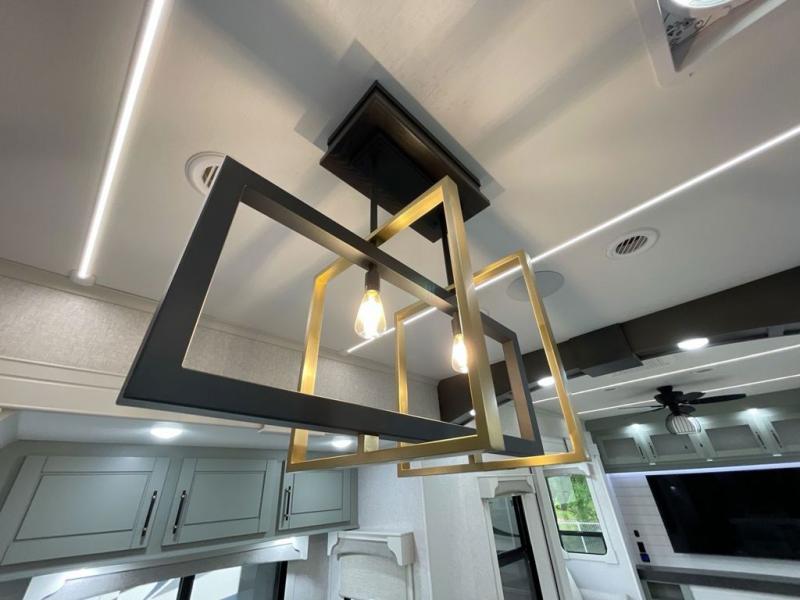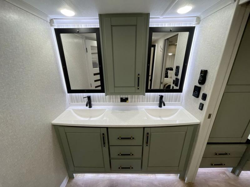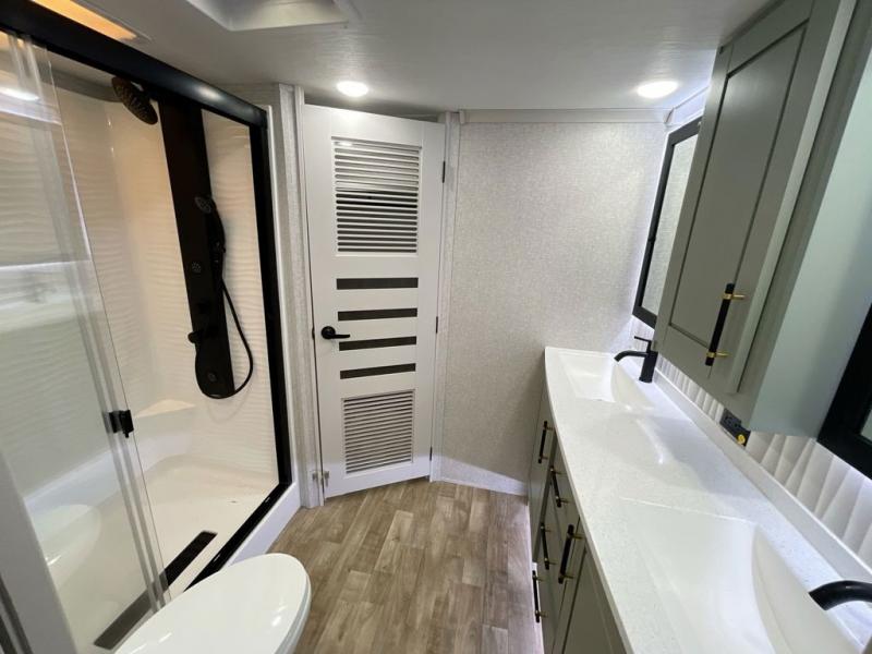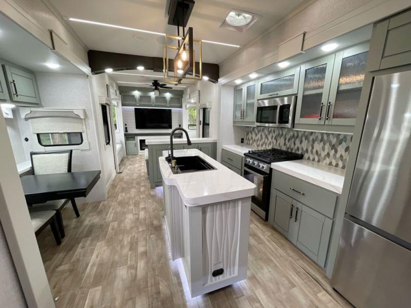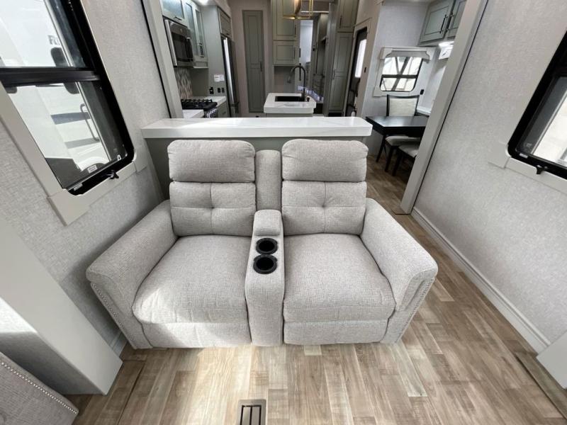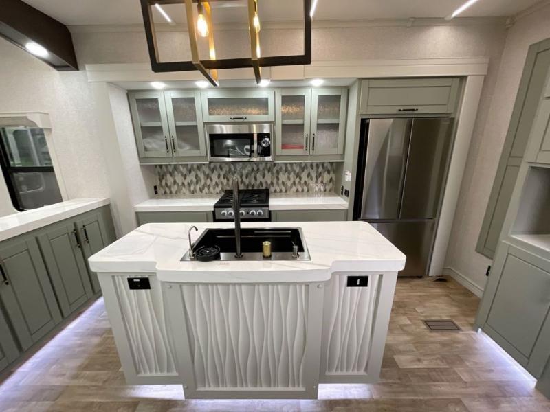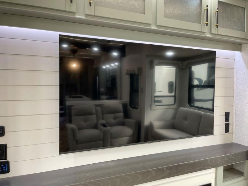 This Redwood fifth wheel is going to make you say wow! The rear living room is fully impressive with its 72" tri-fold sofa slides that are across from one another, its 60" theater sofa, entertainment center with 65" TV, and its ceiling fan. All in all, it will feel like you're lounging back at home. The kitchen is also completely decked out with opposing slides, a pull-out waste basket at the large island, two buffets, a pantry, and a message center, and just a few steps away from the kitchen is where you will find the luxurious master suite. This space has a full bathroom up at the front where you will find a huge walk-in closet, and within the bedroom, the king bed slide rests across from the 39" TV so that you can watch a movie in comfort.