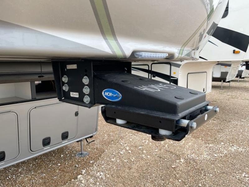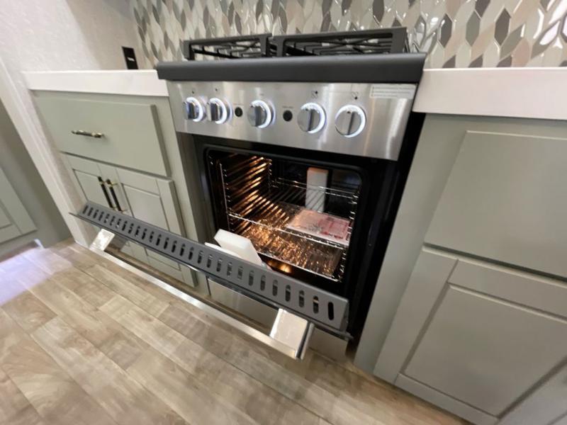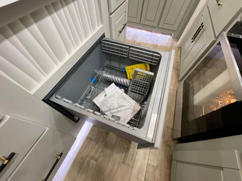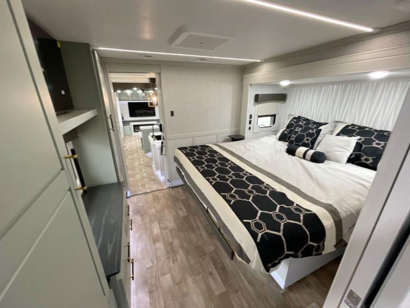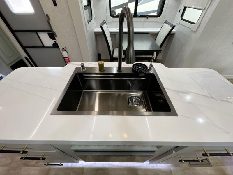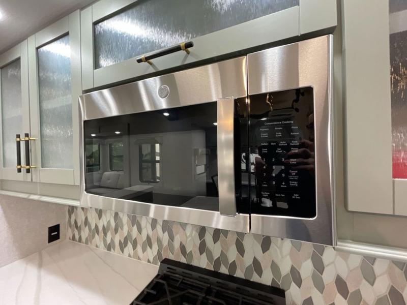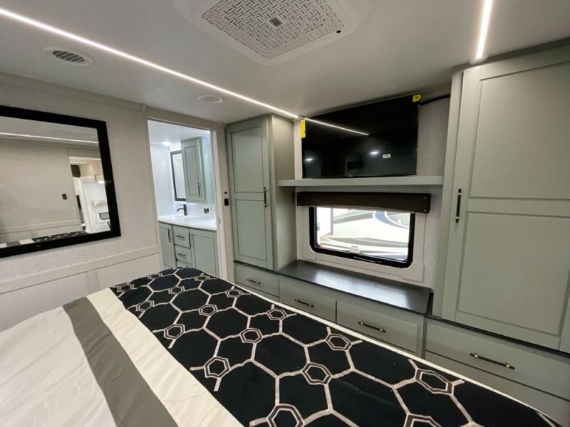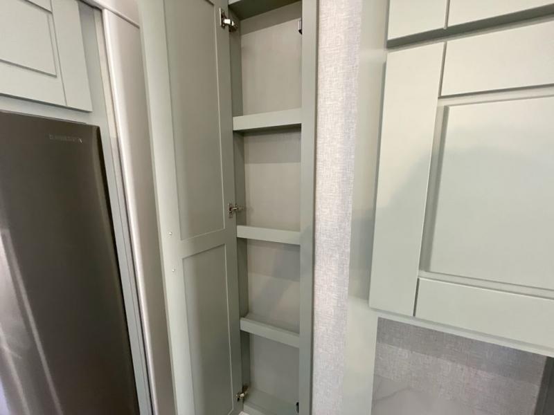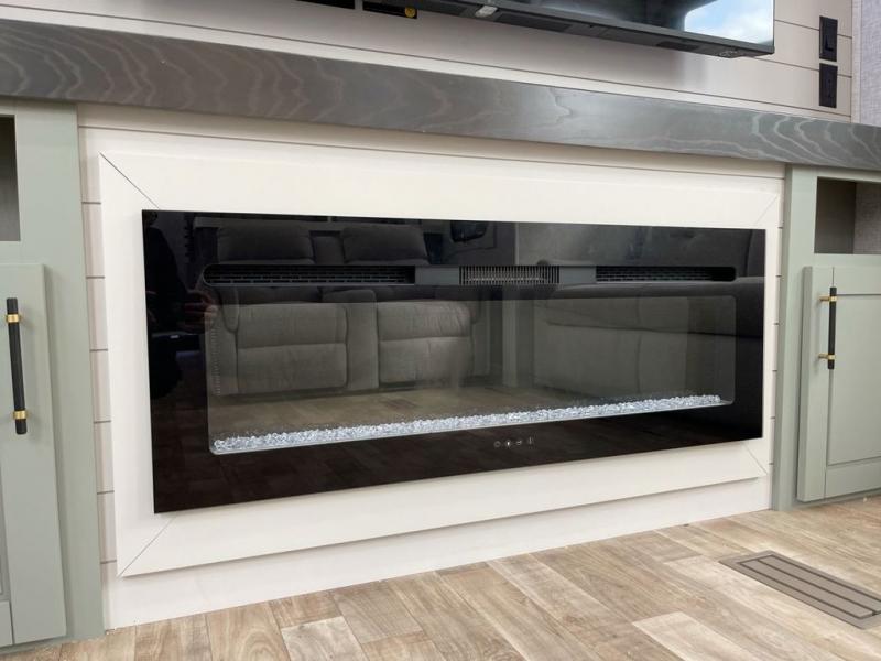 This Redwood fifth wheel is going to make you say wow! The rear living room is fully impressive with its 72" tri-fold sofa slides that are across from one another, its 60" theater sofa, entertainment center with 65" TV, and its ceiling fan. All in all, it will feel like you're lounging back at home. The kitchen is also completely decked out with opposing slides, a pull-out waste basket at the large island, two buffets, a pantry, and a message center, and just a few steps away from the kitchen is where you will find the luxurious master suite. This space has a full bathroom up at the front where you will find a huge walk-in closet, and within the bedroom, the king bed slide rests across from the 39" TV so that you can watch a movie in comfort.