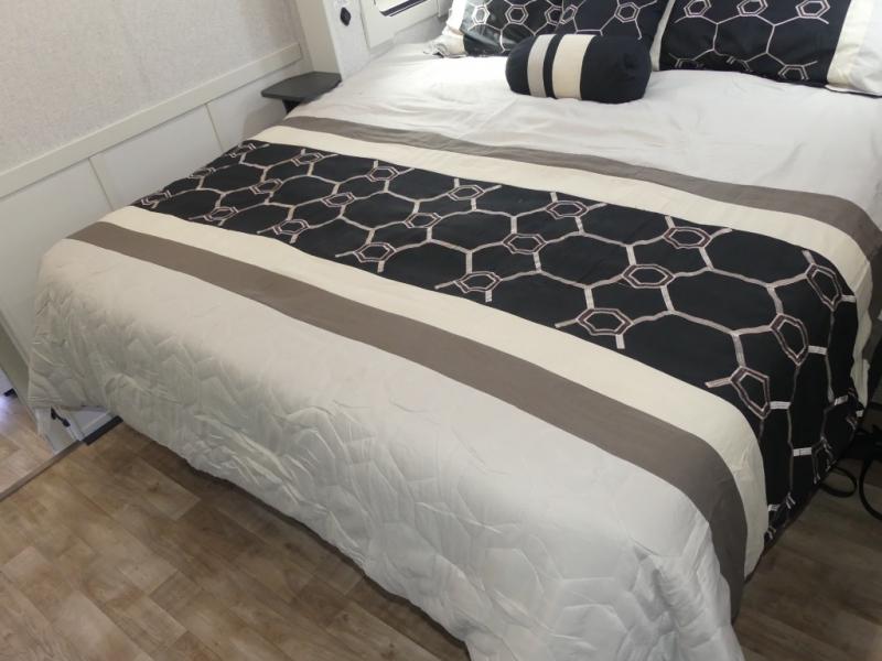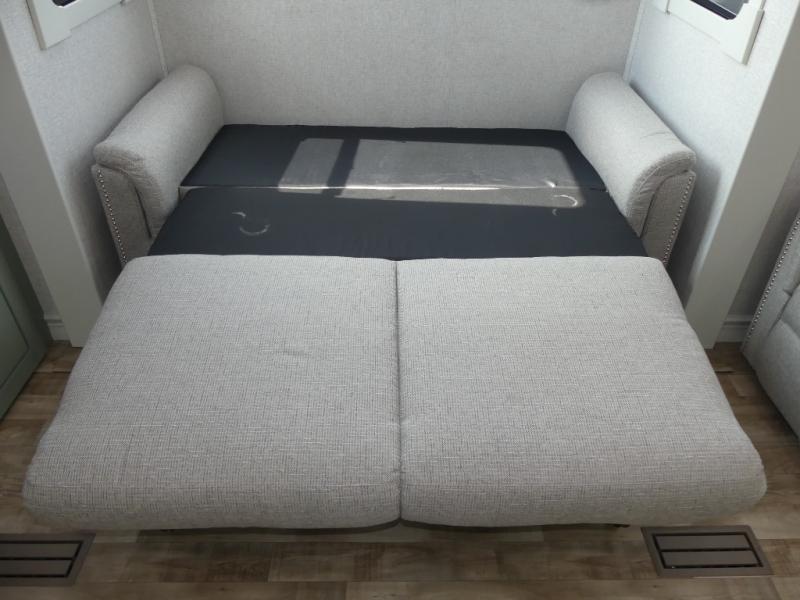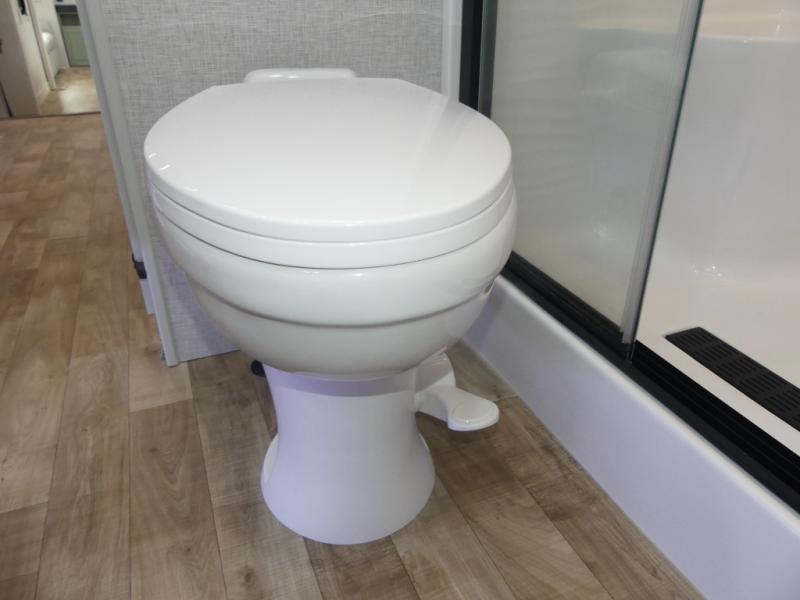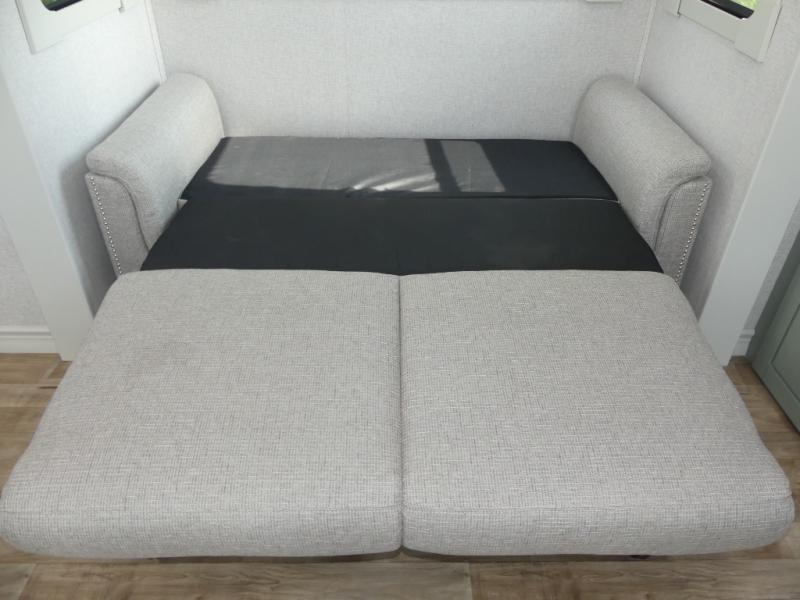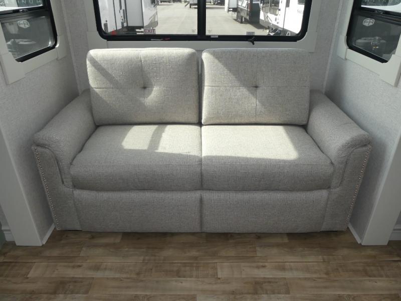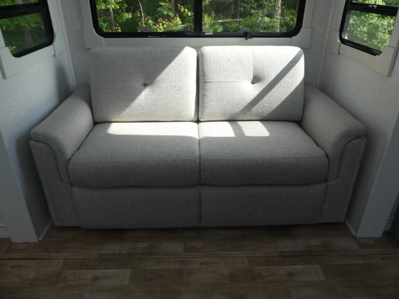You are going to wish you found the Redwood fifth wheels sooner! With all of the residential comfort and modern luxury, you will be impressed. The Williamsburg Furniture Collection includes two premium dinette chairs, a buffet-style adjustable dinette with leaf extension, a residential-style sofa, and powered theater seating. The luxury further extends to the bedroom where you will find a gel-foam king bed with tilt and C-PAP shelves on both sides of the bed. The straight roof line gives a luxury profile, and there are preparations for a wireless backup camera as well as solar power. The seamless residential insulated heat ducts will efficiently heat your unit, and there is an exterior radio in the fully finished and heated pass-through with slat board storage.