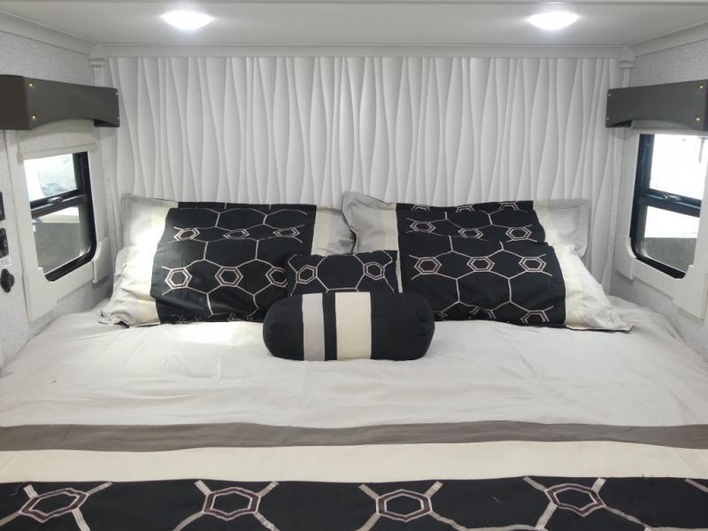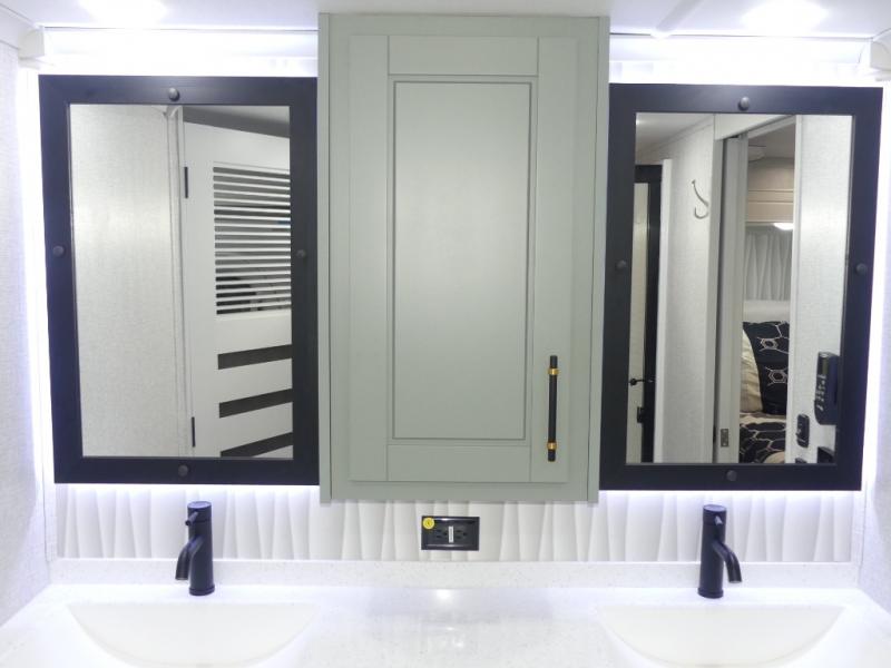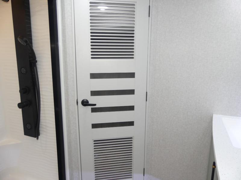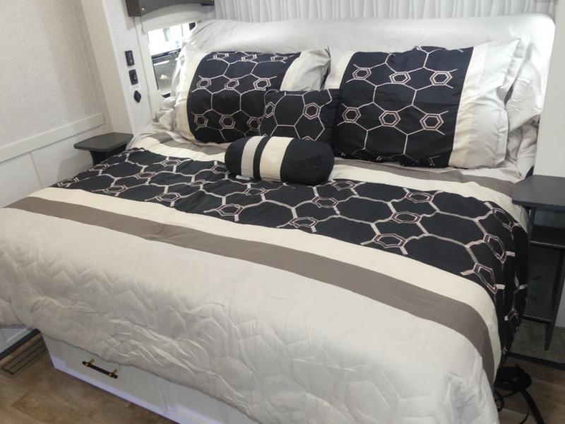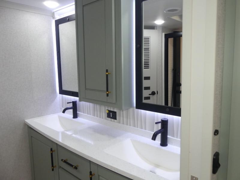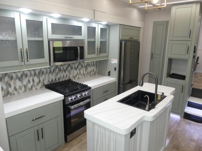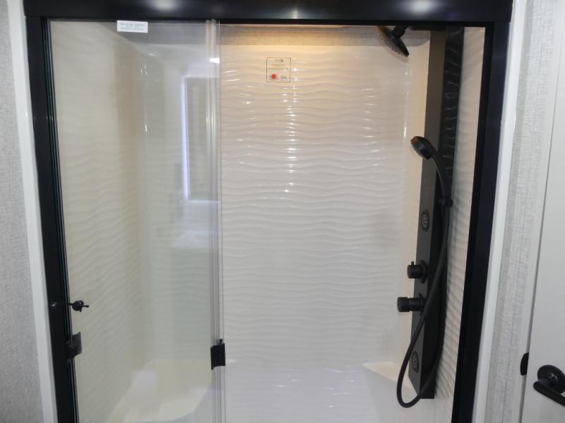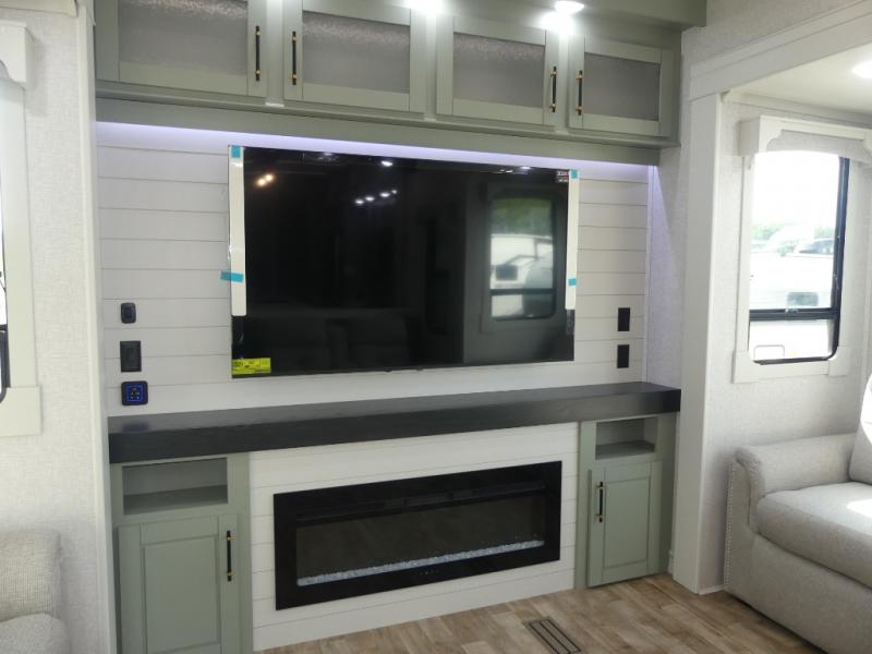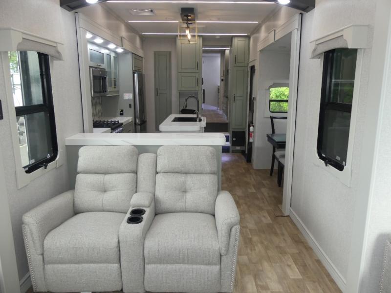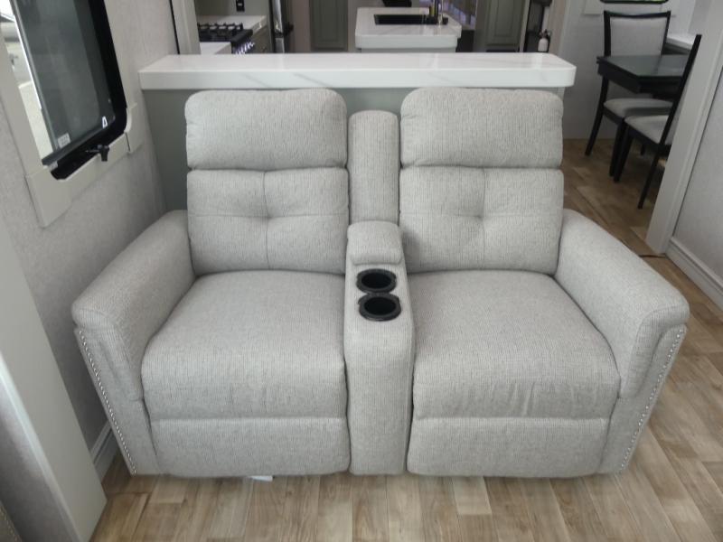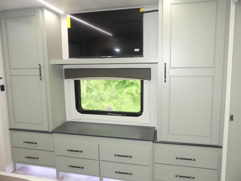 This Redwood fifth wheel is going to make you say wow! The rear living room is fully impressive with its 72" tri-fold sofa slides that are across from one another, its 60" theater sofa, its entertainment center with 65" TV, and its ceiling fan. All in all, it will feel like you're lounging back at home. The kitchen is also completely decked out with opposing slides, a pull-out waste basket at the large island, two buffets, a pantry, and a message center, and just a few steps away from the kitchen is where you will find the luxurious master suite. This space has a full bathroom up at the front where you will find a huge walk-in closet, and within the bedroom, the king bed slide rests across from the 39" TV so that you can watch a movie in comfort.