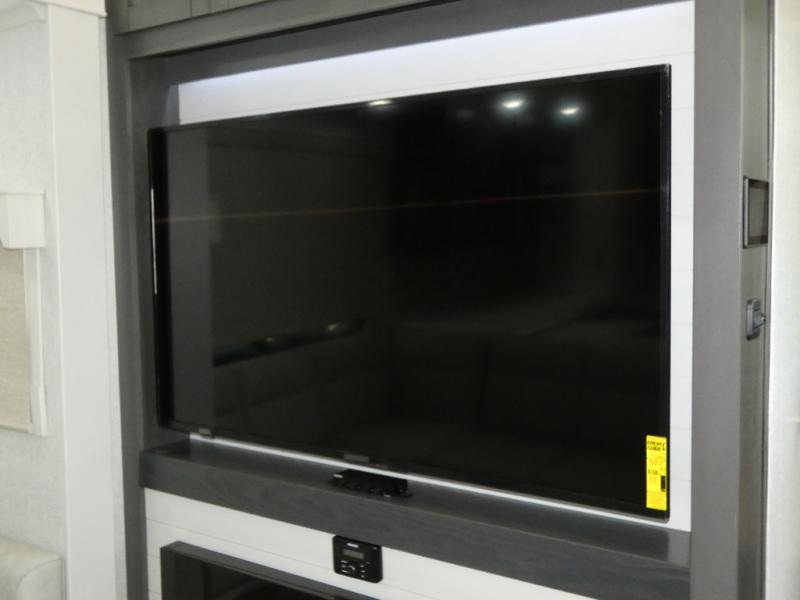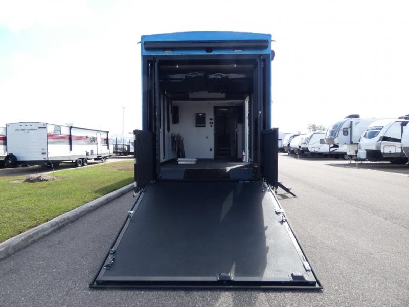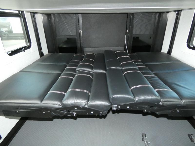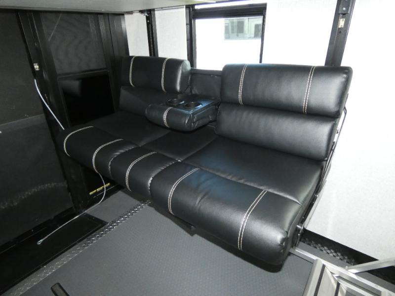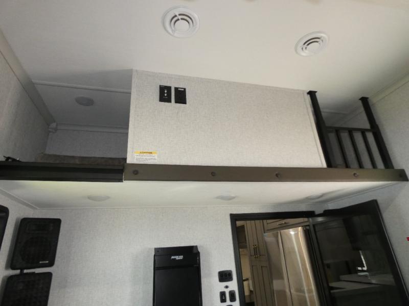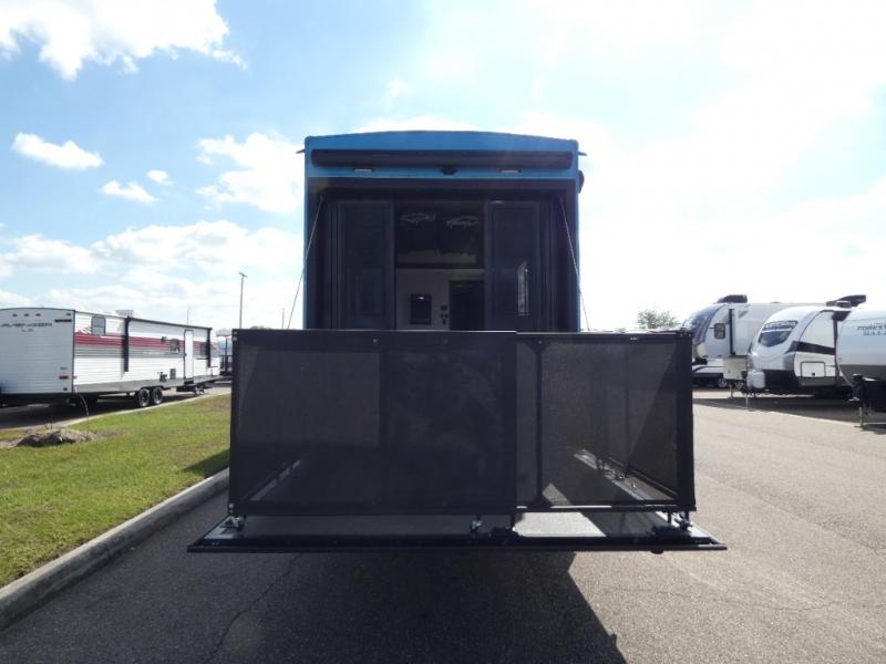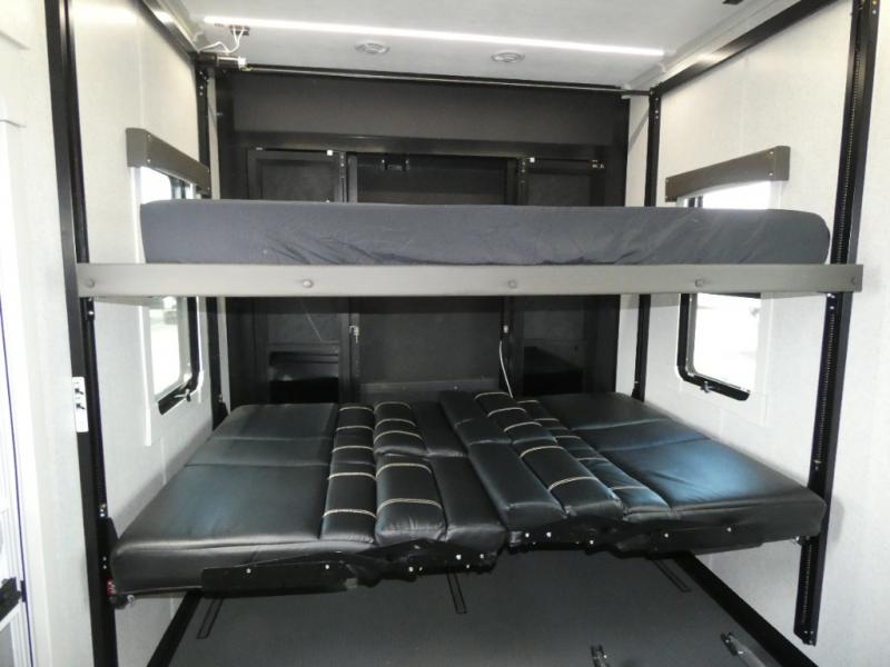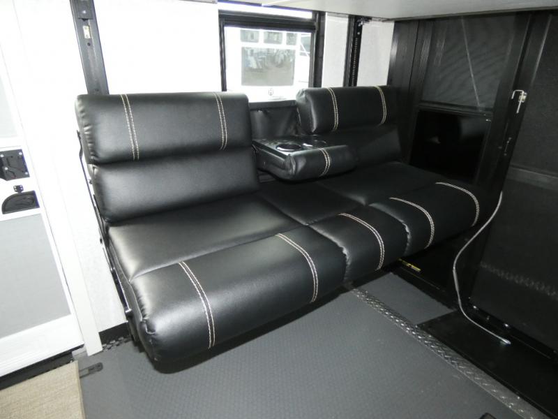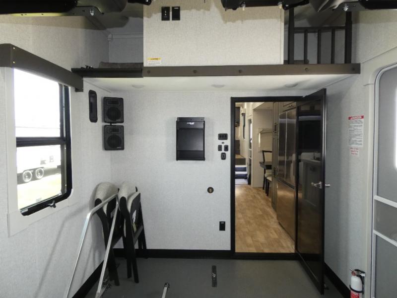 Pack your bags and head out to find the best trails in this spacious toy hauler! Once you're toys are unloaded from the separate garage with a loft, you can relax on the dual opposing sofas with a queen bed above. The chef of your group can make lunch in the spacious kitchen that includes ample counter space, a refrigerator and pantry for food storage, plus a buffet table with two chairs. The main living area will feel just like home with its sectional sofa, 65" TV and fireplace. A spacious full bath will let you clean up each day after kicking up some mud, and the front private bedroom is sure to make you happy with its king bed slide out. There is also a large front closet with a shelf, a dresser with a flip-up lid and 39" TV, plus washer and dryer prep for the option to add these appliances.
