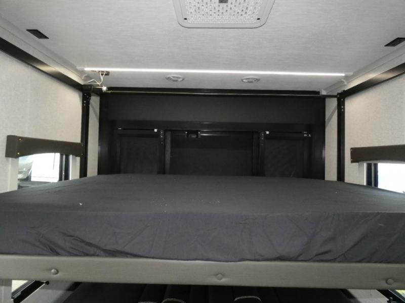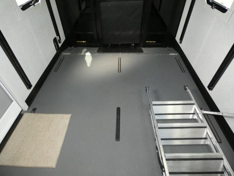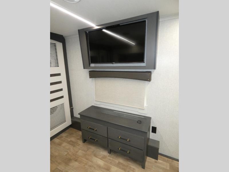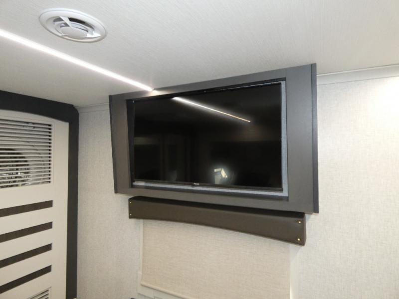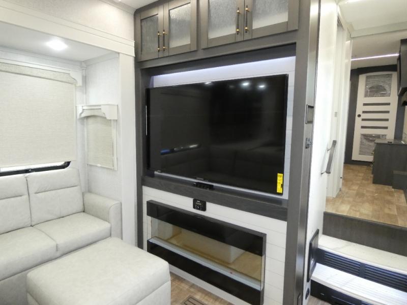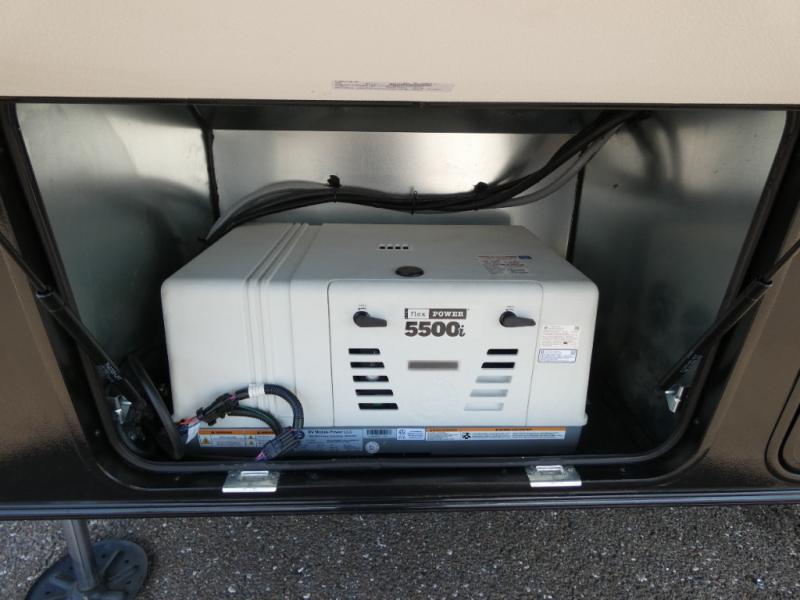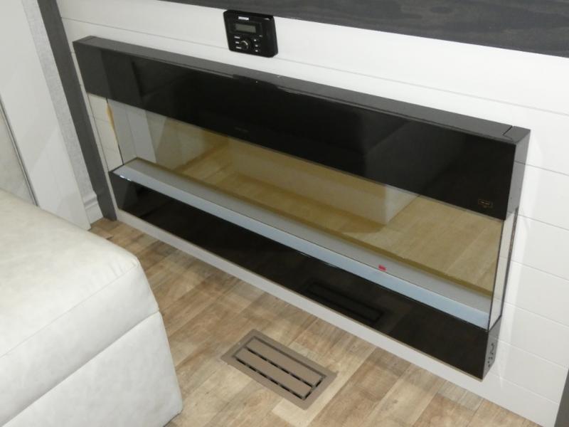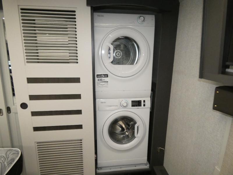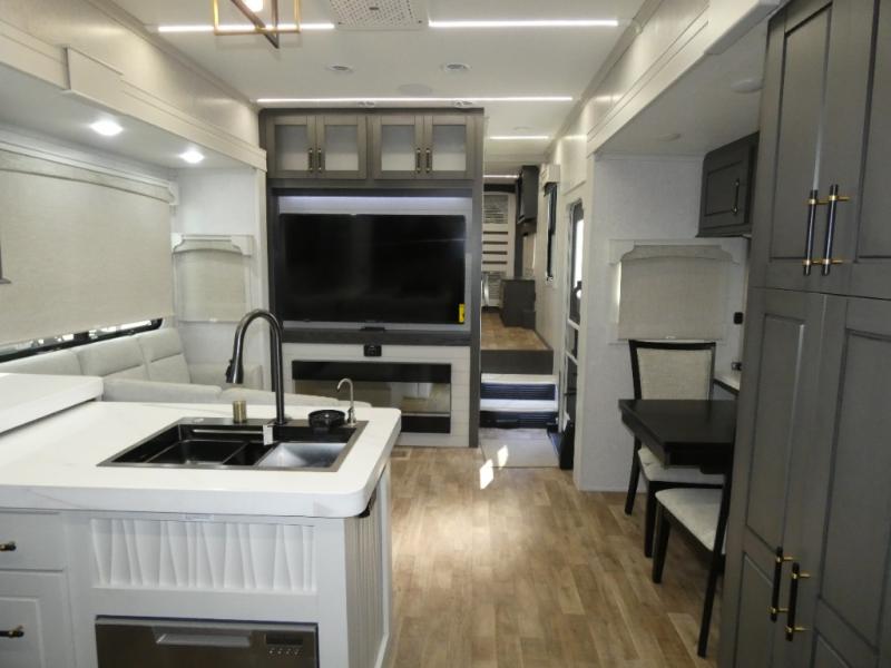 Pack your bags and head out to find the best trails in this spacious toy hauler! Once you're toys are unloaded from the separate garage with a loft, you can relax on the dual opposing sofas with a queen bed above. The chef of your group can make lunch in the spacious kitchen that includes ample counter space, a refrigerator and pantry for food storage, plus a buffet table with two chairs. The main living area will feel just like home with its sectional sofa, 65" TV and fireplace. A spacious full bath will let you clean up each day after kicking up some mud, and the front private bedroom is sure to make you happy with its king bed slide out. There is also a large front closet with a shelf, a dresser with a flip-up lid and 39" TV, plus washer and dryer prep for the option to add these appliances.