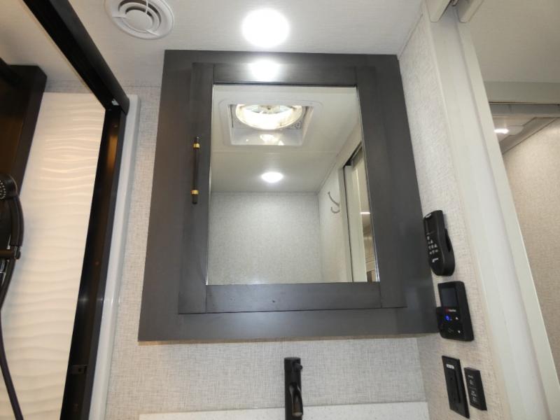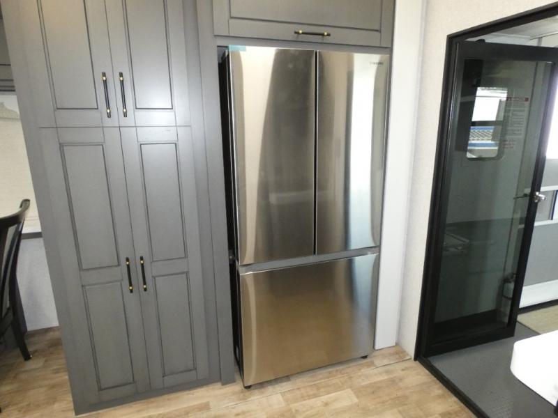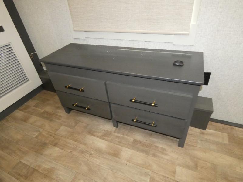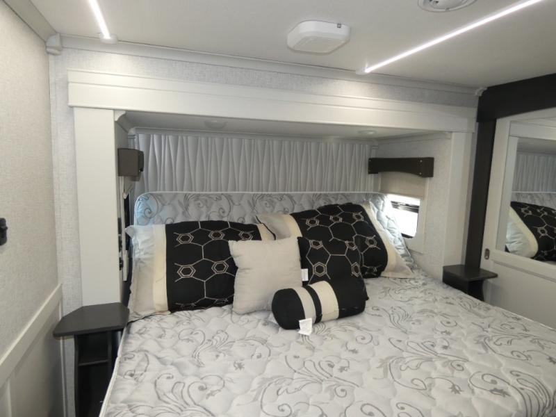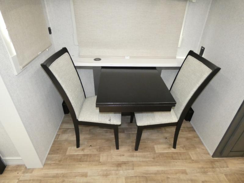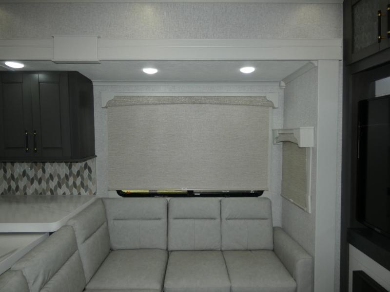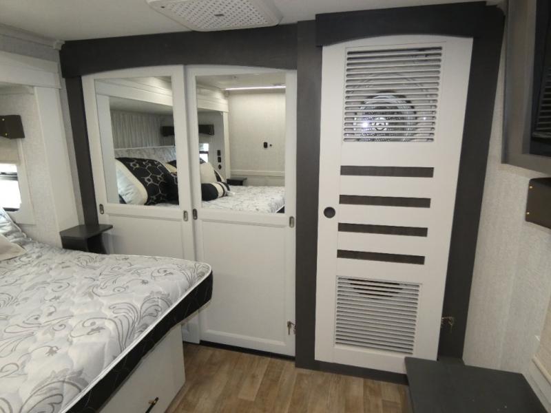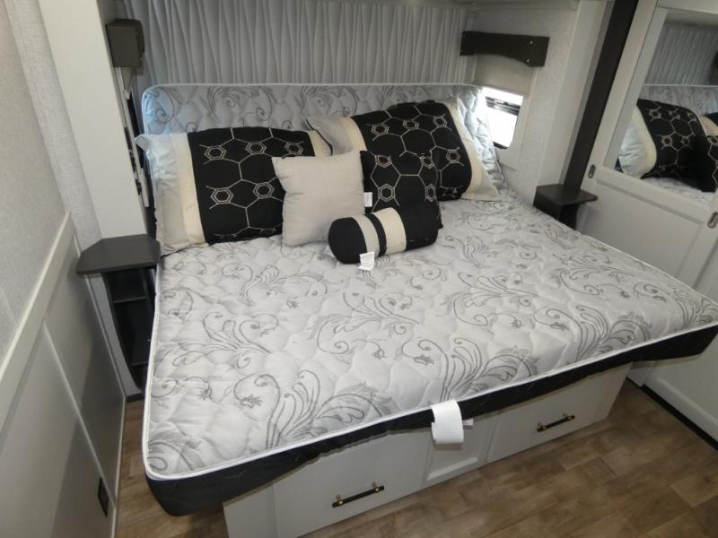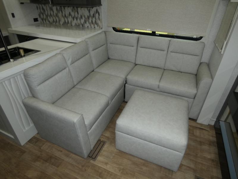 Pack your bags and head out to find the best trails in this spacious toy hauler! Once you're toys are unloaded from the separate garage with a loft, you can relax on the dual opposing sofas with a queen bed above. The chef of your group can make lunch in the spacious kitchen that includes ample counter space, a refrigerator and pantry for food storage, plus a buffet table with two chairs. The main living area will feel just like home with its sectional sofa, 65" TV and fireplace. A spacious full bath will let you clean up each day after kicking up some mud, and the front private bedroom is sure to make you happy with its king bed slide out. There is also a large front closet with a shelf, a dresser with a flip-up lid and 39" TV, plus washer and dryer prep for the option to add these appliances.