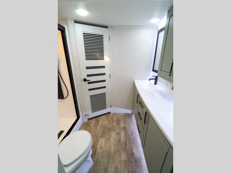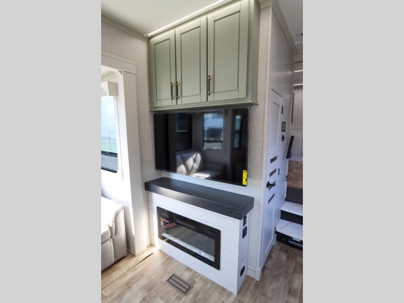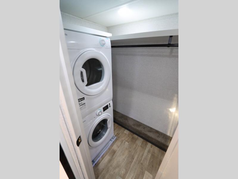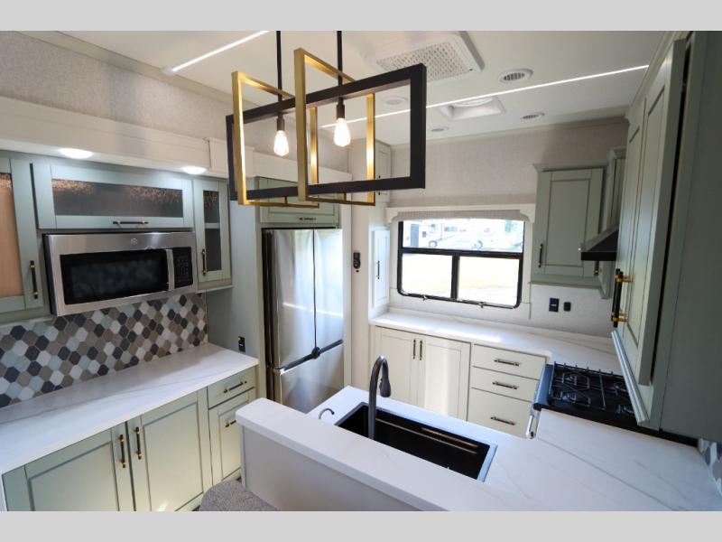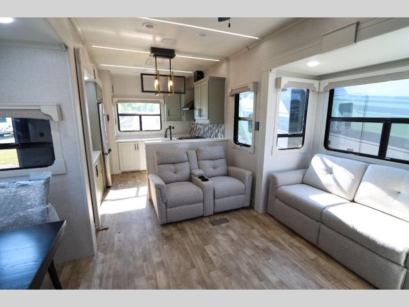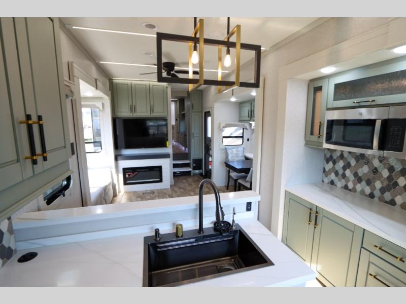 One step inside this fifth wheel and you'll be hooked! You'll love the rear kitchen that includes ample countertop for food prep and a slide including the refrigerator, pantry and microwave for added moving around space. Head to the main living area where you can enjoy some family time on the theater seats, and the dinette with chairs will be the perfect place for a game of cards. The half bath is right off of this room for convenience, and your guests or kids can convert the tri-fold sofa into a bed for sleeping space at night. You will love the master bedroom with a king bed slide out, a dresser with a flip-up lid, plus a 39" TV. The front full bath is super spacious, and it includes a large walk-in wardrobe where you can even add an optional washer and dryer if you choose!