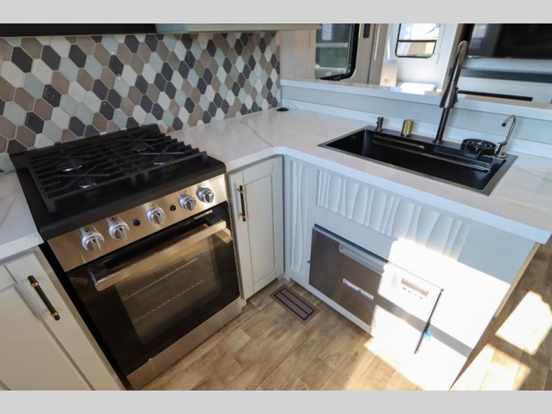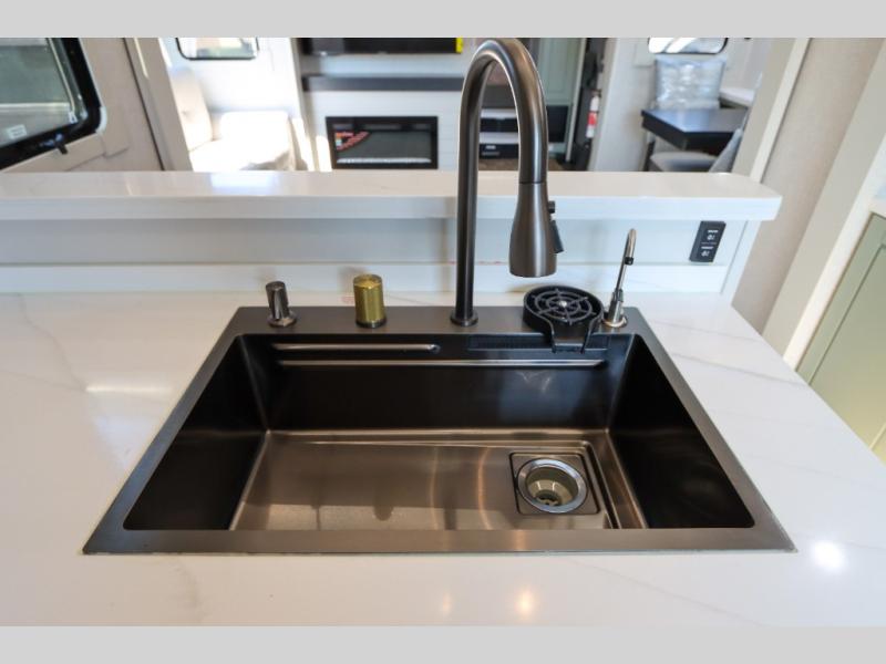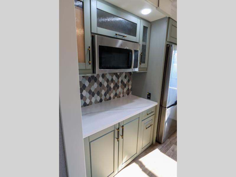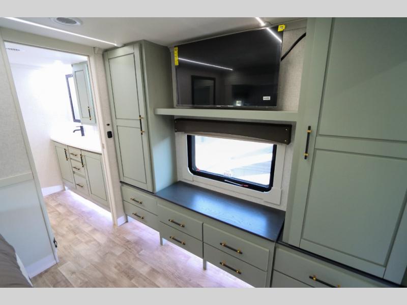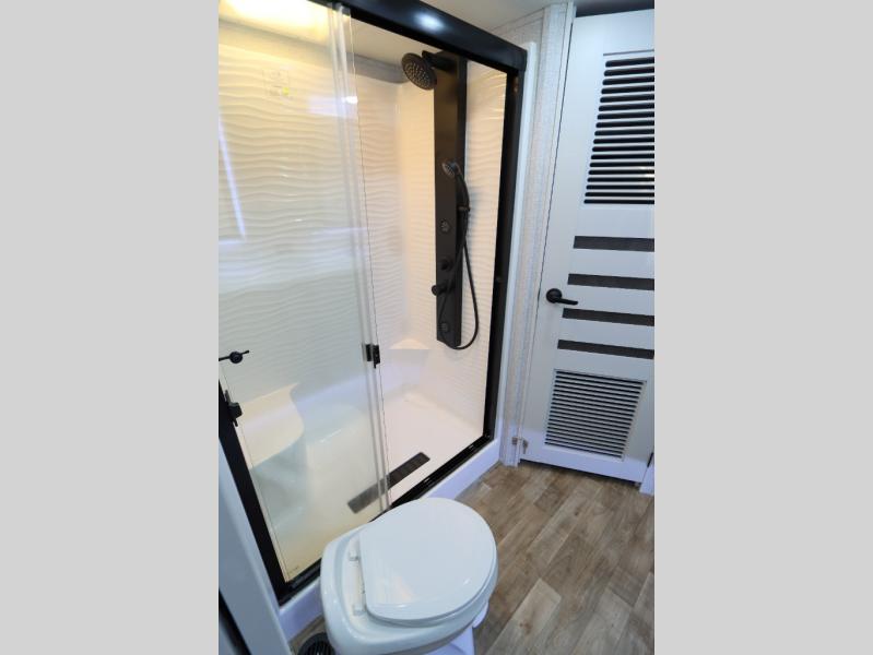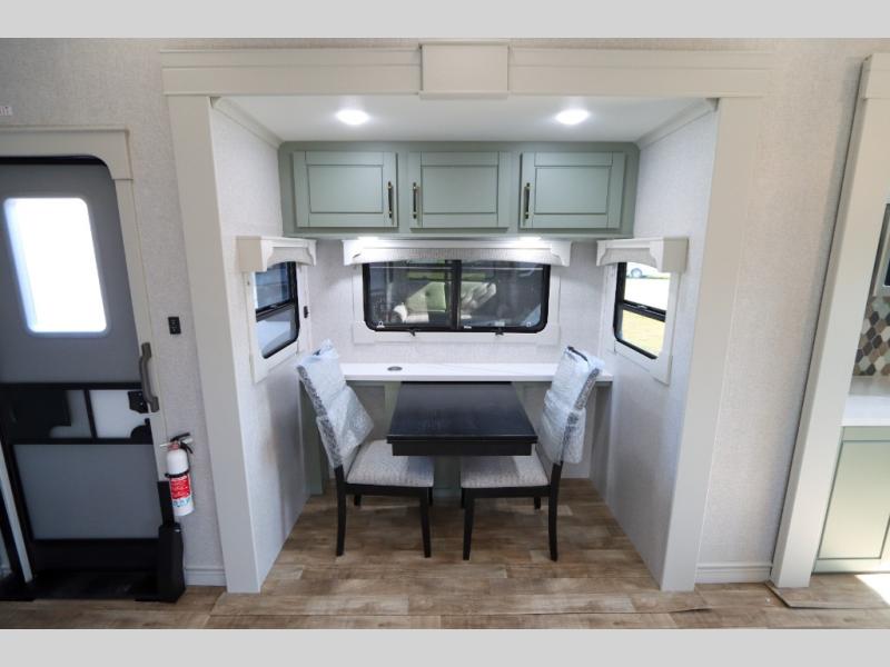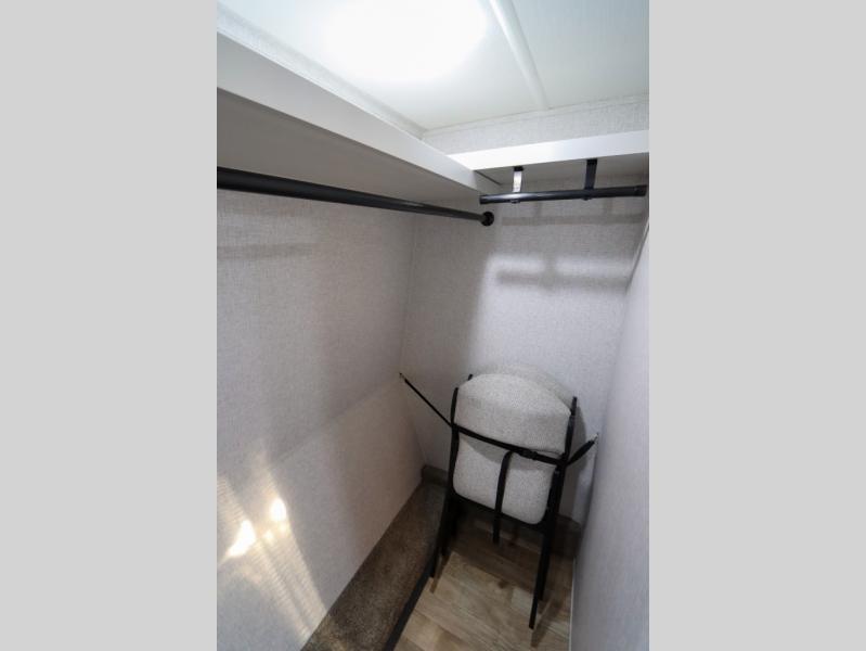 One step inside this fifth wheel and you'll be hooked! You'll love the rear kitchen that includes ample countertop for food prep and a slide including the refrigerator, pantry and microwave for added moving around space. Head to the main living area where you can enjoy some family time on the theater seats, and the dinette with chairs will be the perfect place for a game of cards. The half bath is right off of this room for convenience, and your guests or kids can convert the tri-fold sofa into a bed for sleeping space at night. You will love the master bedroom with a king bed slide out, a dresser with a flip-up lid, plus a 39" TV. The front full bath is super spacious, and it includes a large walk-in wardrobe where you can even add an optional washer and dryer if you choose!