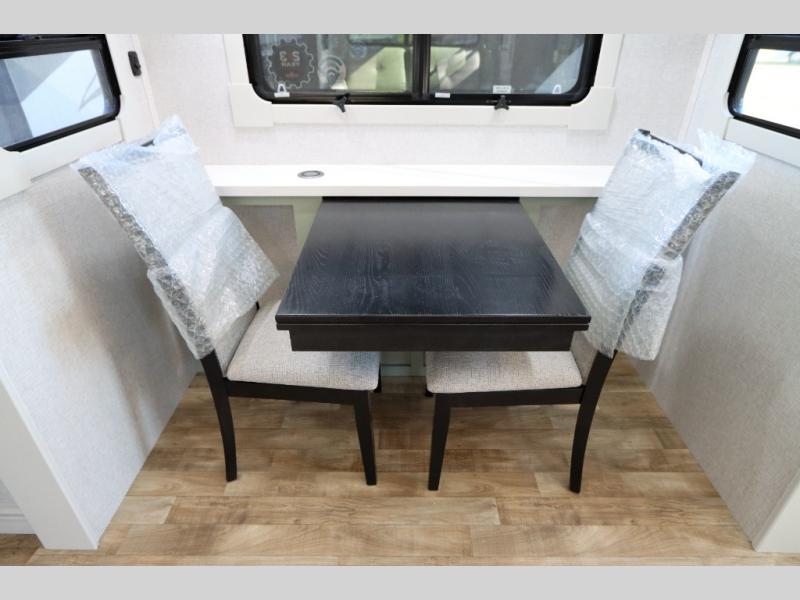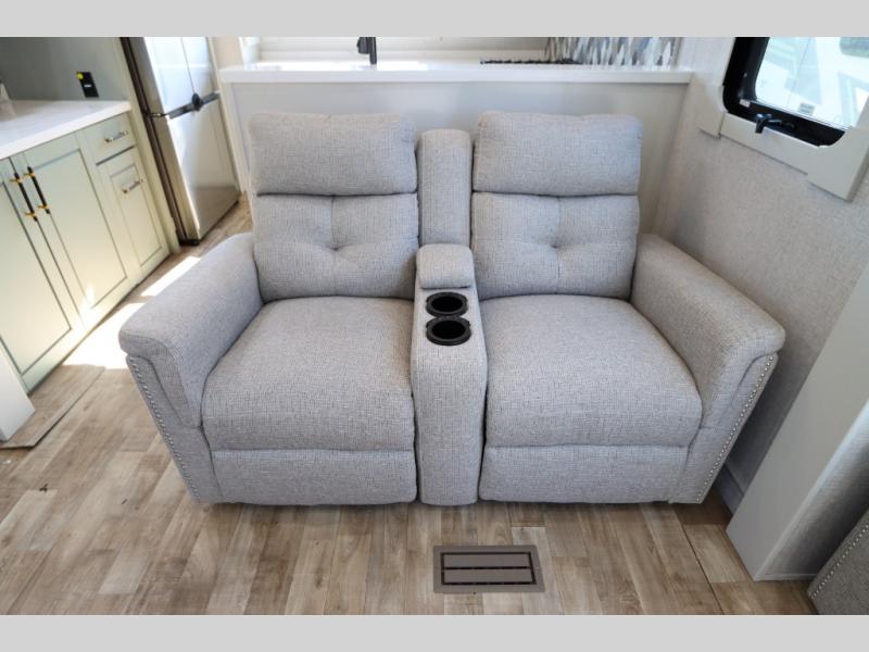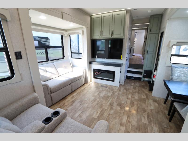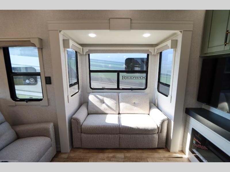 You are going to wish you found the Redwood fifth wheels sooner! With all of the residential comfort and modern luxury, you will be impressed. The Williamsburg Furniture Collection includes two premium dinette chairs, a buffet-style adjustable dinette with leaf extension, a residential-style sofa, and powered theater seating. The luxury further extends to the bedroom where you will find a gel-foam king bed with tilt and C-PAP shelves on both sides of the bed. The straight roof line gives a luxury profile, and there are preparations for a wireless backup camera as well as solar power. The seamless residential insulated heat ducts will efficiently heat your unit, and there is an exterior radio in the fully finished and heated pass-through with slat board storage.