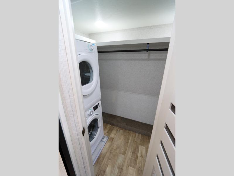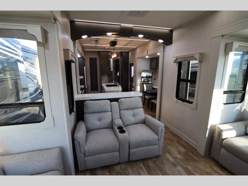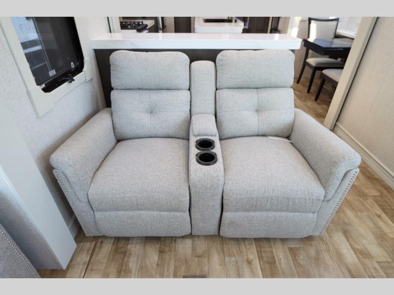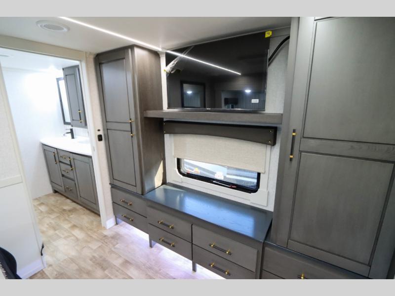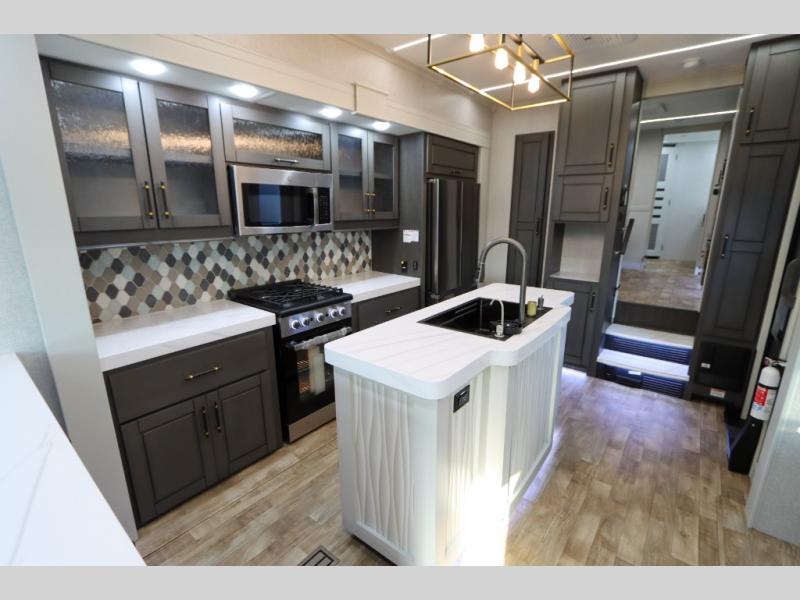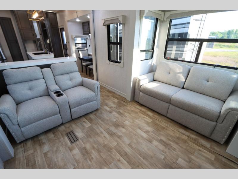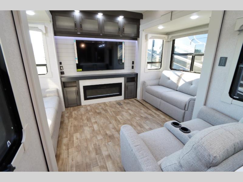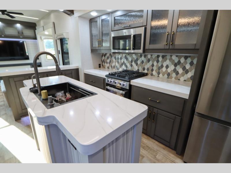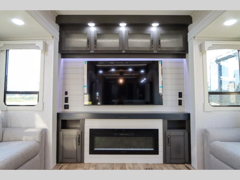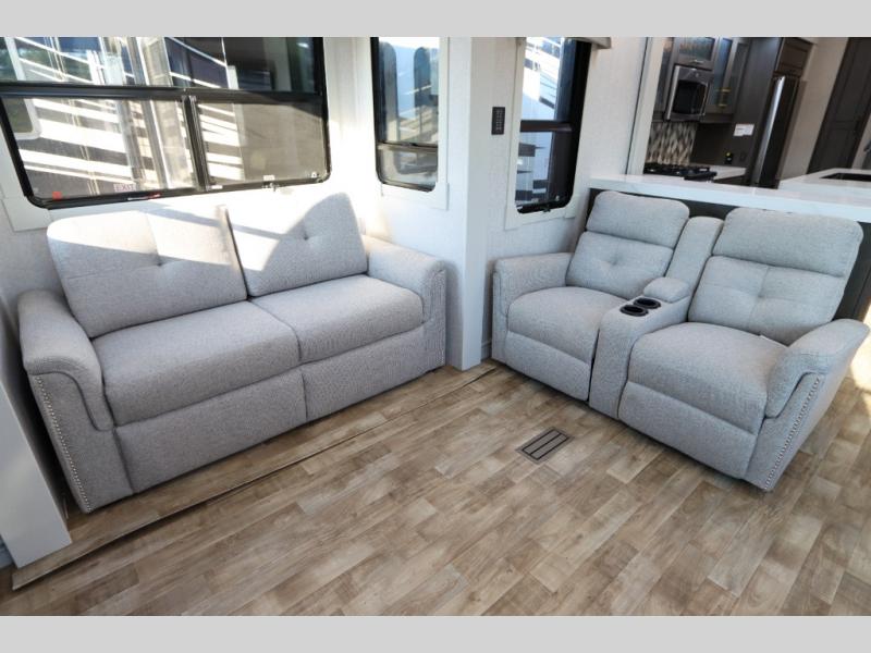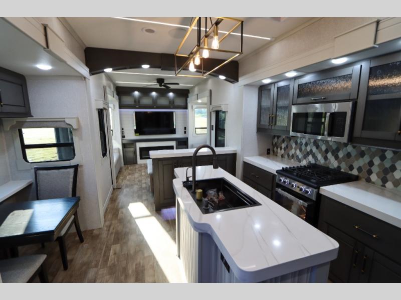 One step inside this fifth wheel and you'll be hooked! You'll love the rear kitchen that includes ample countertop for food prep and a slide including the refrigerator, pantry and microwave for added moving around space. Head to the main living area where you can enjoy some family time on the theater seats, and the dinette with chairs will be the perfect place for a game of cards. The half bath is right off of this room for convenience, and your guests or kids can convert the tri-fold sofa into a bed for sleeping space at night. You will love the master bedroom with a king bed slide out, a dresser with a flip-up lid, plus a 39" TV. The front full bath is super spacious, and it includes a large walk-in wardrobe where you can even add an optional washer and dryer if you choose!