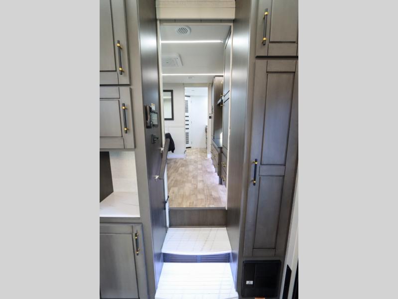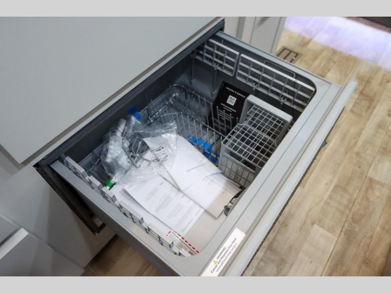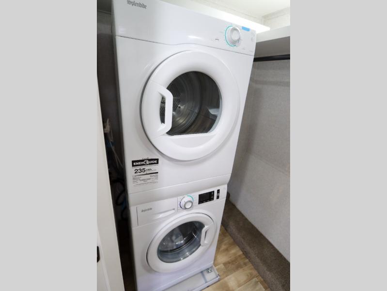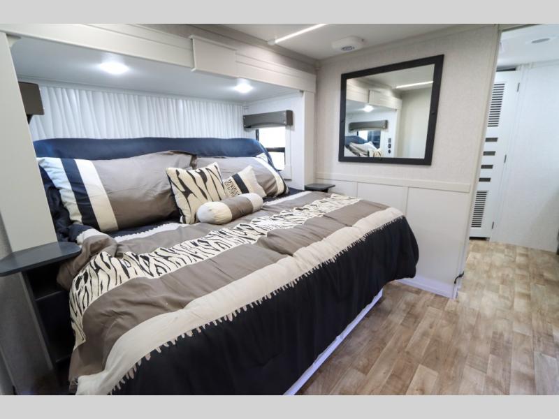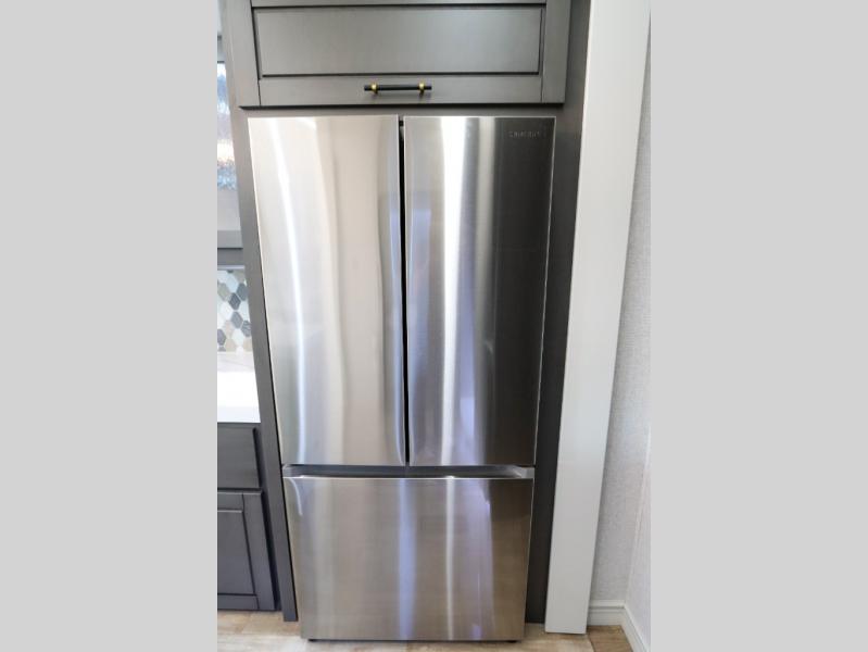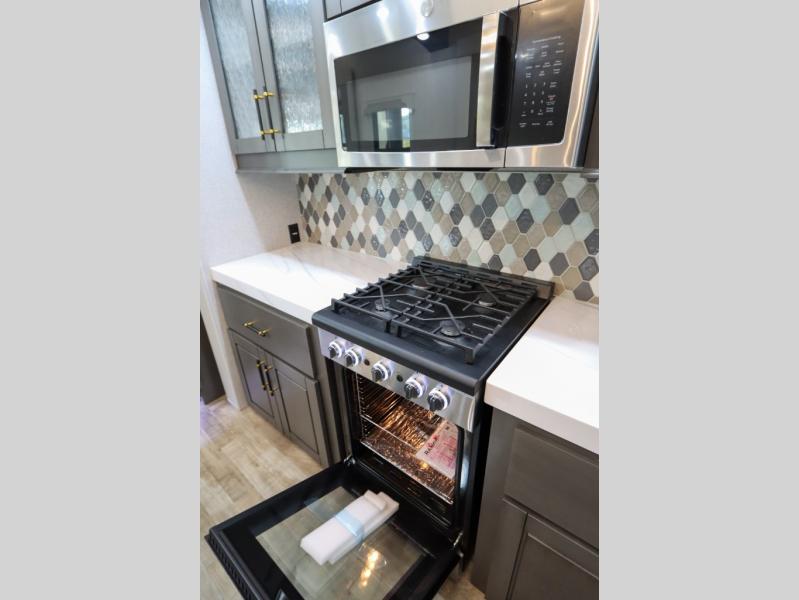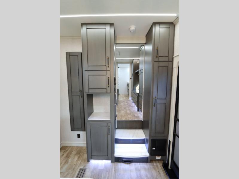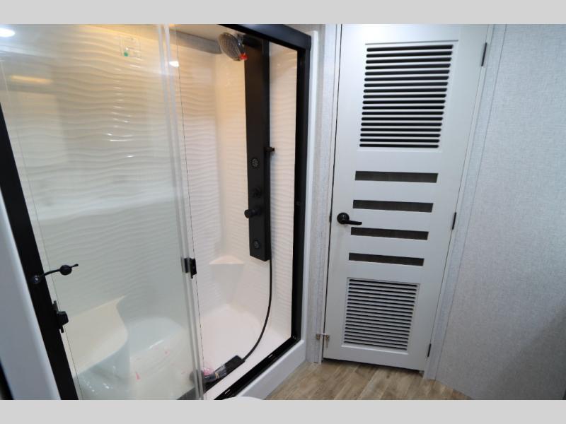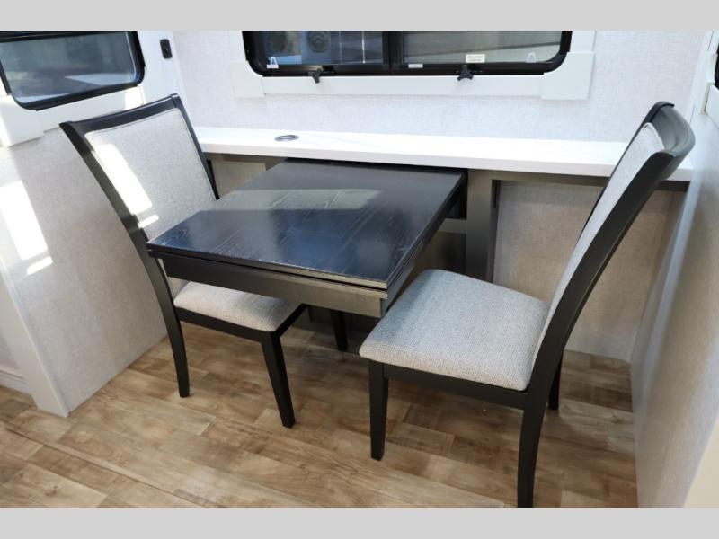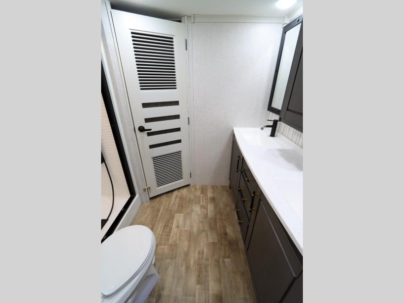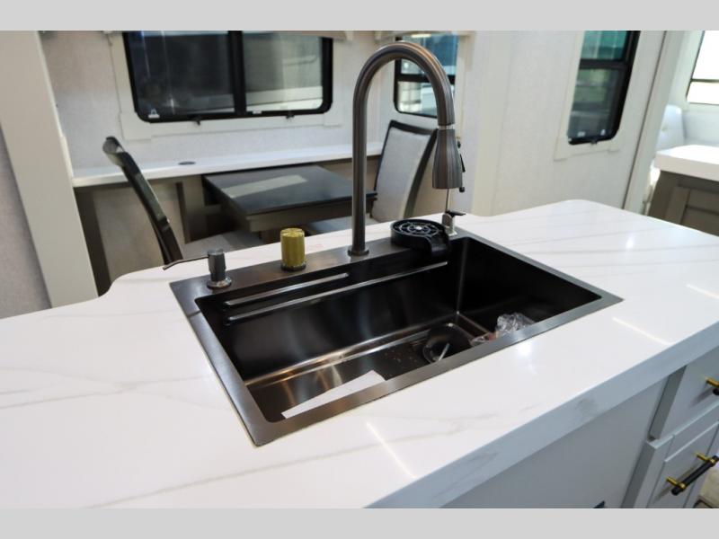One step inside this fifth wheel and you'll be hooked! You'll love the rear kitchen that includes ample countertop for food prep and a slide including the refrigerator, pantry and microwave for added moving around space. Head to the main living area where you can enjoy some family time on the theater seats, and the dinette with chairs will be the perfect place for a game of cards. The half bath is right off of this room for convenience, and your guests or kids can convert the tri-fold sofa into a bed for sleeping space at night. You will love the master bedroom with a king bed slide out, a dresser with a flip-up lid, plus a 39" TV. The front full bath is super spacious, and it includes a large walk-in wardrobe where you can even add an optional washer and dryer if you choose!
