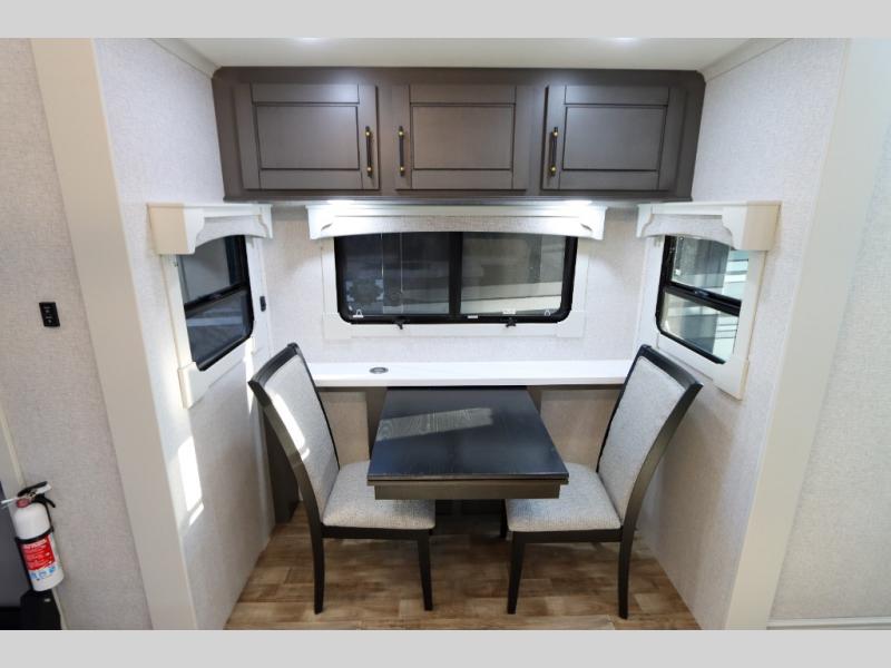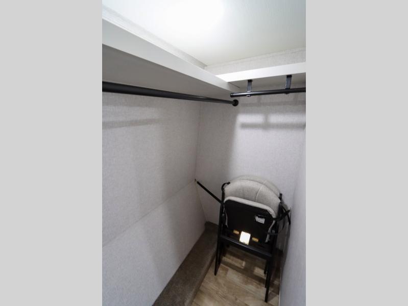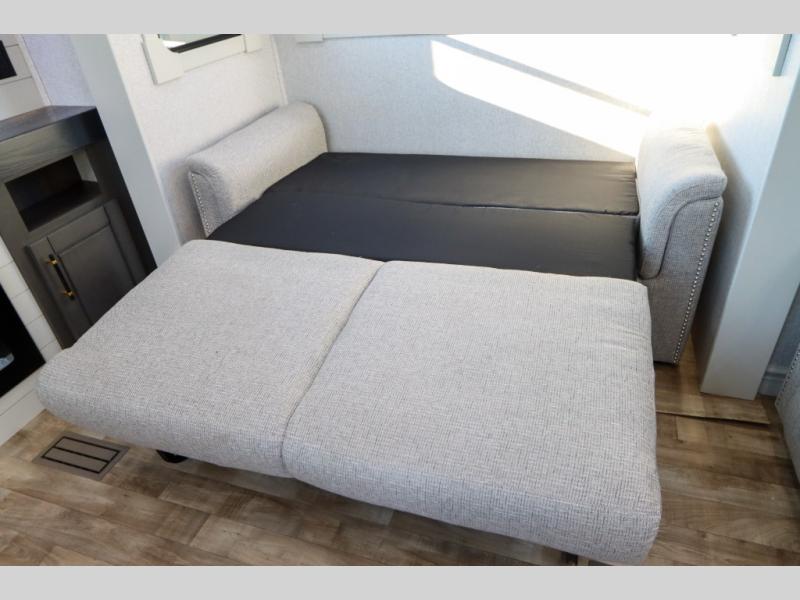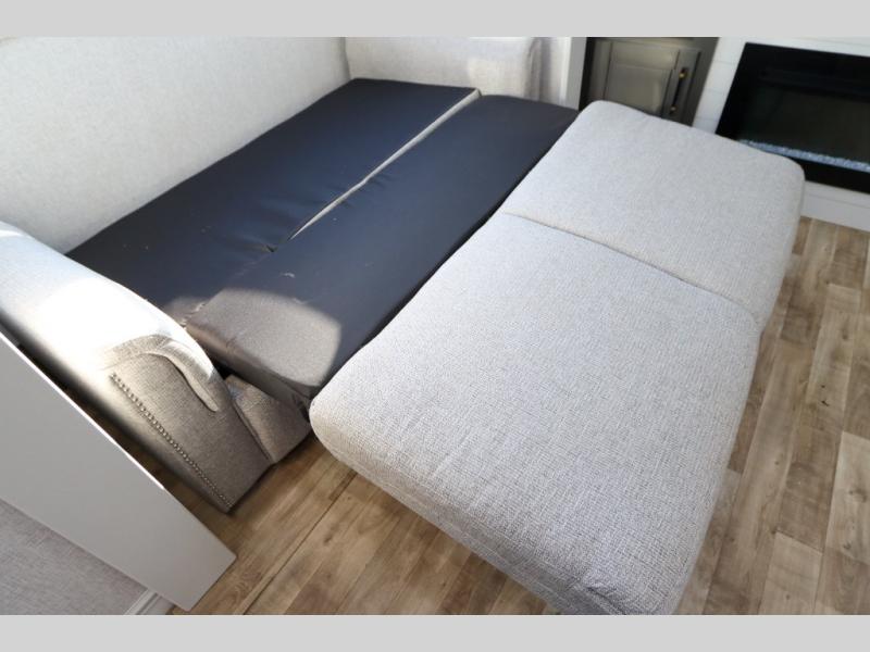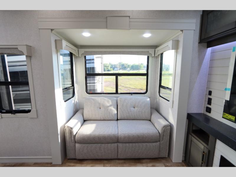 You are going to wish you found the Redwood fifth wheels sooner! With all of the residential comfort and modern luxury, you will be impressed. The Williamsburg Furniture Collection includes two premium dinette chairs, a buffet-style adjustable dinette with leaf extension, a residential-style sofa, and powered theater seating. The luxury further extends to the bedroom where you will find a gel-foam king bed with tilt and C-PAP shelves on both sides of the bed. The straight roof line gives a luxury profile, and there are preparations for a wireless backup camera as well as solar power. The seamless residential insulated heat ducts will efficiently heat your unit, and there is an exterior radio in the fully finished and heated pass-through with slat board storage.