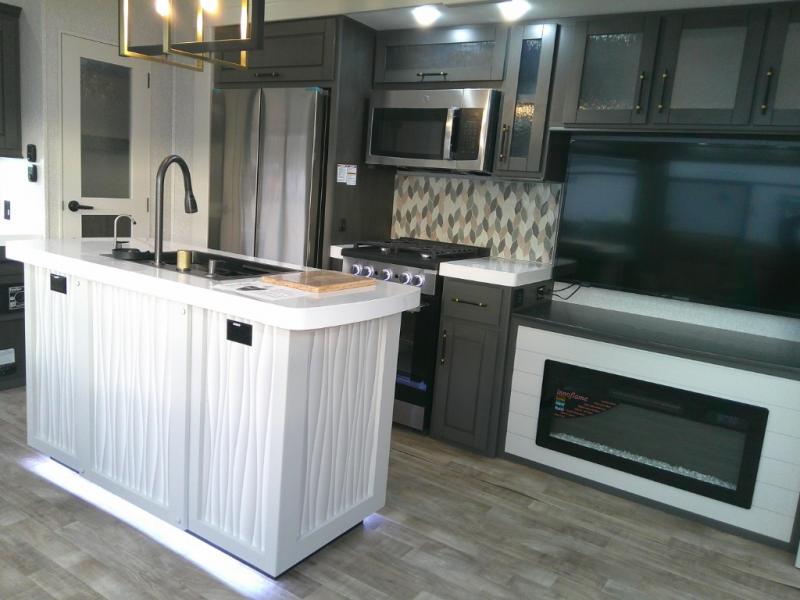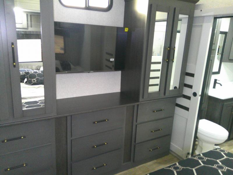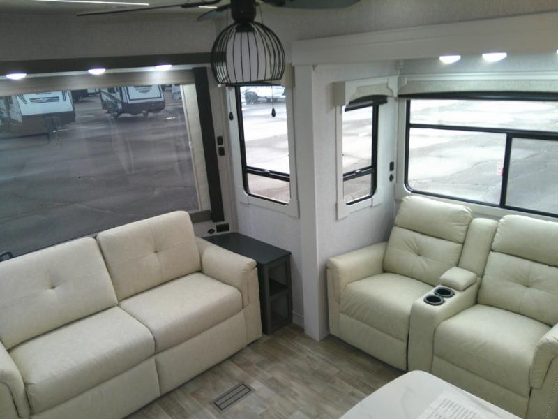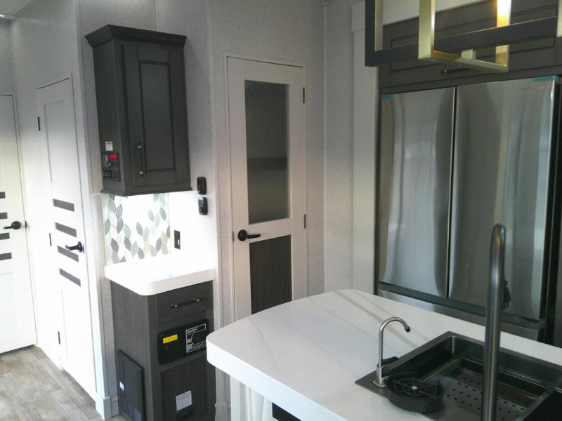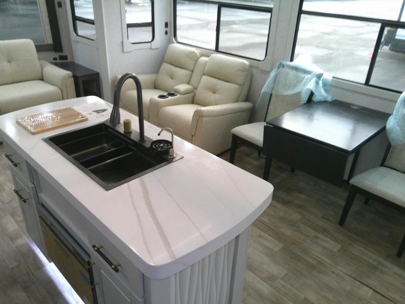You'll love every minute spent in this triple slide out destination trailer! The front living area includes a sofa with end tables plus theater seating directly across from the 50" lift TV for movie nights. The kitchen island will give the chef of your group more space to prep meals, and everyone can dine at the free-standing table with chairs and a bench. A pantry and 18 cu. ft. residential refrigerator will allow you to keep food stocked, and the mid-coach half bath will be easily accessible for everyone to use. Head to the master bedroom to relax on the king bed slide, grab some PJs from the dual wardrobes, then clean up in the full rear bath. You'll find a spacious 48" shower here, storage space, plus dual bath sinks so you both can get ready for bed at the same time; how convenient!
