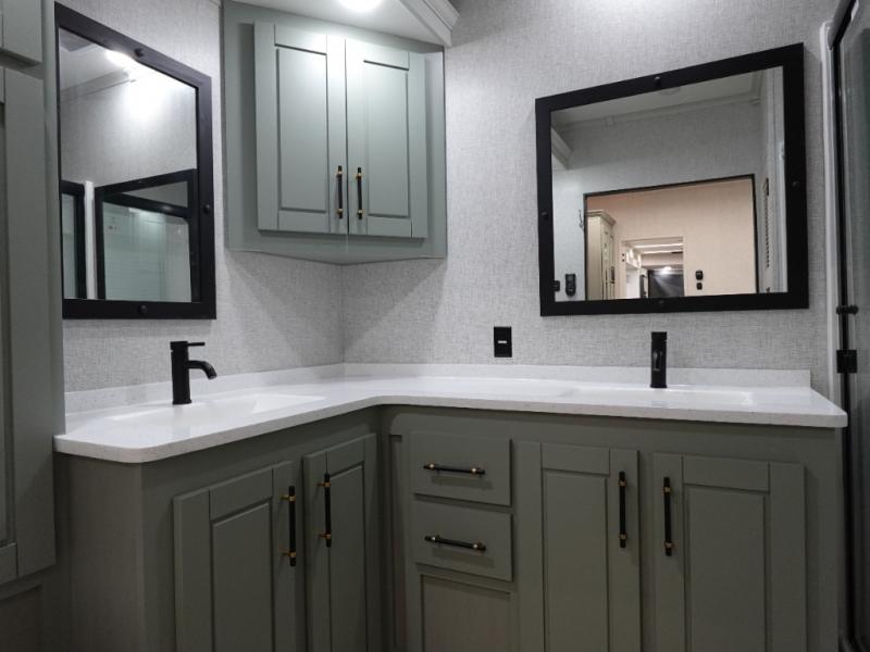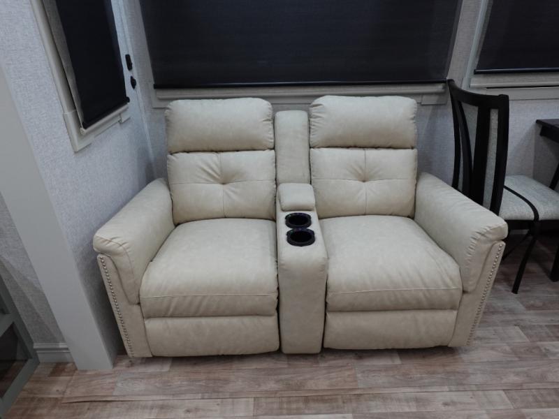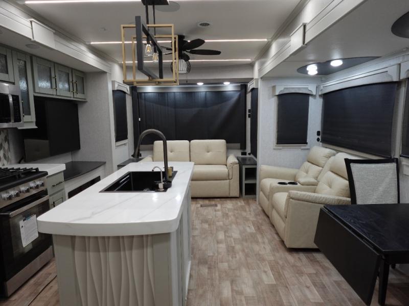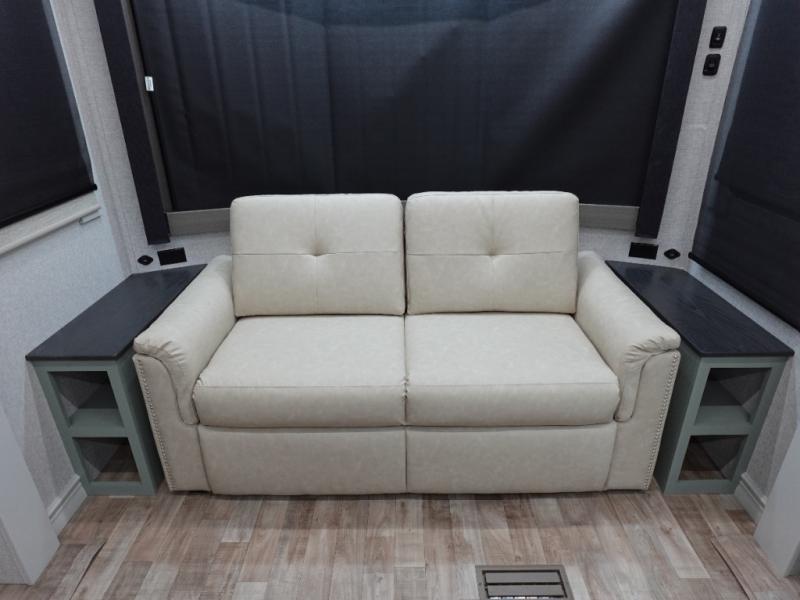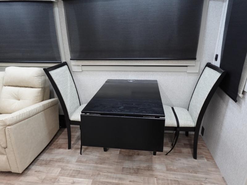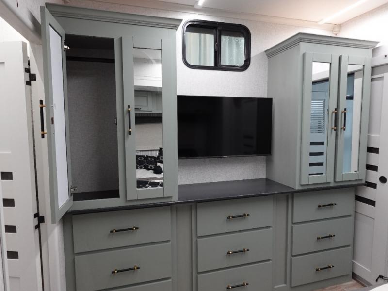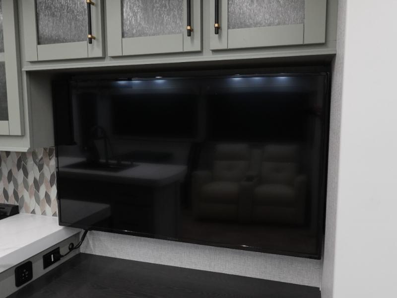 You'll love every minute spent in this triple slide out destination trailer! The front living area includes a sofa with end tables plus theater seating directly across from the 50" lift TV for movie nights. The kitchen island will give the chef of your group more space to prep meals, and everyone can dine at the free-standing table with chairs and a bench. A pantry and 18 cu. ft. residential refrigerator will allow you to keep food stocked, and the mid-coach half bath will be easily accessible for everyone to use. Head to the master bedroom to relax on the king bed slide, grab some PJs from the dual wardrobes, then clean up in the full rear bath. You'll find a spacious 48" shower here, storage space, plus dual bath sinks so you both can get ready for bed at the same time; how convenient!