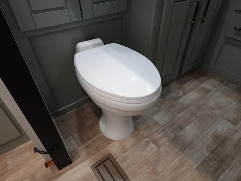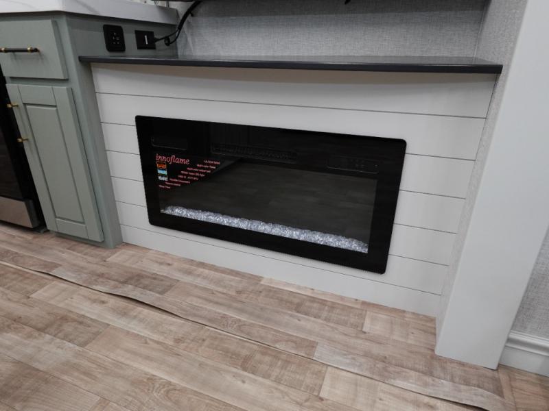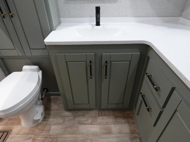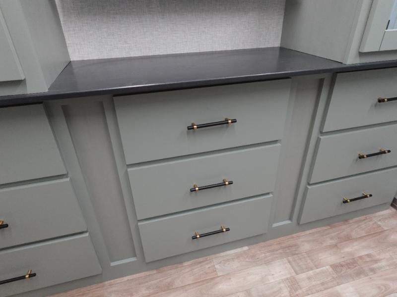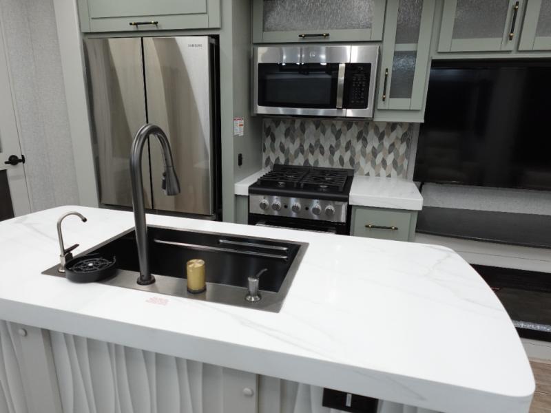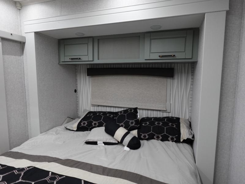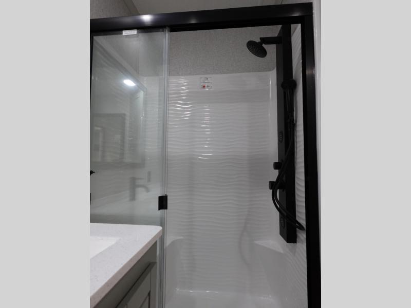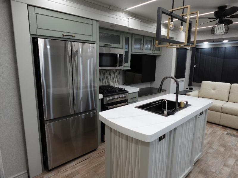 You'll love every minute spent in this triple slide out destination trailer! The front living area includes a sofa with end tables plus theater seating directly across from the 50" lift TV for movie nights. The kitchen island will give the chef of your group more space to prep meals, and everyone can dine at the free-standing table with chairs and a bench. A pantry and 18 cu. ft. residential refrigerator will allow you to keep food stocked, and the mid-coach half bath will be easily accessible for everyone to use. Head to the master bedroom to relax on the king bed slide, grab some PJs from the dual wardrobes, then clean up in the full rear bath. You'll find a spacious 48" shower here, storage space, plus dual bath sinks so you both can get ready for bed at the same time; how convenient!