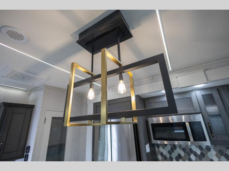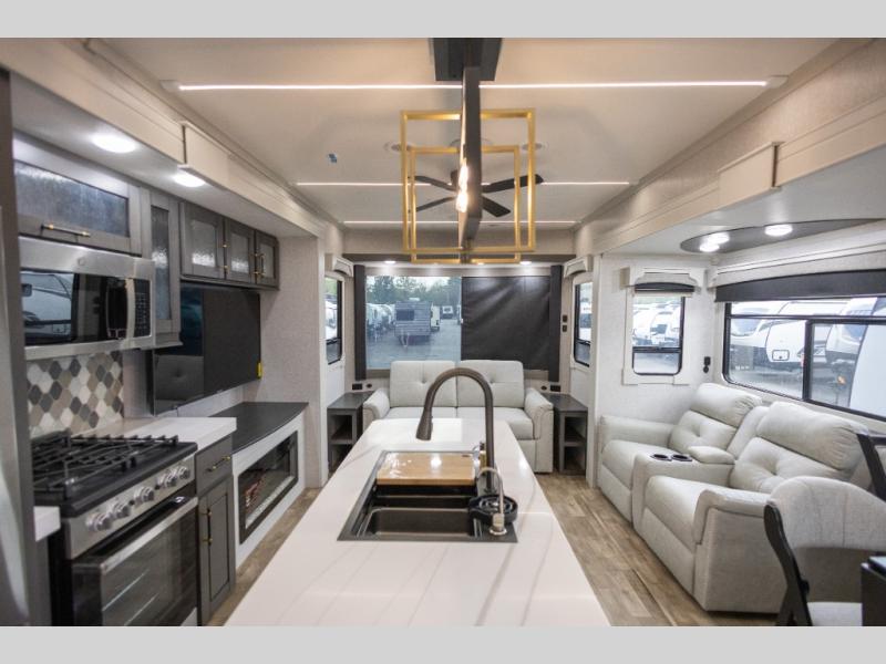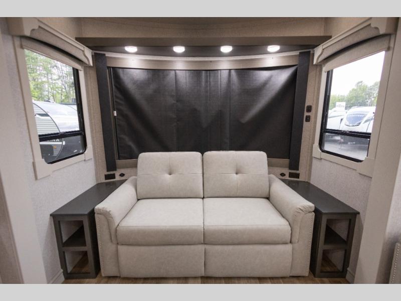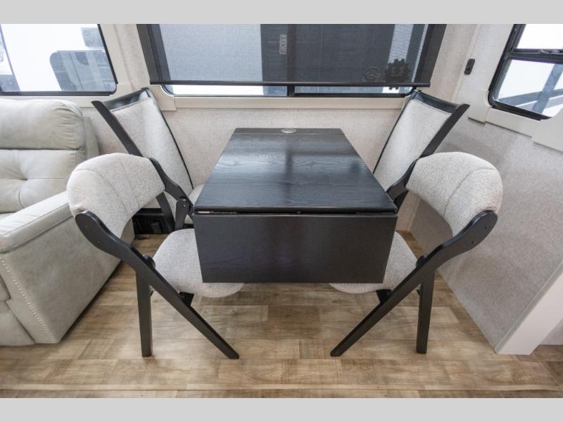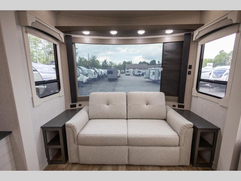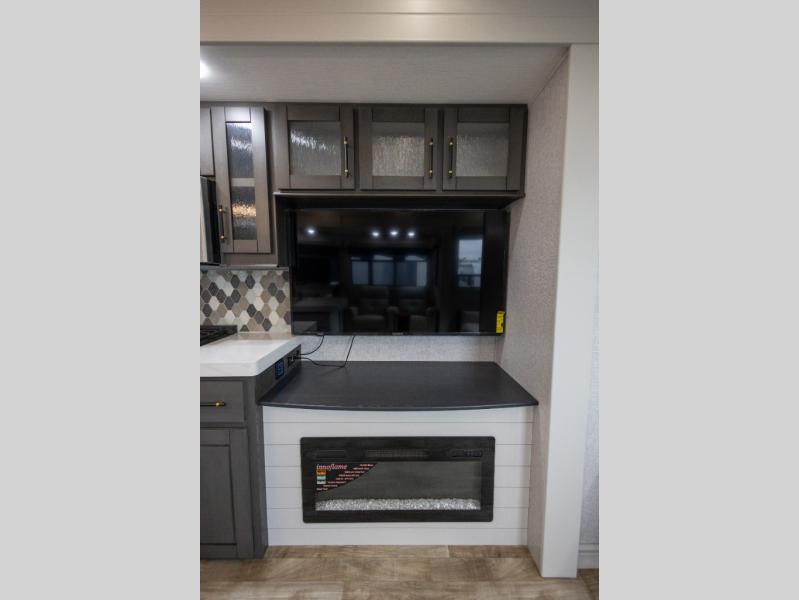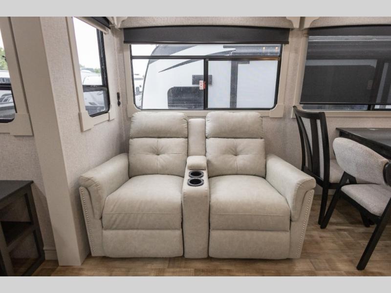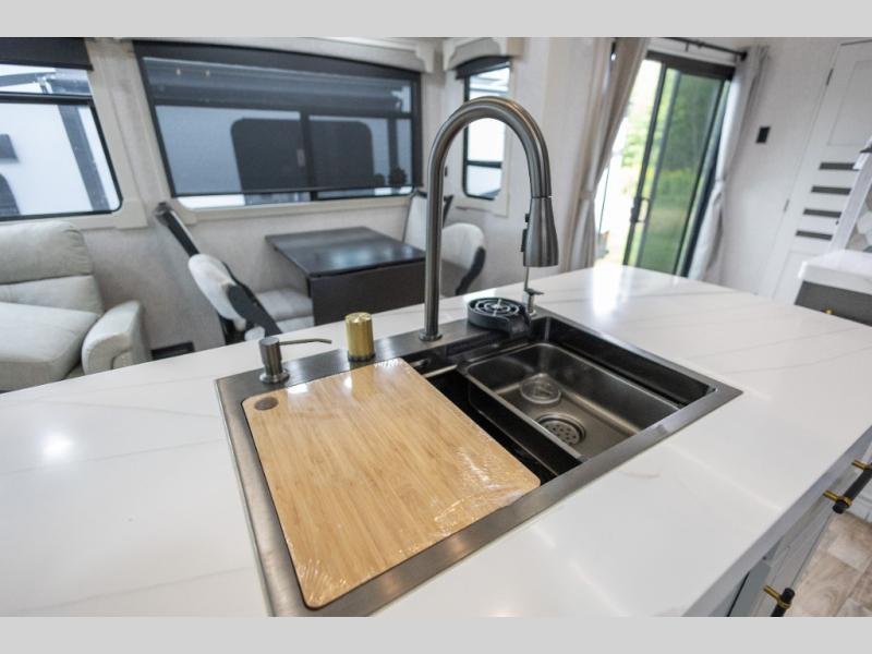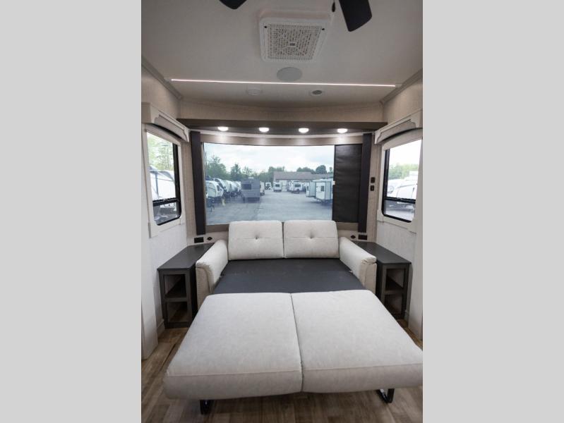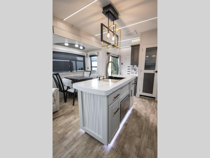You'll love every minute spent in this triple slide out destination trailer! The front living area includes a sofa with end tables plus theater seating directly across from the 50" lift TV for movie nights. The kitchen island will give the chef of your group more space to prep meals, and everyone can dine at the free-standing table with chairs and a bench. A pantry and 18 cu. ft. residential refrigerator will allow you to keep food stocked, and the mid-coach half bath will be easily accessible for everyone to use. Head to the master bedroom to relax on the king bed slide, grab some PJs from the dual wardrobes, then clean up in the full rear bath. You'll find a spacious 48" shower here, storage space, plus dual bath sinks so you both can get ready for bed at the same time; how convenient!
