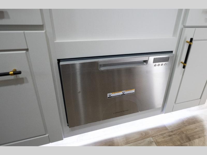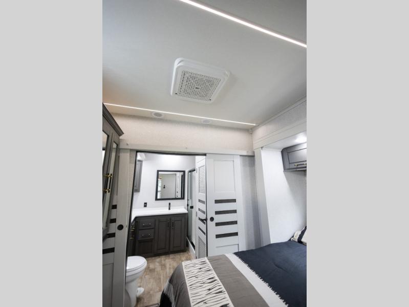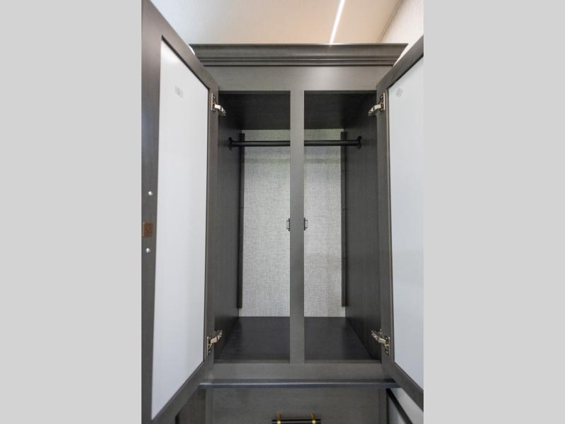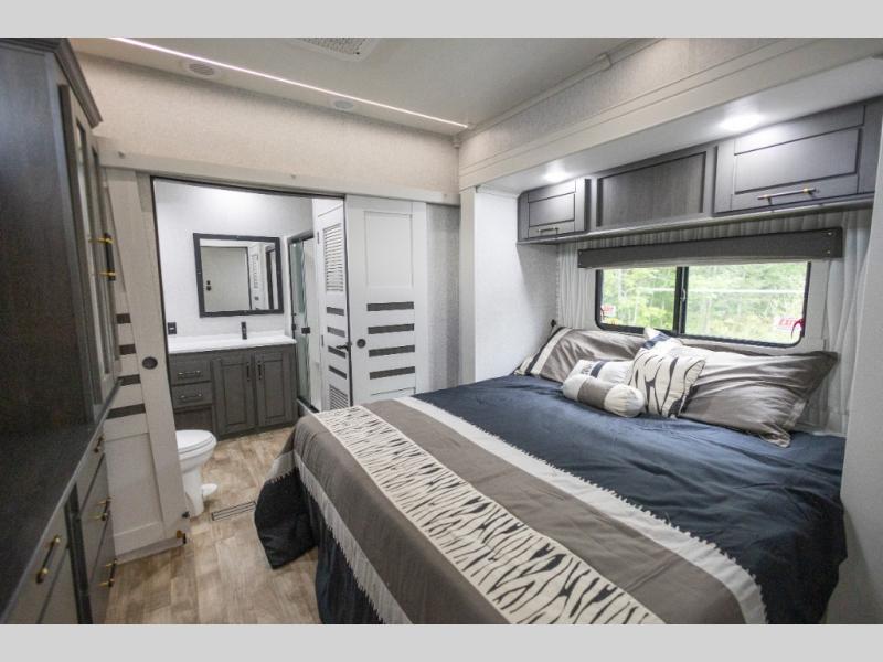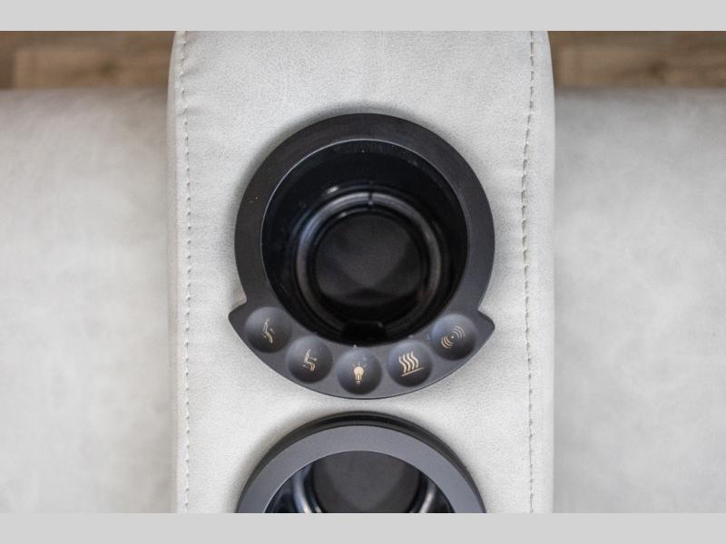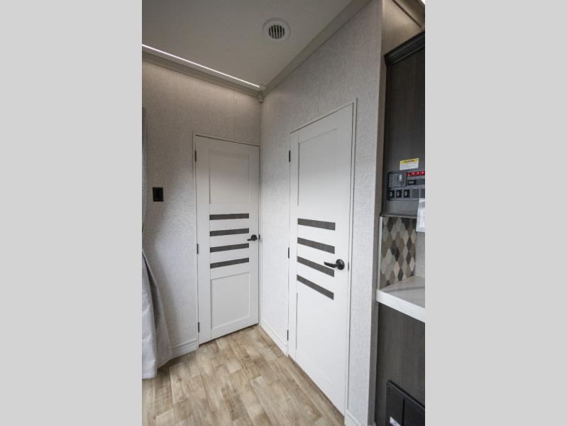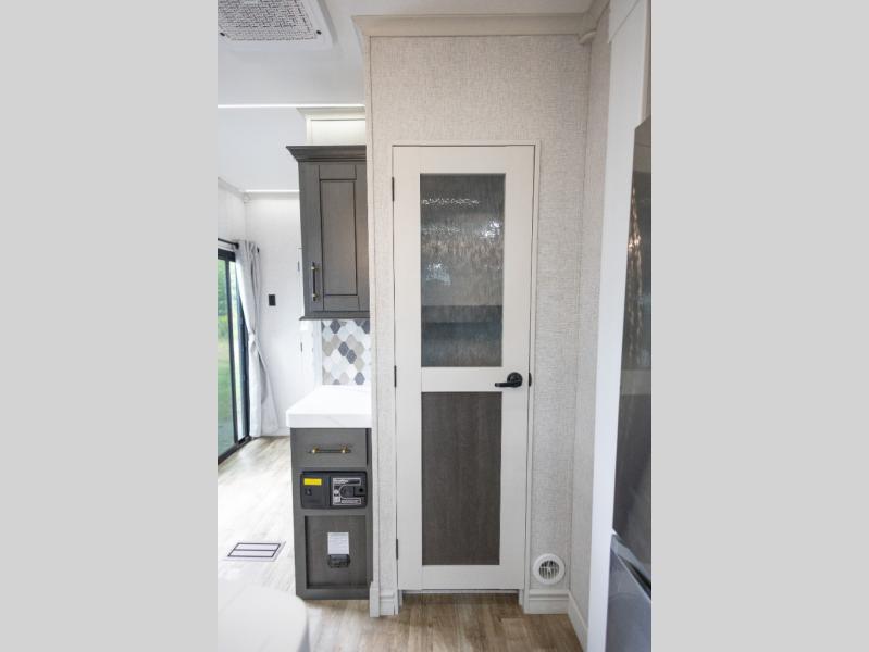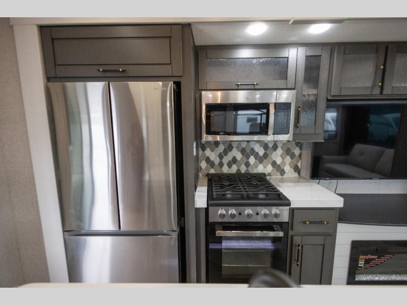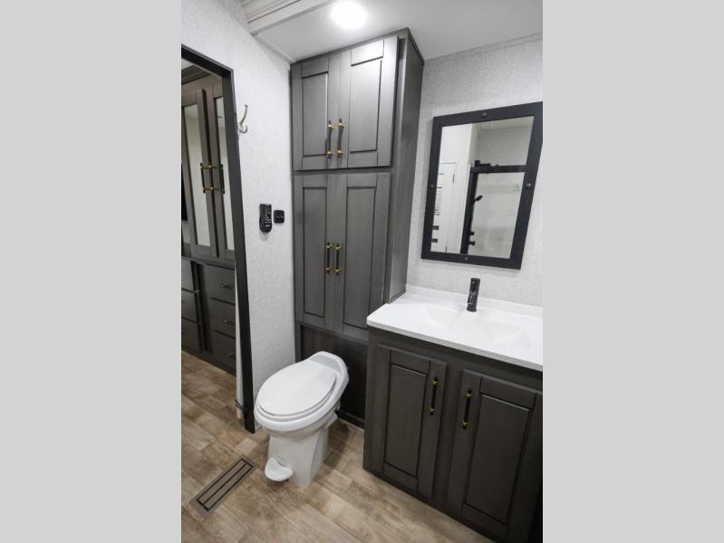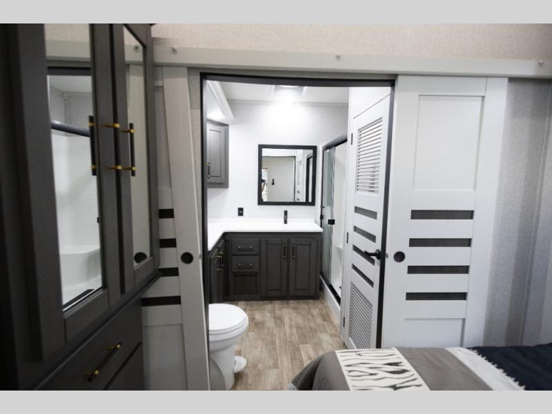 You'll love every minute spent in this triple slide out destination trailer! The front living area includes a sofa with end tables plus theater seating directly across from the 50" lift TV for movie nights. The kitchen island will give the chef of your group more space to prep meals, and everyone can dine at the free-standing table with chairs and a bench. A pantry and 18 cu. ft. residential refrigerator will allow you to keep food stocked, and the mid-coach half bath will be easily accessible for everyone to use. Head to the master bedroom to relax on the king bed slide, grab some PJs from the dual wardrobes, then clean up in the full rear bath. You'll find a spacious 48" shower here, storage space, plus dual bath sinks so you both can get ready for bed at the same time; how convenient!