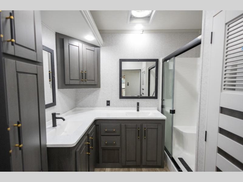 With any Regency destination trailer by Redwood RV, you will find it easier than ever to enjoy extended stays at the location of your choice. Each model is built with a Z-65 true gel coat fiberglass exterior, a fully walkable roof with one-piece Alpha-Ply roof material, and a 12" custom I-beam chassis for a strong foundation. There are also enclosed and heated water lines outside, along with wireless backup camera prep, a front insulated fiberglass cap, and dual pane windows. You'll love the standard Parks Package that includes USB ports throughout and a Winegard 360 to stay connected as you camp, plus a central vacuum and custom hardwood cabinet doors for that added touch of home! The Full-Time Living Package also comes standard and includes a multi-functional stainless steel sink, linoleum throughout, a dedicated garbage cabinet, and a power vent in the bathroom to name a few conveniences!