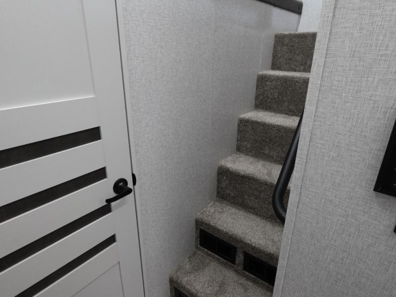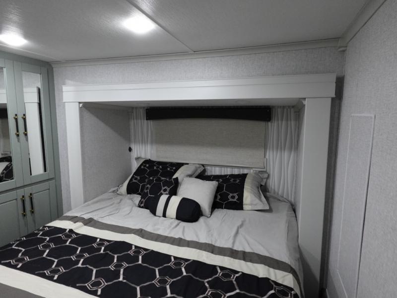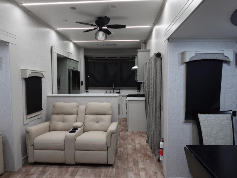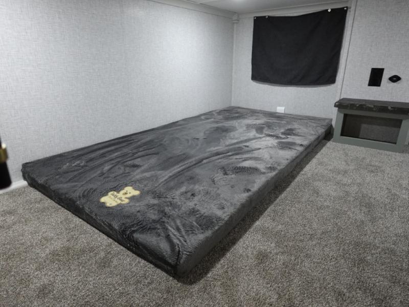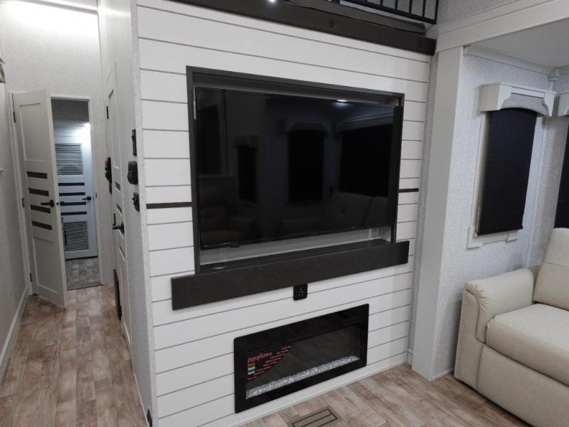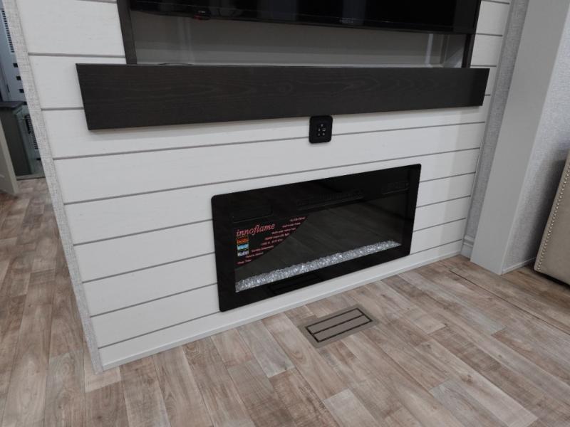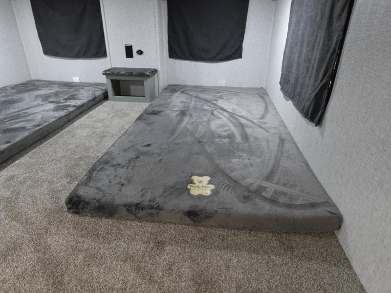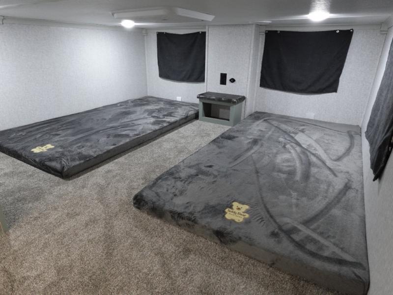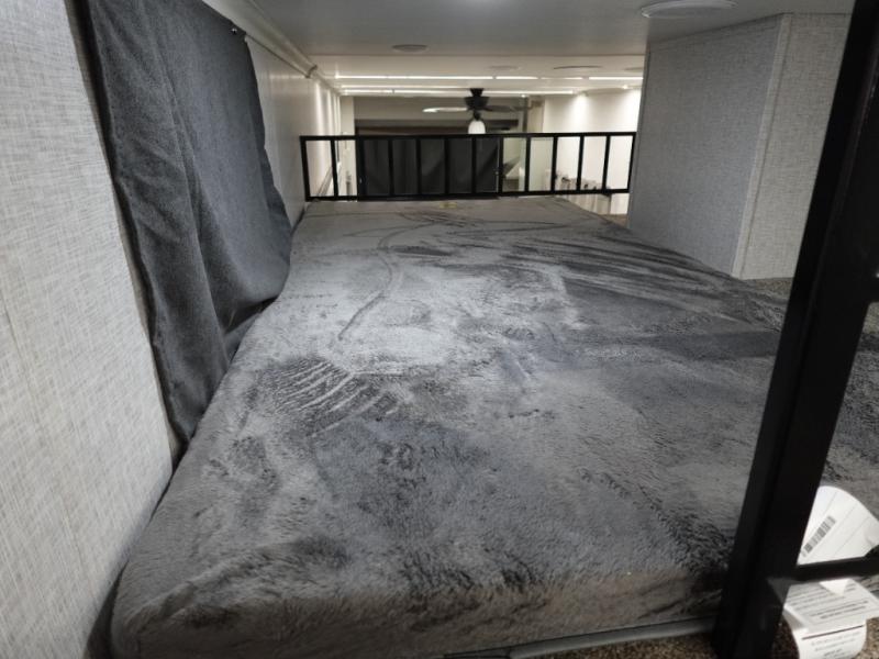 If you are looking for a destination trailer with more space and a larger sleeping capacity, this is the one! There are double loft areas; one above the bedroom with dual bunk mats and one above the bedroom with a third bunk mat. You'll find the rear bedroom ultra inviting with its king bed slide out, entertainment center with a 39" TV, plus a wardrobe and dresser to keep your things organized. If you have any other guests, they can sleep on the 72" sofa in the middle living area. There is also theater seating here, a ceiling fan, plus a fireplace and 50" TV. And the free-standing table with chairs and a bench provides a place to dine and play games in the evening. Head to the front kitchen where you'll find generous counter space, a bar top with two stools, and all the kitchen appliances to create your best meals!