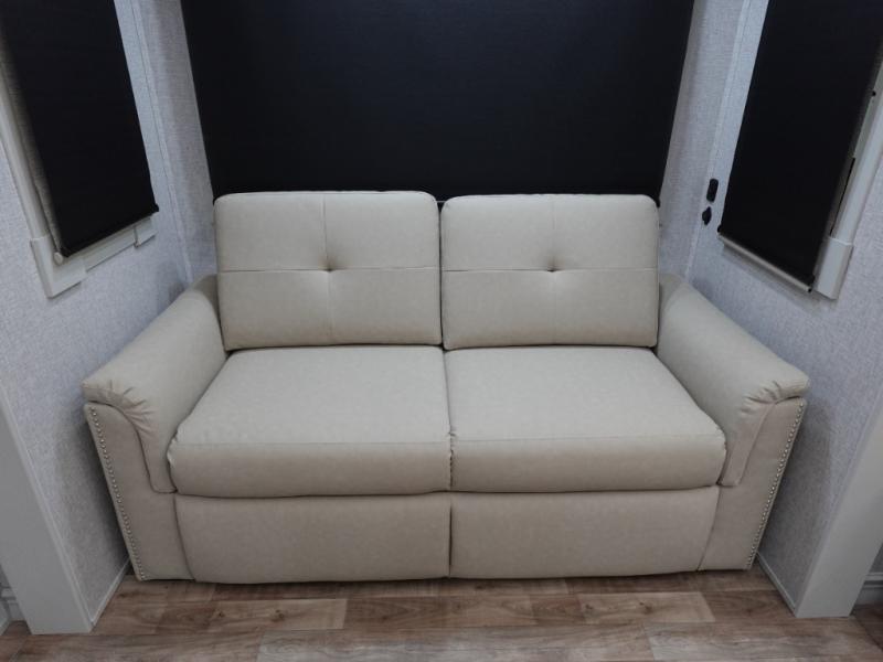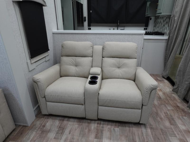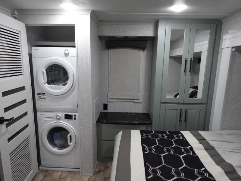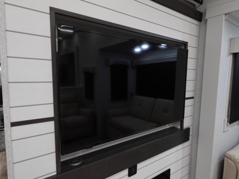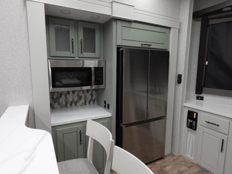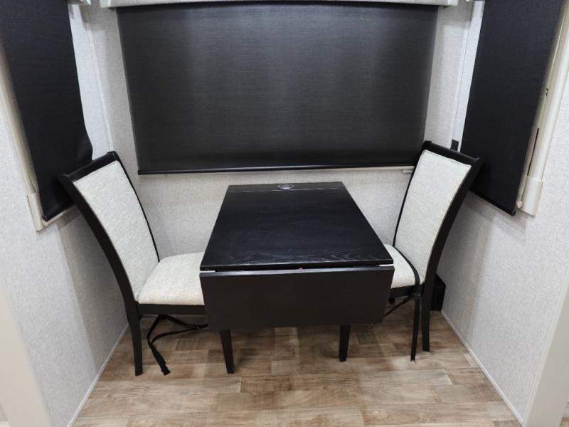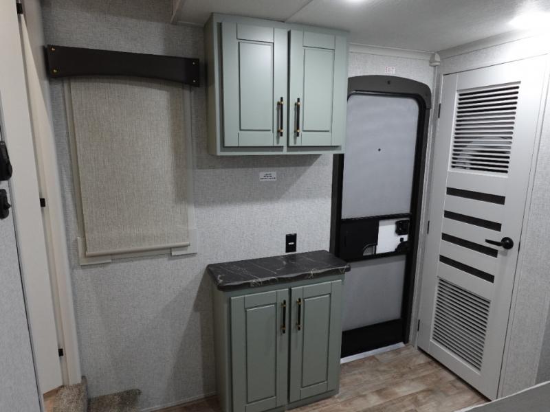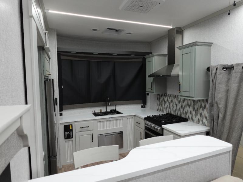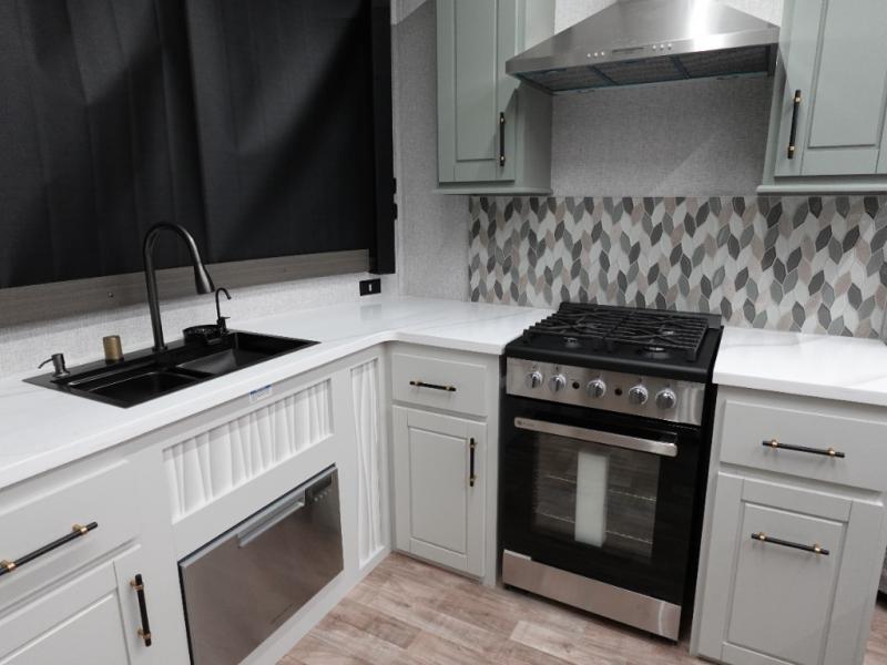 If you are looking for a destination trailer with more space and a larger sleeping capacity, this is the one! There are double loft areas; one above the bedroom with dual bunk mats and one above the bedroom with a third bunk mat. You'll find the rear bedroom ultra inviting with its king bed slide out, entertainment center with a 39" TV, plus a wardrobe and dresser to keep your things organized. If you have any other guests, they can sleep on the 72" sofa in the middle living area. There is also theater seating here, a ceiling fan, plus a fireplace and 50" TV. And the free-standing table with chairs and a bench provides a place to dine and play games in the evening. Head to the front kitchen where you'll find generous counter space, a bar top with two stools, and all the kitchen appliances to create your best meals!