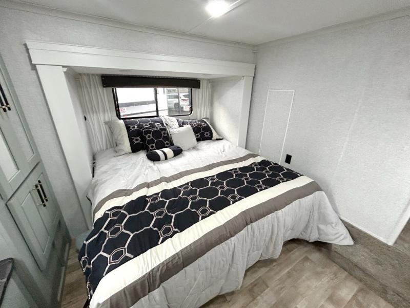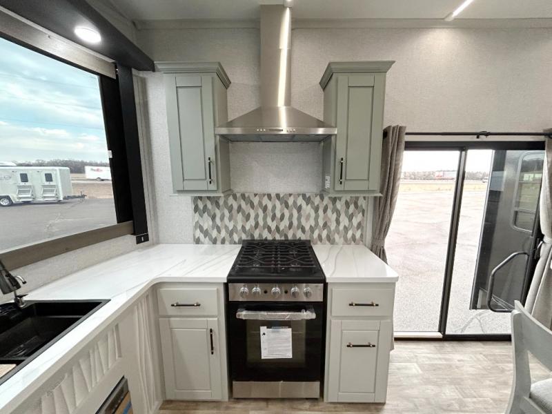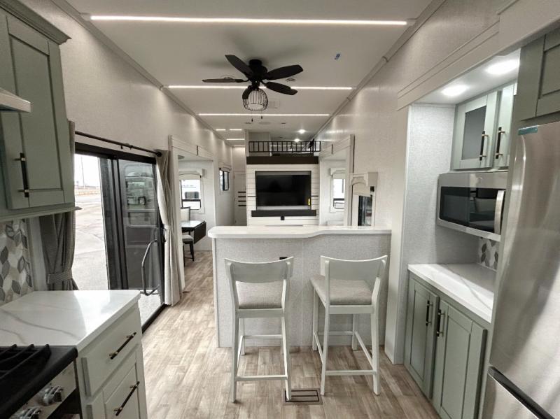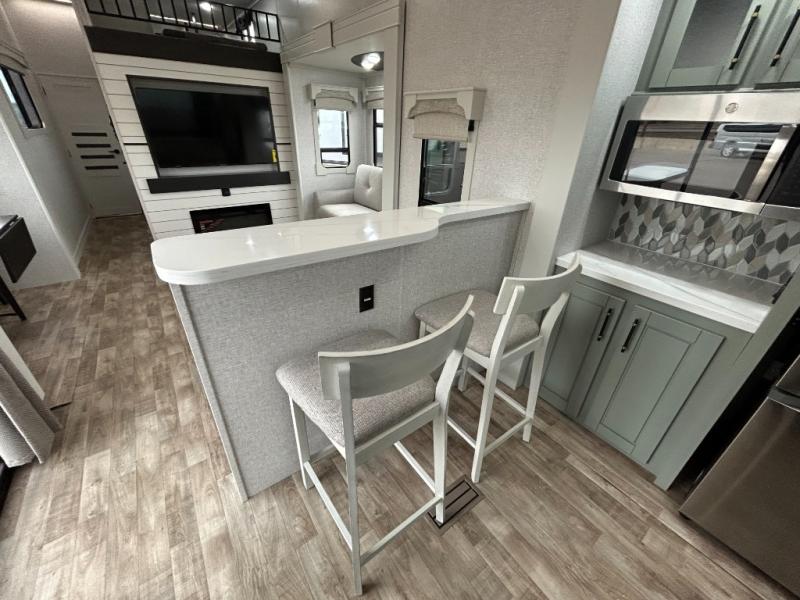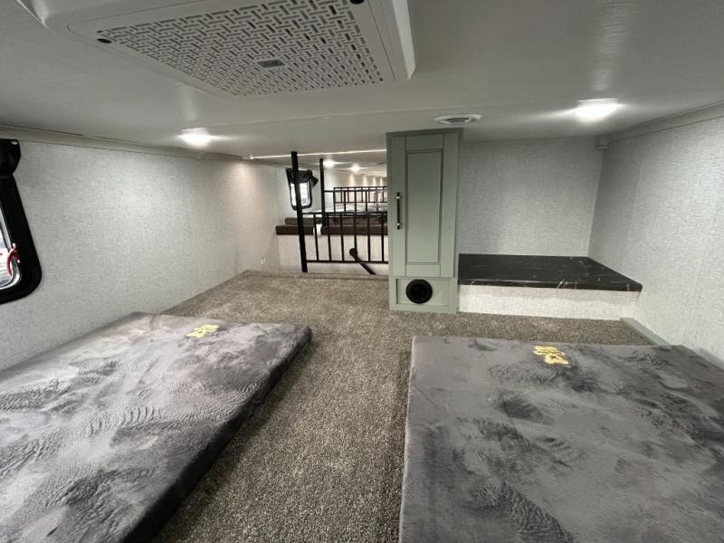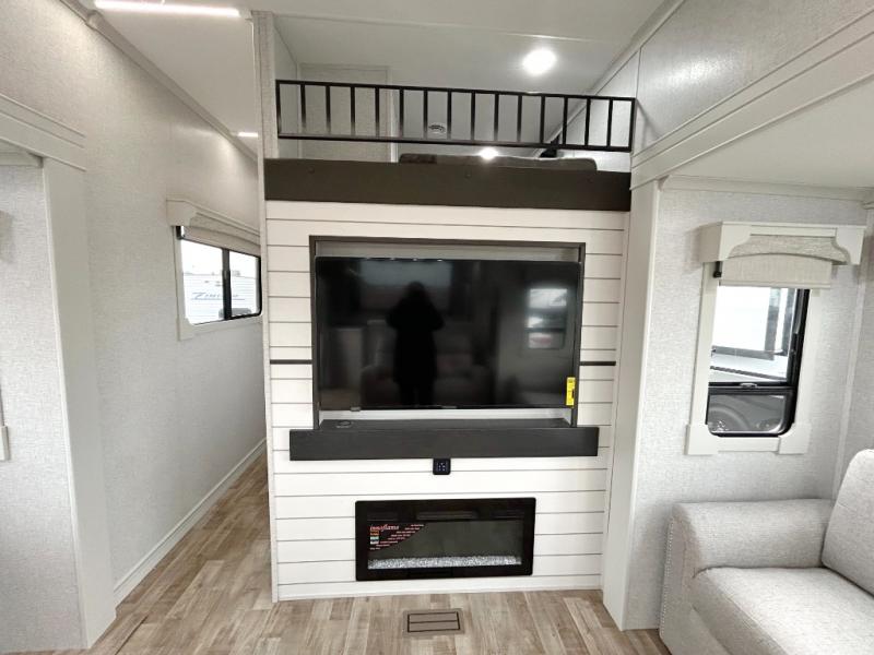 Are you looking for a destination trailer that can fit your whole crew? Look no further than this unit with four slides, three bunk mats in the loft areas, plus a spacious full bath that will allow everyone to stay clean each day. The front kitchen is any chef's dream with its ample counter space, pantry/cabinet, residential four burner range, and residential refrigerator. After dinner is cleaned up, everyone can meet in the middle living area to watch a movie on the 50" TV, and the fireplace here will make it feel more like home.