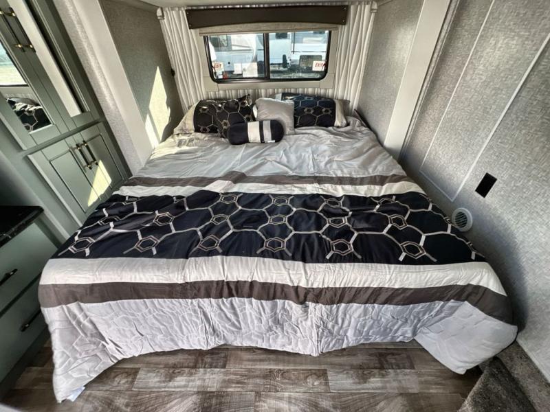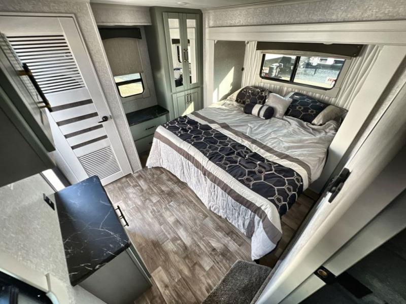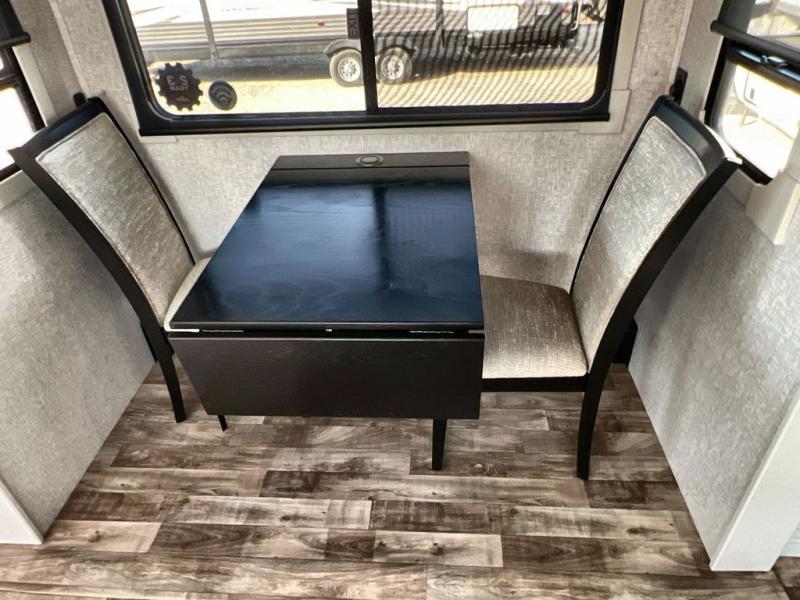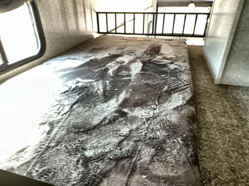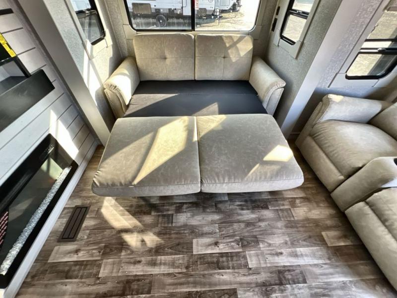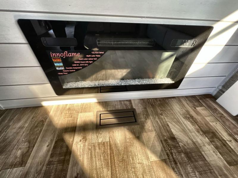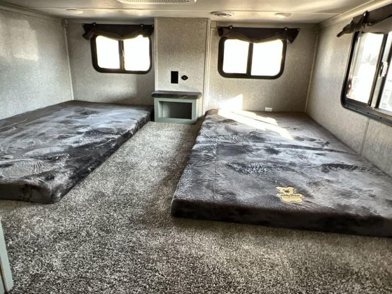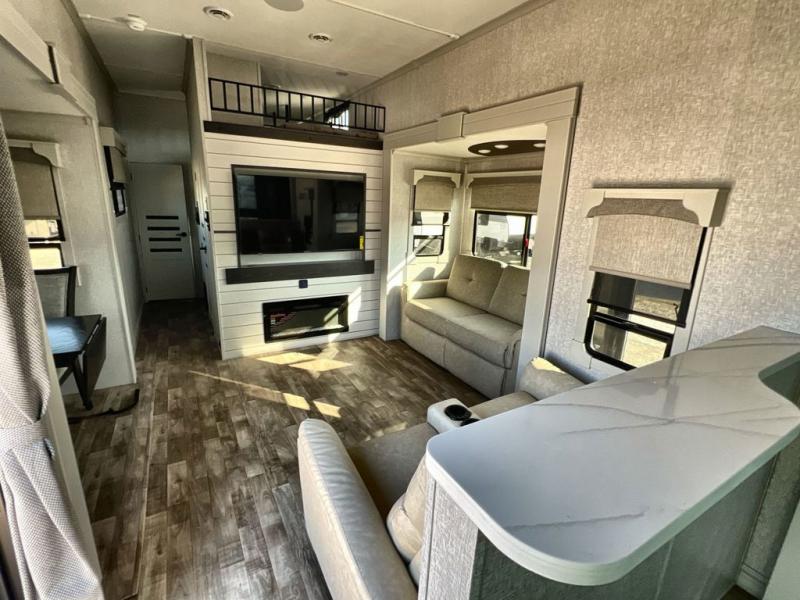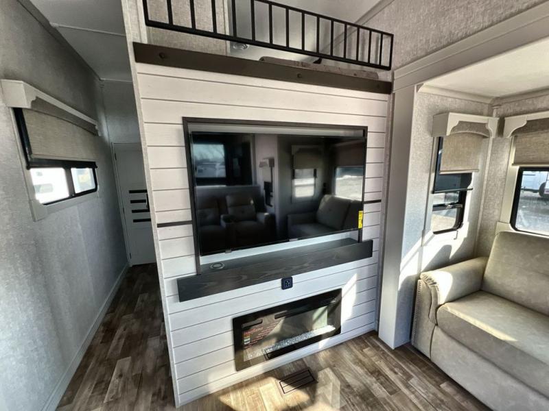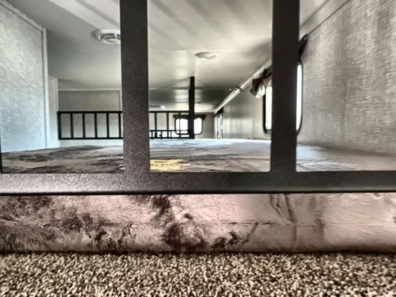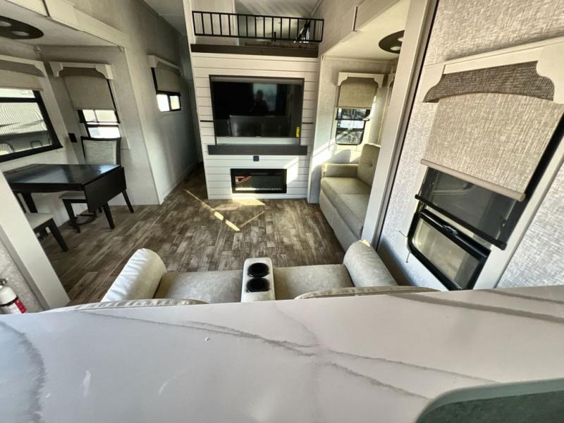 If you are looking for a destination trailer with more space and a larger sleeping capacity, this is the one! There are double loft areas; one above the bedroom with dual bunk mats and one above the bedroom with a third bunk mat. You'll find the rear bedroom ultra inviting with its king bed slide out, entertainment center with a 39" TV, plus a wardrobe and dresser to keep your things organized. If you have any other guests, they can sleep on the 72" sofa in the middle living area. There is also theater seating here, a ceiling fan, plus a fireplace and 50" TV. And the free-standing table with chairs and a bench provides a place to dine and play games in the evening. Head to the front kitchen where you'll find generous counter space, a bar top with two stools, and all the kitchen appliances to create your best meals!