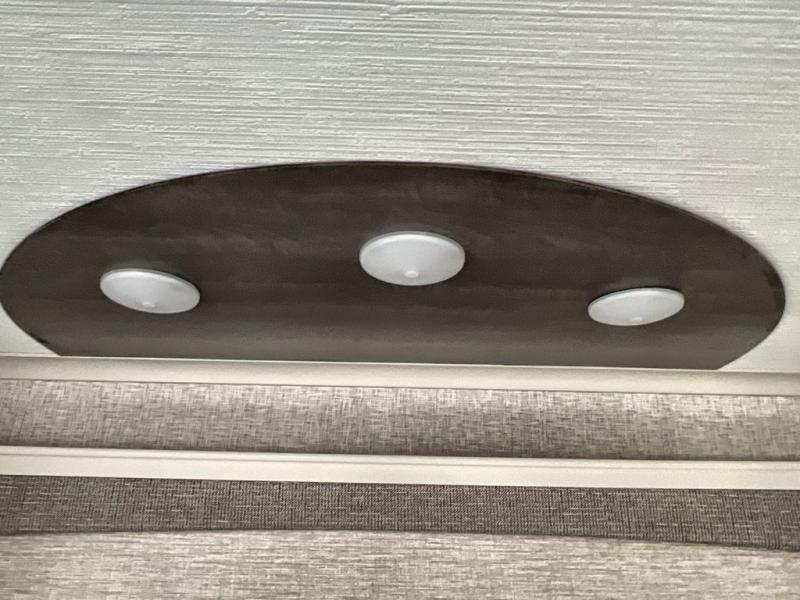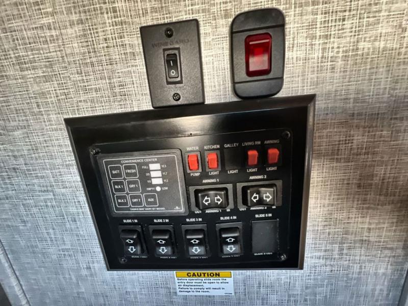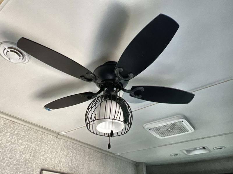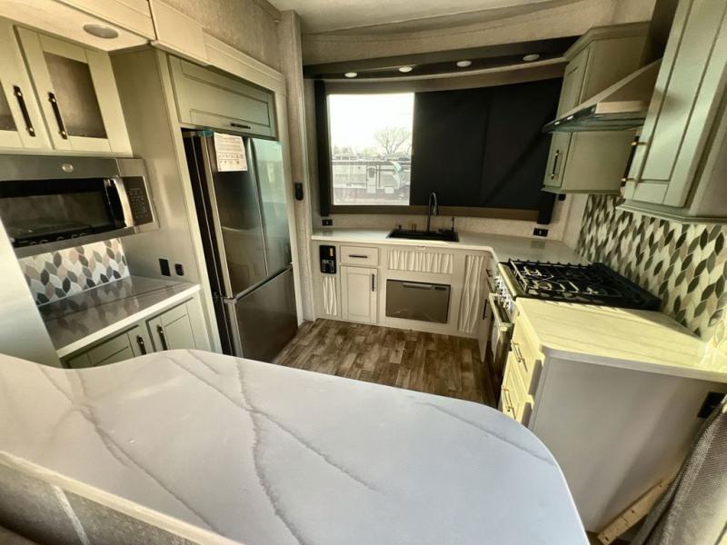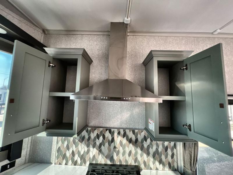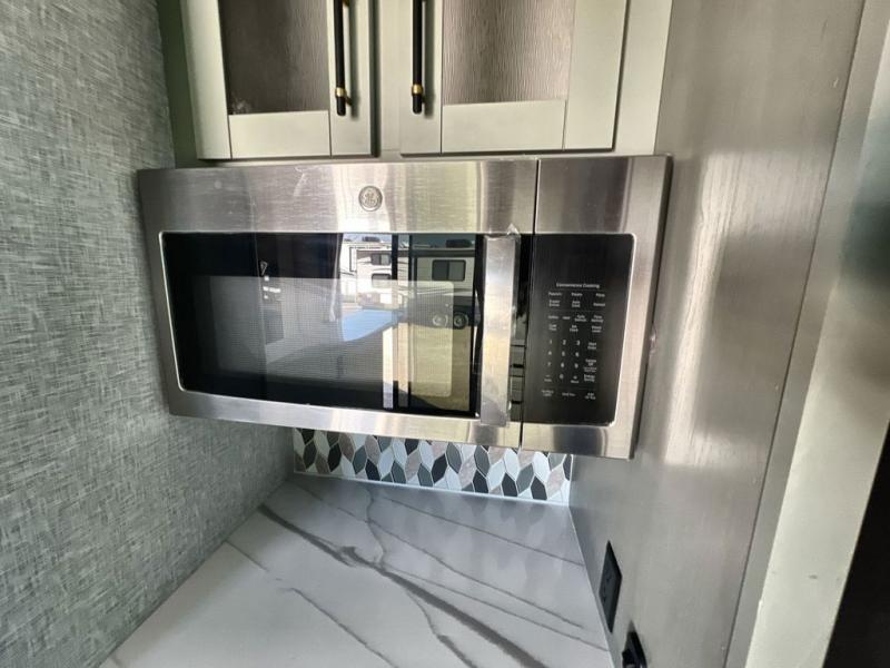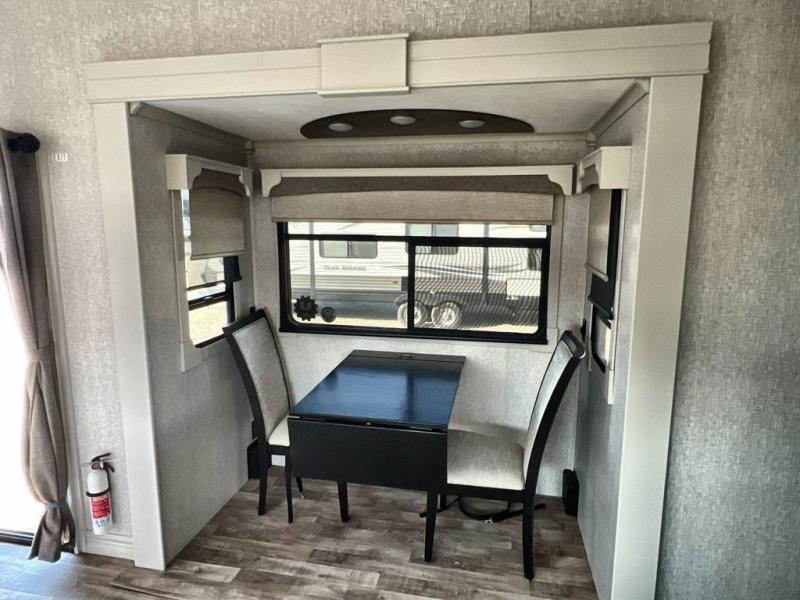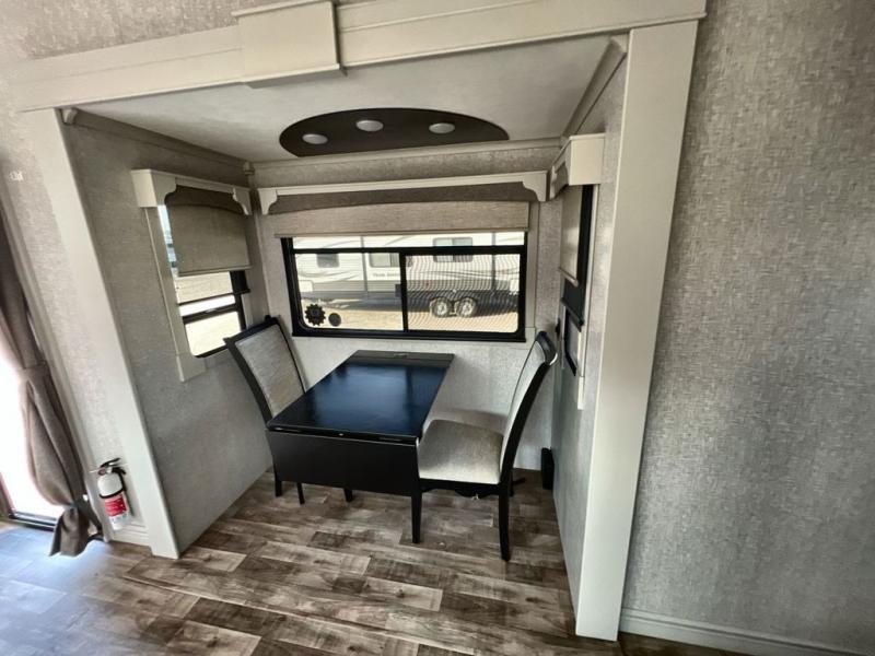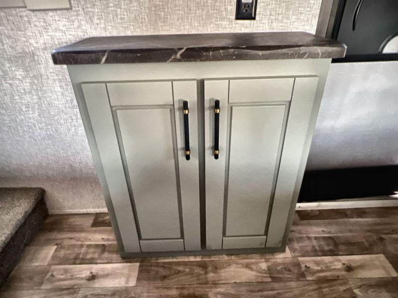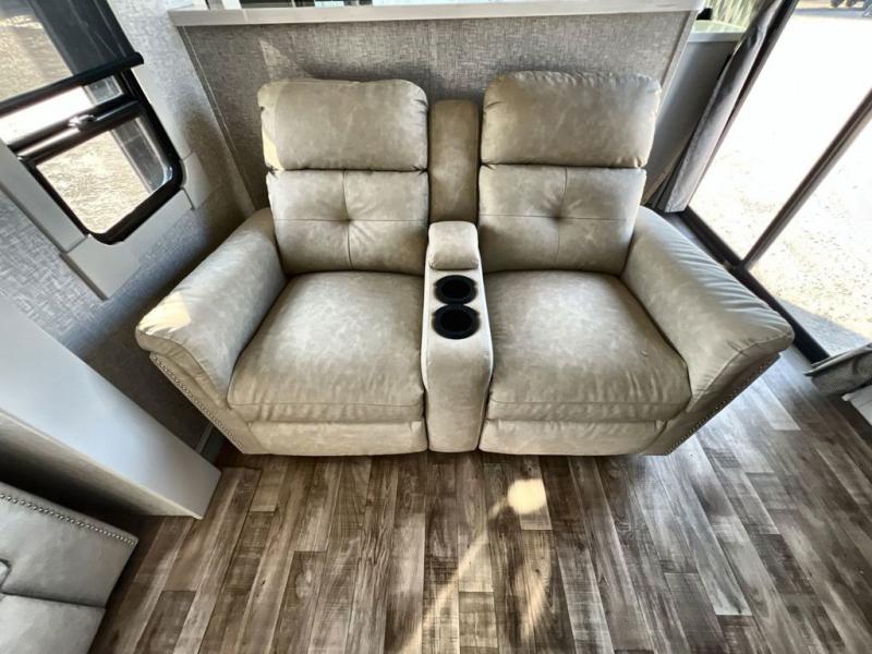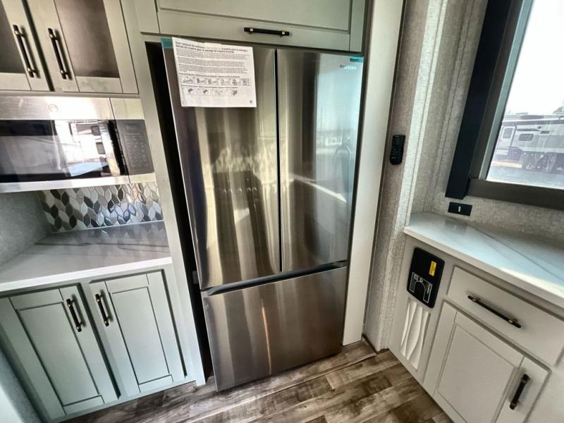 If you are looking for a destination trailer with more space and a larger sleeping capacity, this is the one! There are double loft areas; one above the bedroom with dual bunk mats and one above the bedroom with a third bunk mat. You'll find the rear bedroom ultra inviting with its king bed slide out, entertainment center with a 39" TV, plus a wardrobe and dresser to keep your things organized. If you have any other guests, they can sleep on the 72" sofa in the middle living area. There is also theater seating here, a ceiling fan, plus a fireplace and 50" TV. And the free-standing table with chairs and a bench provides a place to dine and play games in the evening. Head to the front kitchen where you'll find generous counter space, a bar top with two stools, and all the kitchen appliances to create your best meals!