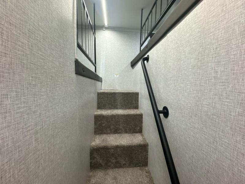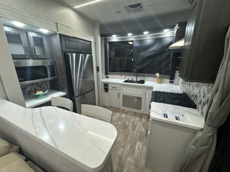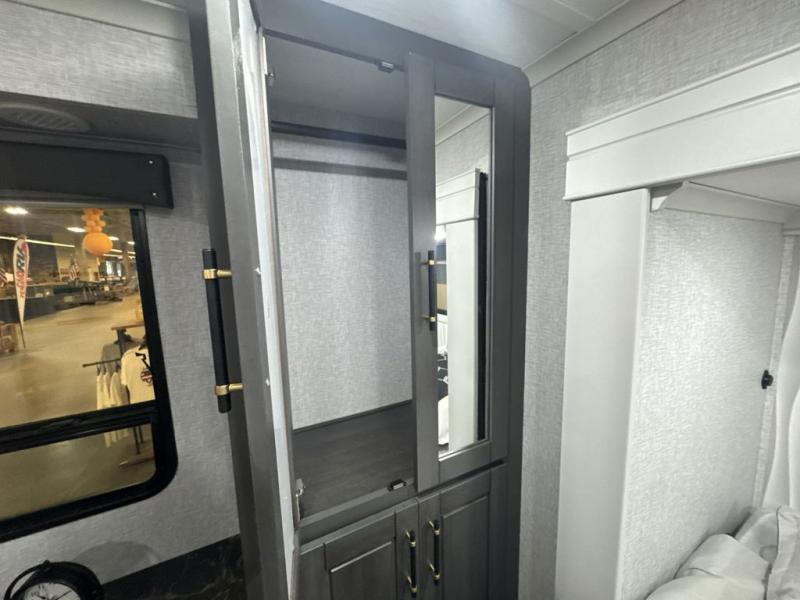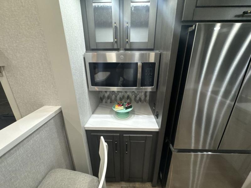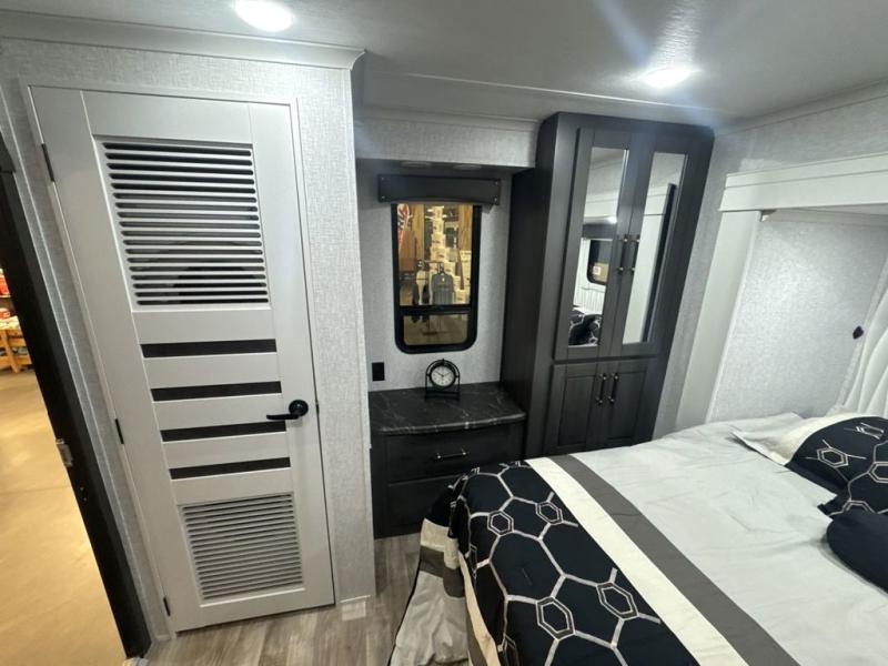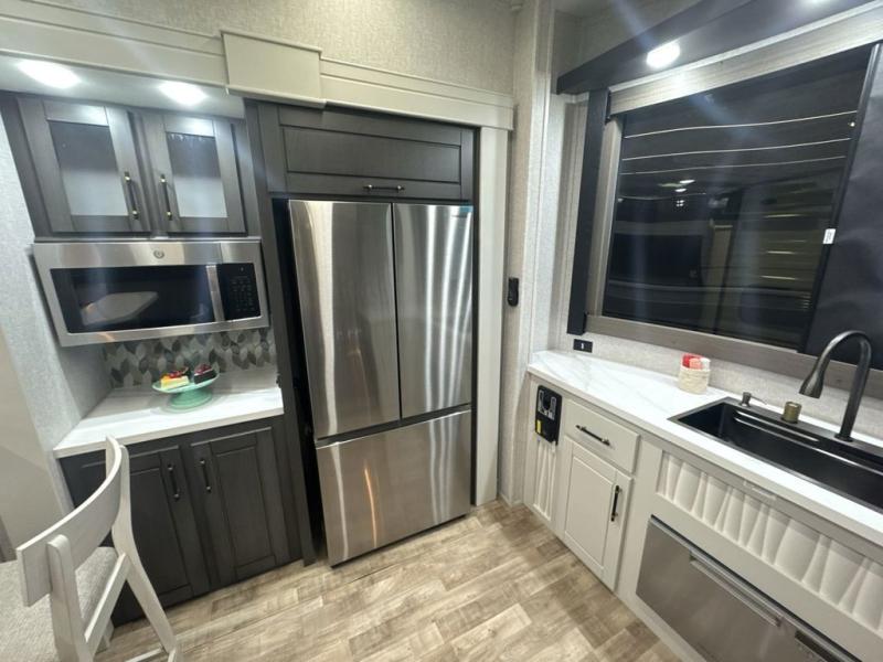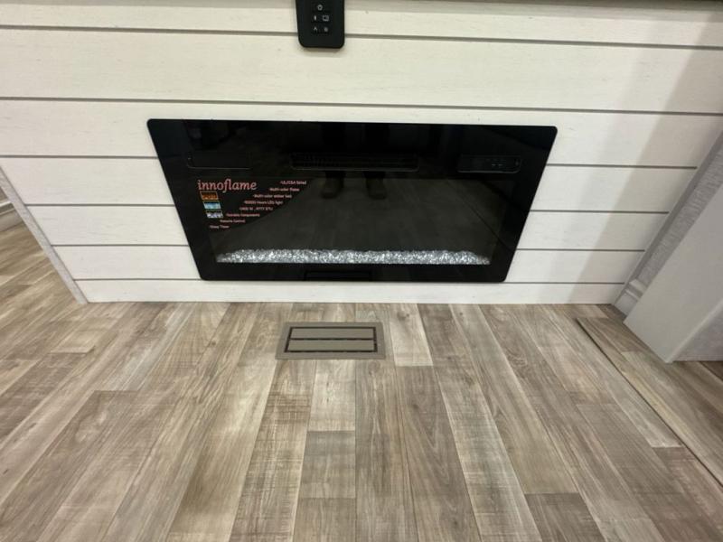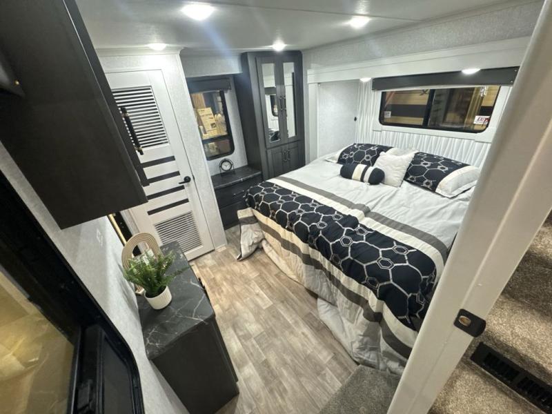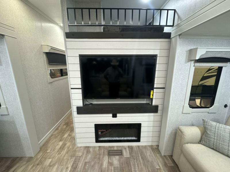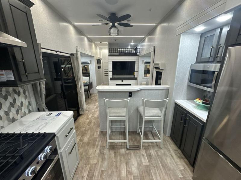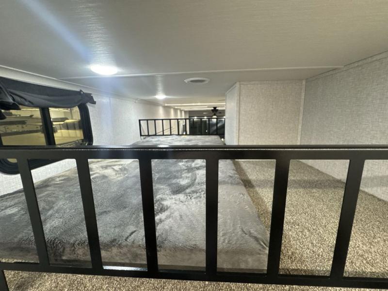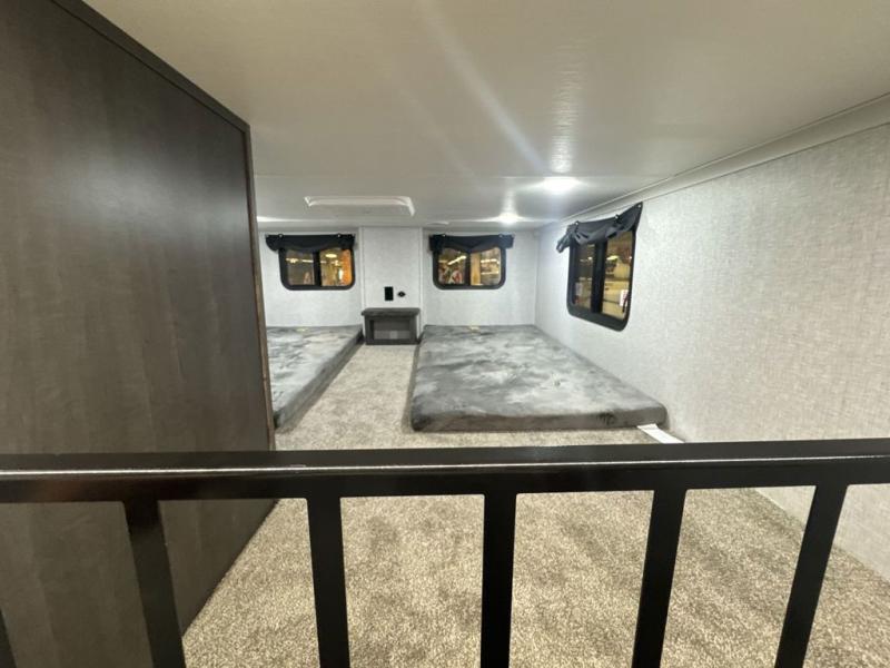 If you are looking for a destination trailer with more space and a larger sleeping capacity, this is the one! There are double loft areas; one above the bedroom with dual bunk mats and one above the bedroom with a third bunk mat. You'll find the rear bedroom ultra inviting with its king bed slide out, entertainment center with a 39" TV, plus a wardrobe and dresser to keep your things organized. If you have any other guests, they can sleep on the 72" sofa in the middle living area. There is also theater seating here, a ceiling fan, plus a fireplace and 50" TV. And the free-standing table with chairs and a bench provides a place to dine and play games in the evening. Head to the front kitchen where you'll find generous counter space, a bar top with two stools, and all the kitchen appliances to create your best meals!