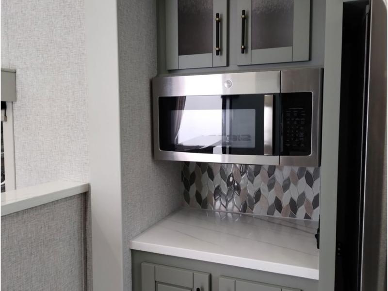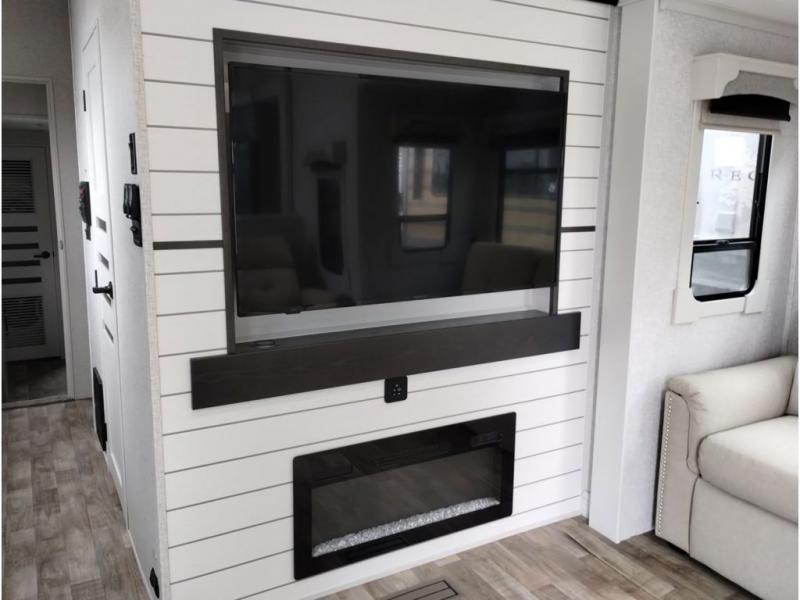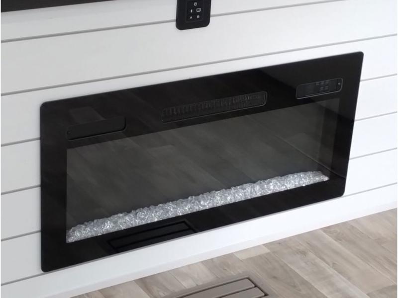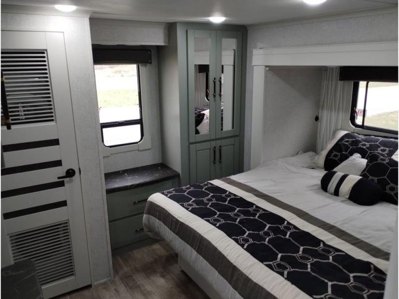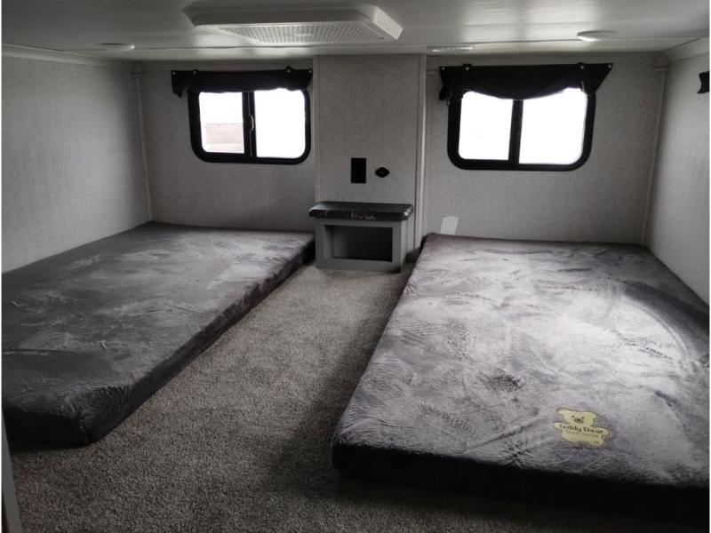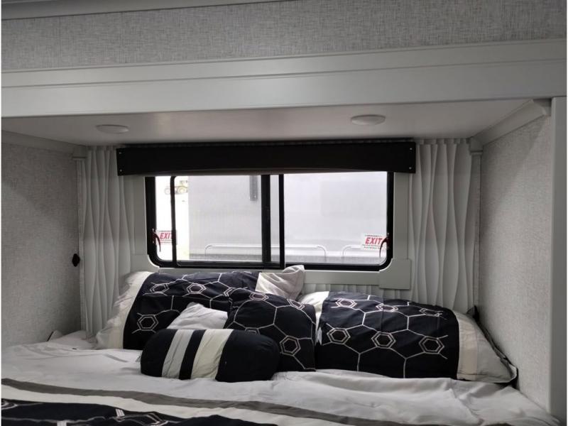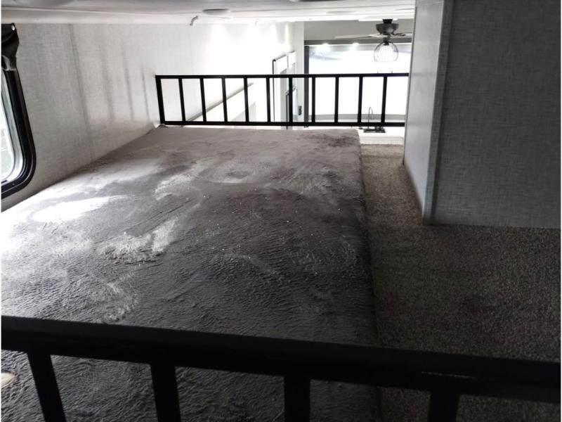If you are looking for a destination trailer with more space and a larger sleeping capacity, this is the one! There are double loft areas; one above the bedroom with dual bunk mats and one above the bedroom with a third bunk mat. You'll find the rear bedroom ultra inviting with its king bed slide out, entertainment center with a 39" TV, plus a wardrobe and dresser to keep your things organized. If you have any other guests, they can sleep on the 72" sofa in the middle living area. There is also theater seating here, a ceiling fan, plus a fireplace and 50" TV. And the free-standing table with chairs and a bench provides a place to dine and play games in the evening. Head to the front kitchen where you'll find generous counter space, a bar top with two stools, and all the kitchen appliances to create your best meals!