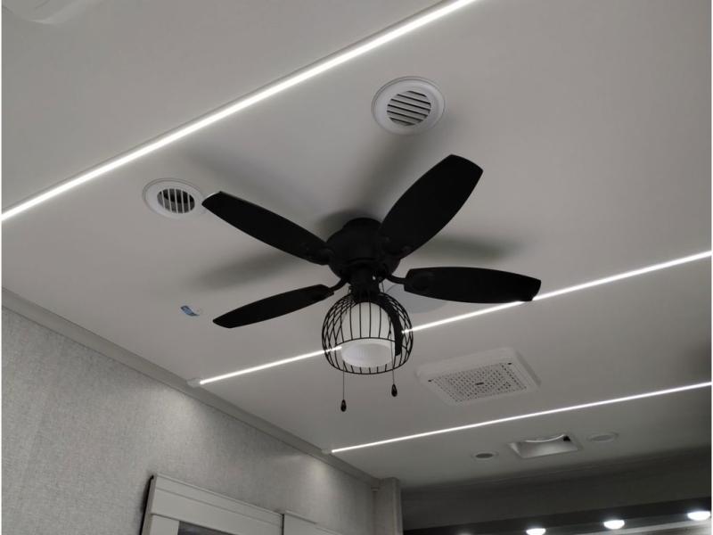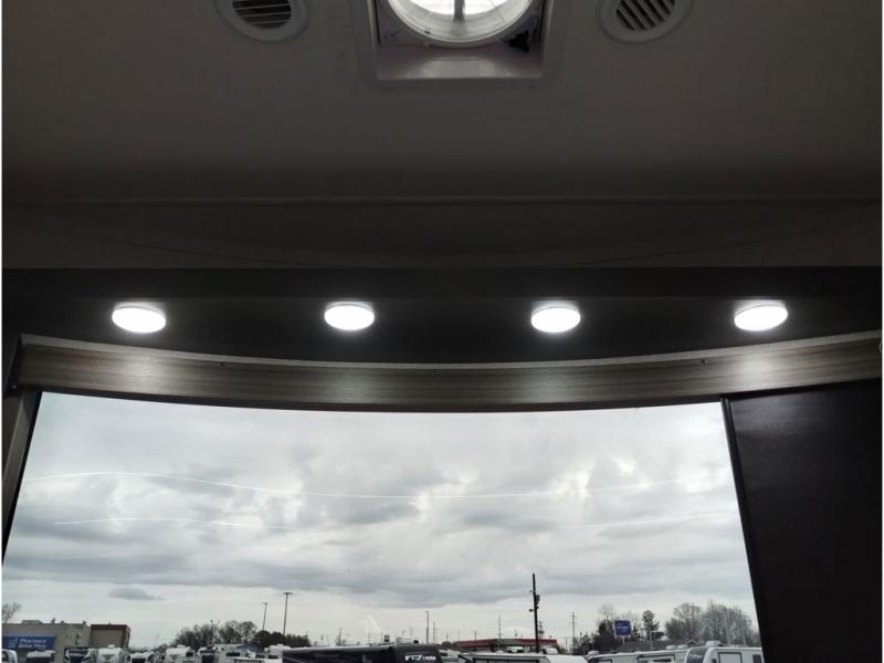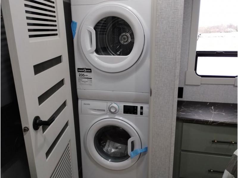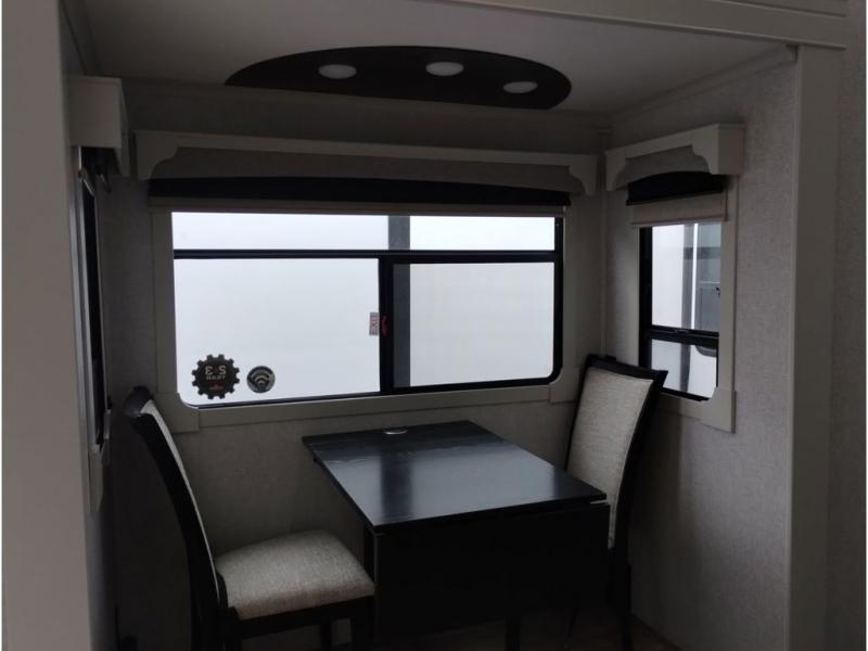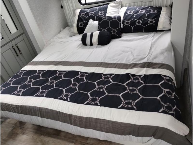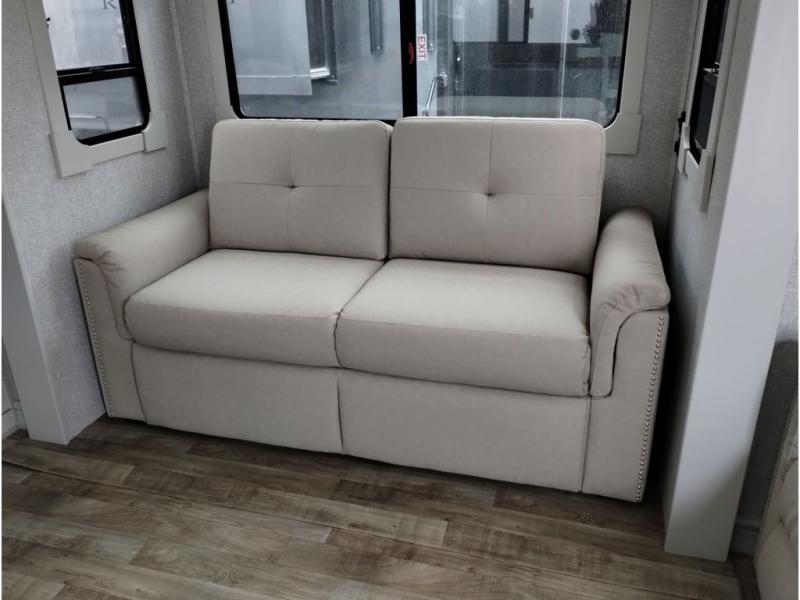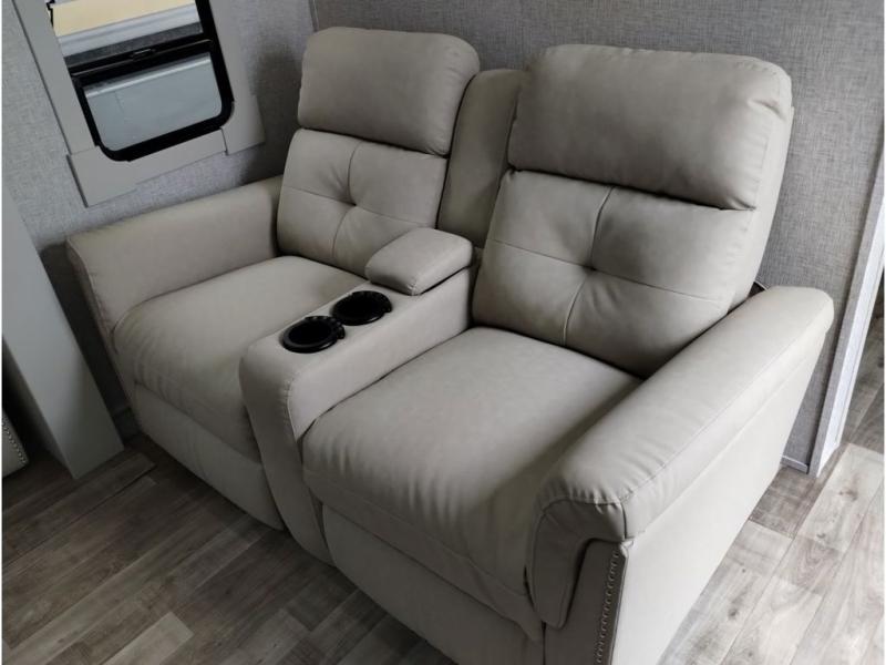 If you are looking for a destination trailer with more space and a larger sleeping capacity, this is the one! There are double loft areas; one above the bedroom with dual bunk mats and one above the bedroom with a third bunk mat. You'll find the rear bedroom ultra inviting with its king bed slide out, entertainment center with a 39" TV, plus a wardrobe and dresser to keep your things organized. If you have any other guests, they can sleep on the 72" sofa in the middle living area. There is also theater seating here, a ceiling fan, plus a fireplace and 50" TV. And the free-standing table with chairs and a bench provides a place to dine and play games in the evening. Head to the front kitchen where you'll find generous counter space, a bar top with two stools, and all the kitchen appliances to create your best meals!