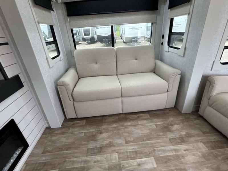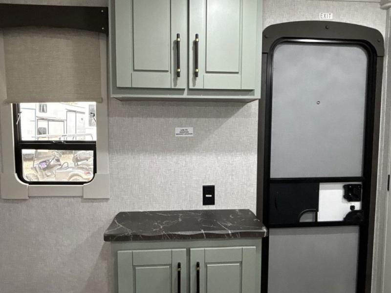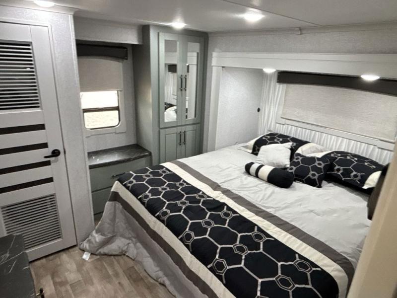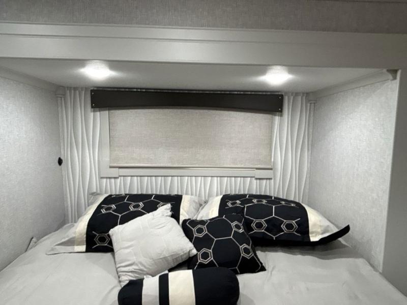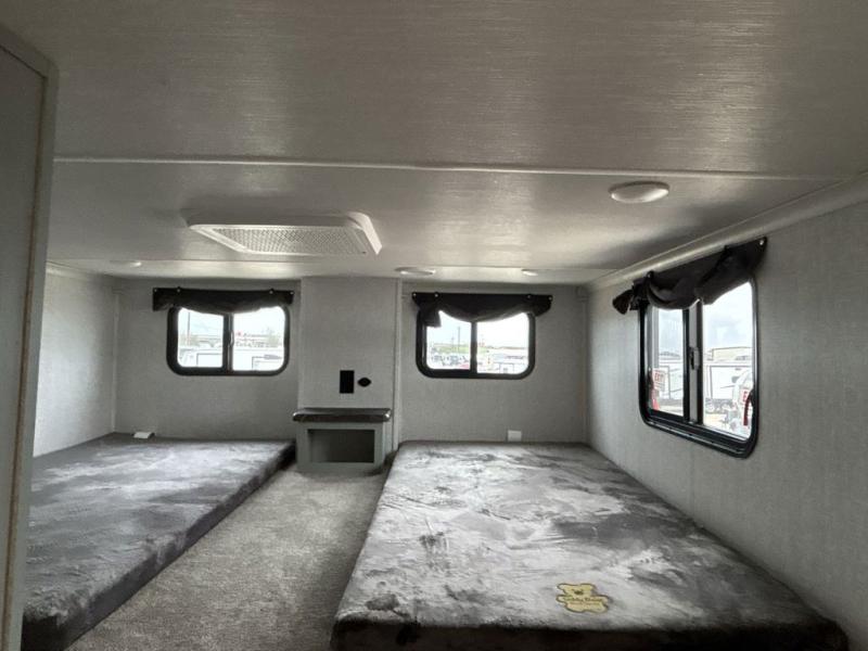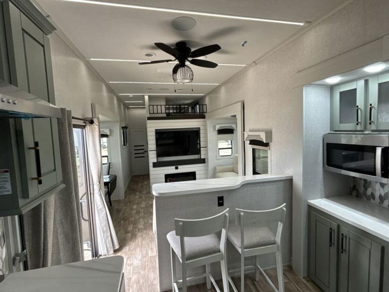 If you are looking for a destination trailer with more space and a larger sleeping capacity, this is the one! There are double loft areas; one above the bedroom with dual bunk mats and one above the bedroom with a third bunk mat. You'll find the rear bedroom ultra inviting with its king bed slide out, entertainment center with a 39" TV, plus a wardrobe and dresser to keep your things organized. If you have any other guests, they can sleep on the 72" sofa in the middle living area. There is also theater seating here, a ceiling fan, plus a fireplace and 50" TV. And the free-standing table with chairs and a bench provides a place to dine and play games in the evening. Head to the front kitchen where you'll find generous counter space, a bar top with two stools, and all the kitchen appliances to create your best meals!