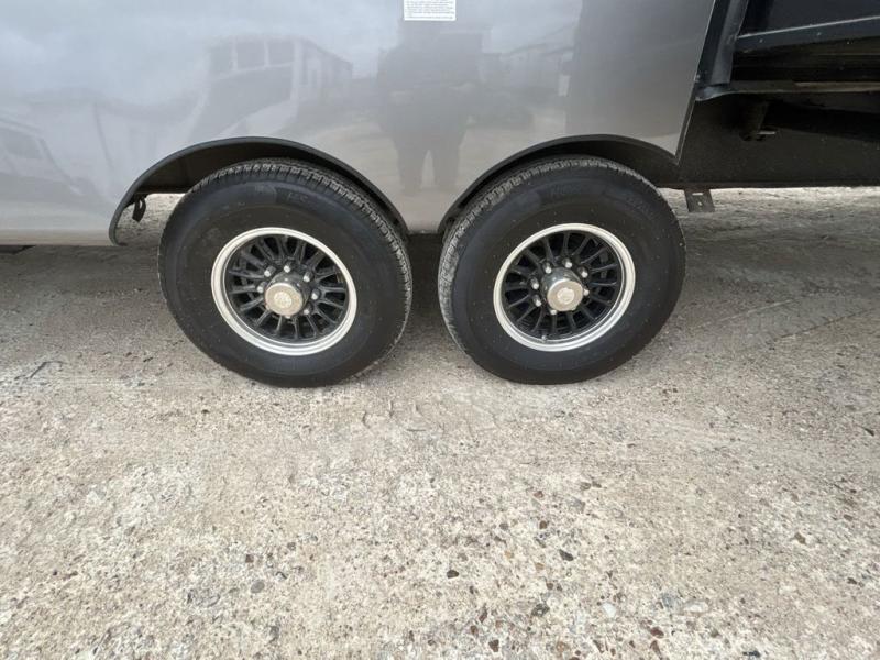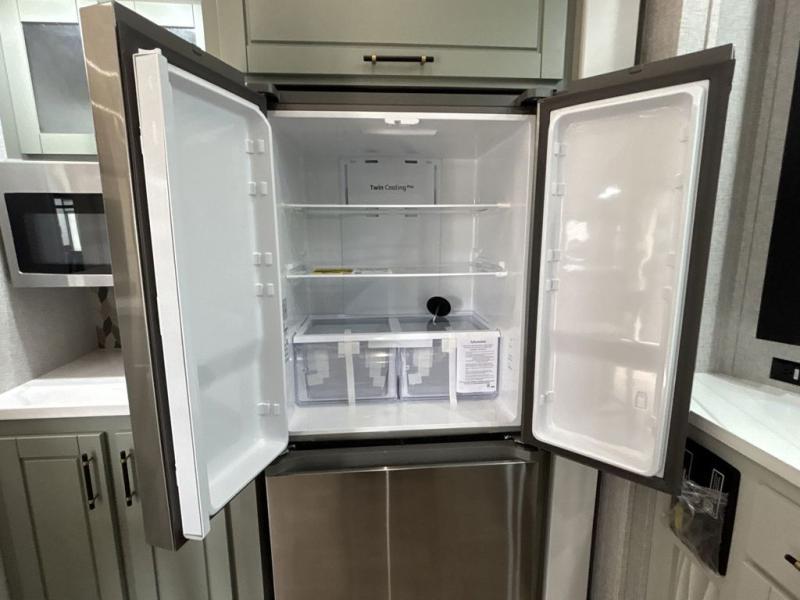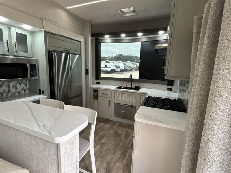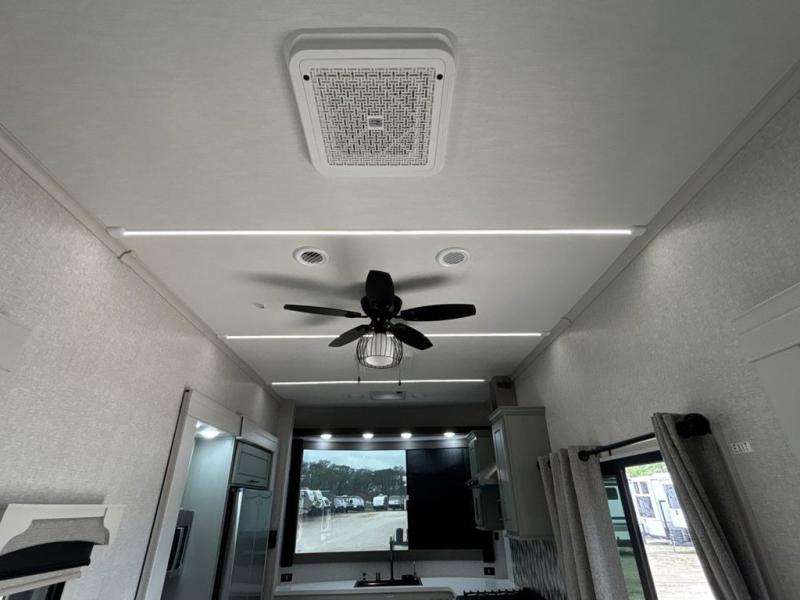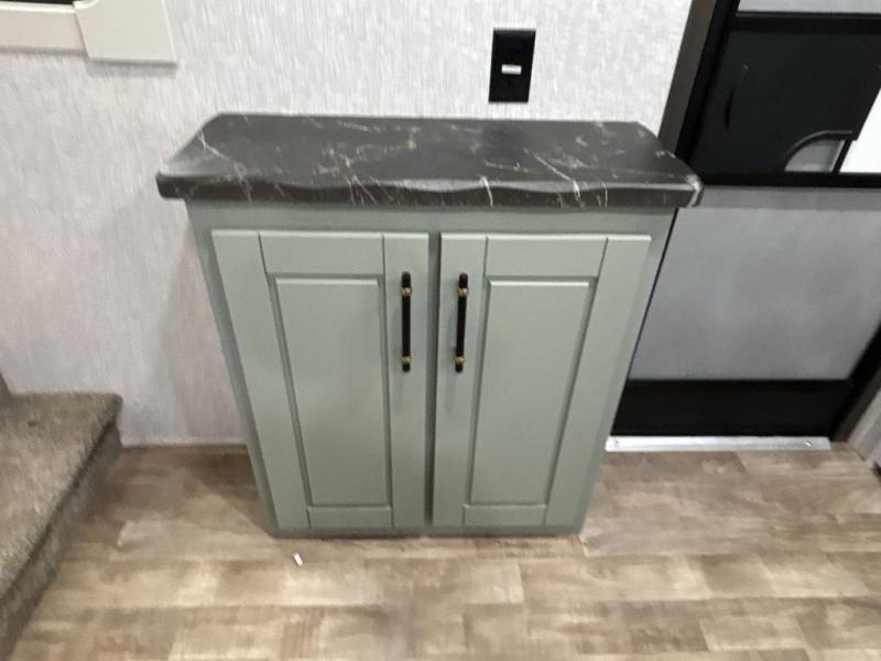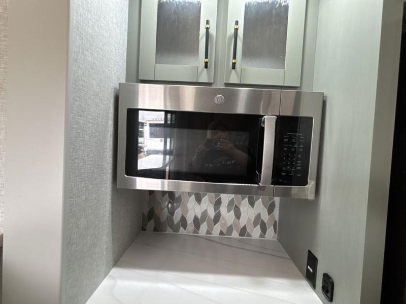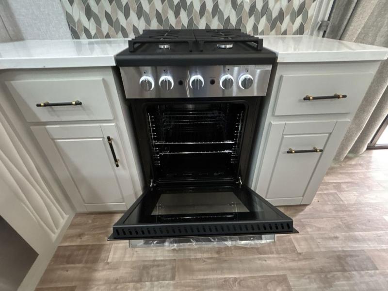 If you are looking for a destination trailer with more space and a larger sleeping capacity, this is the one! There are double loft areas; one above the bedroom with dual bunk mats and one above the bedroom with a third bunk mat. You'll find the rear bedroom ultra inviting with its king bed slide out, entertainment center with a 39" TV, plus a wardrobe and dresser to keep your things organized. If you have any other guests, they can sleep on the 72" sofa in the middle living area. There is also theater seating here, a ceiling fan, plus a fireplace and 50" TV. And the free-standing table with chairs and a bench provides a place to dine and play games in the evening. Head to the front kitchen where you'll find generous counter space, a bar top with two stools, and all the kitchen appliances to create your best meals!