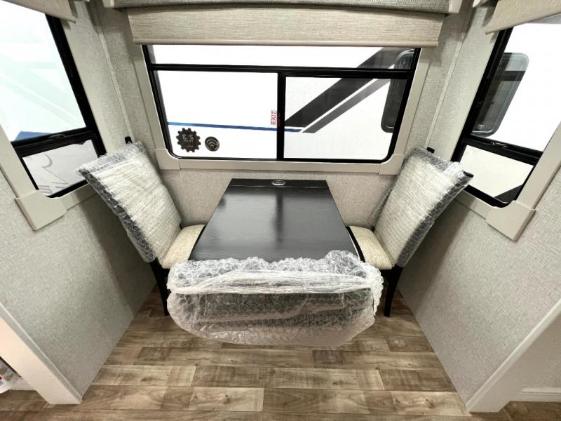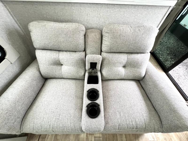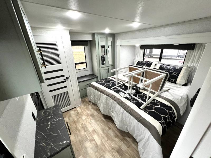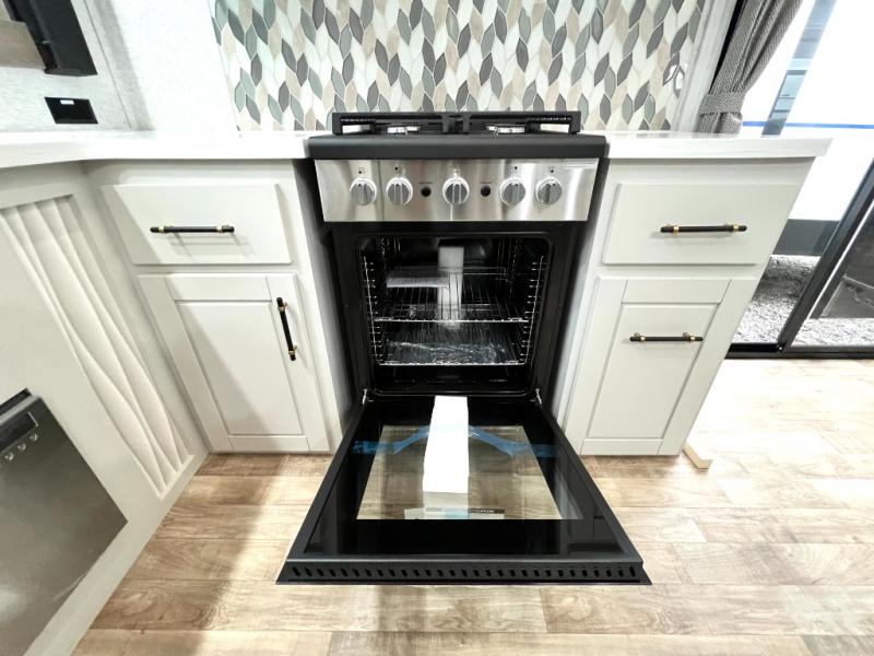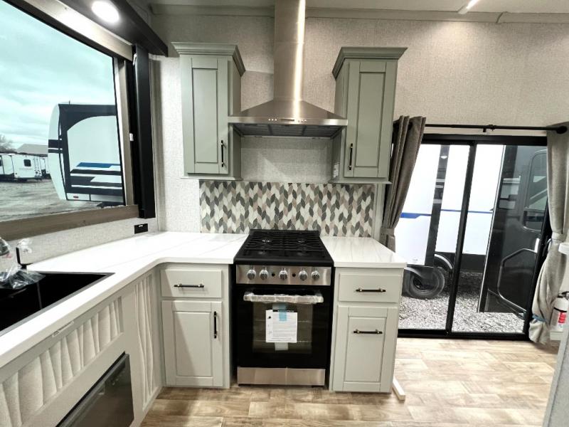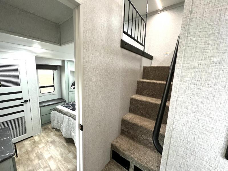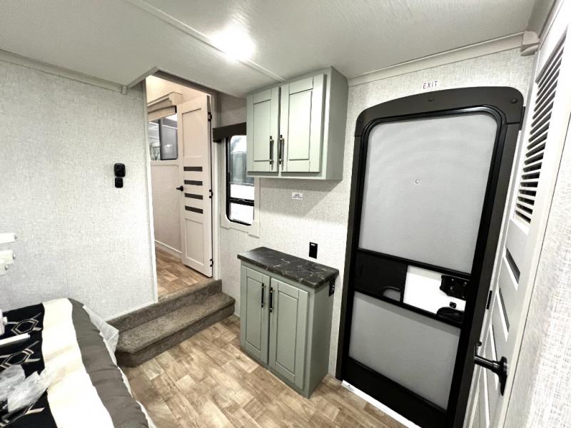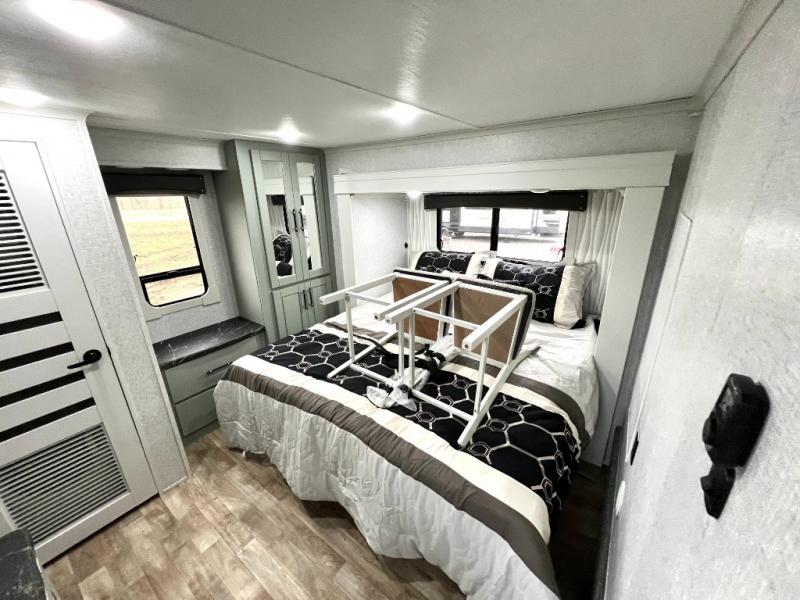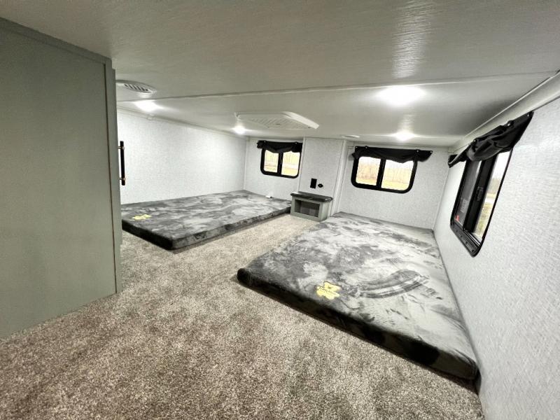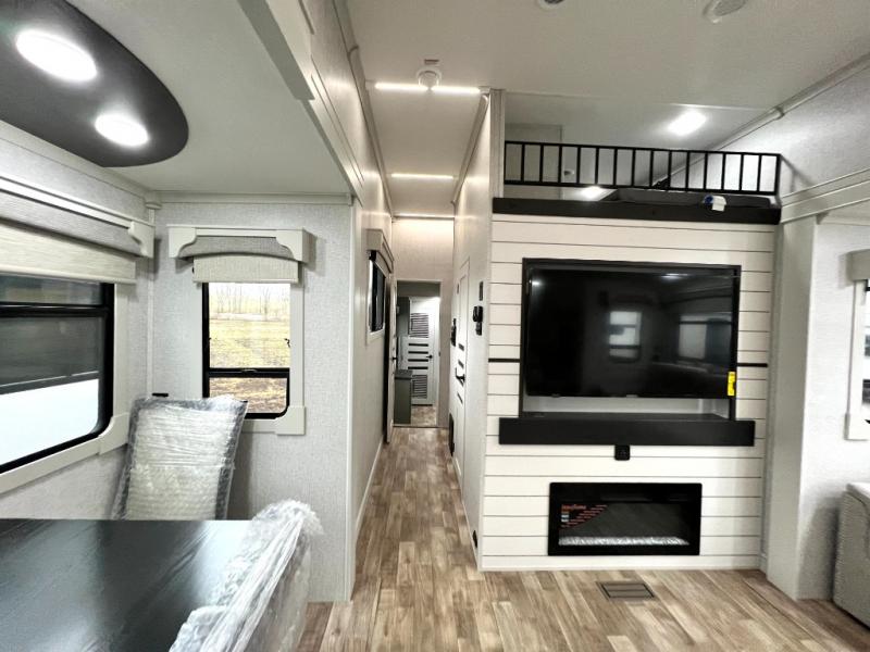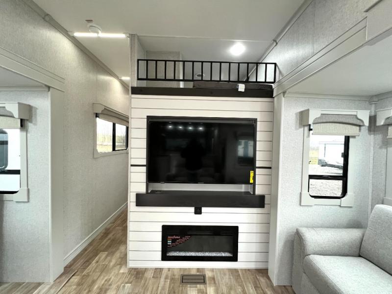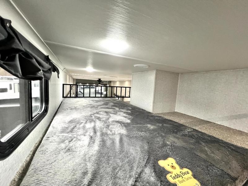If you are looking for a destination trailer with more space and a larger sleeping capacity, this is the one! There are double loft areas; one above the bedroom with dual bunk mats and one above the bedroom with a third bunk mat. You'll find the rear bedroom ultra inviting with its king bed slide out, entertainment center with a 39" TV, plus a wardrobe and dresser to keep your things organized. If you have any other guests, they can sleep on the 72" sofa in the middle living area. There is also theater seating here, a ceiling fan, plus a fireplace and 50" TV. And the free-standing table with chairs and a bench provides a place to dine and play games in the evening. Head to the front kitchen where you'll find generous counter space, a bar top with two stools, and all the kitchen appliances to create your best meals!