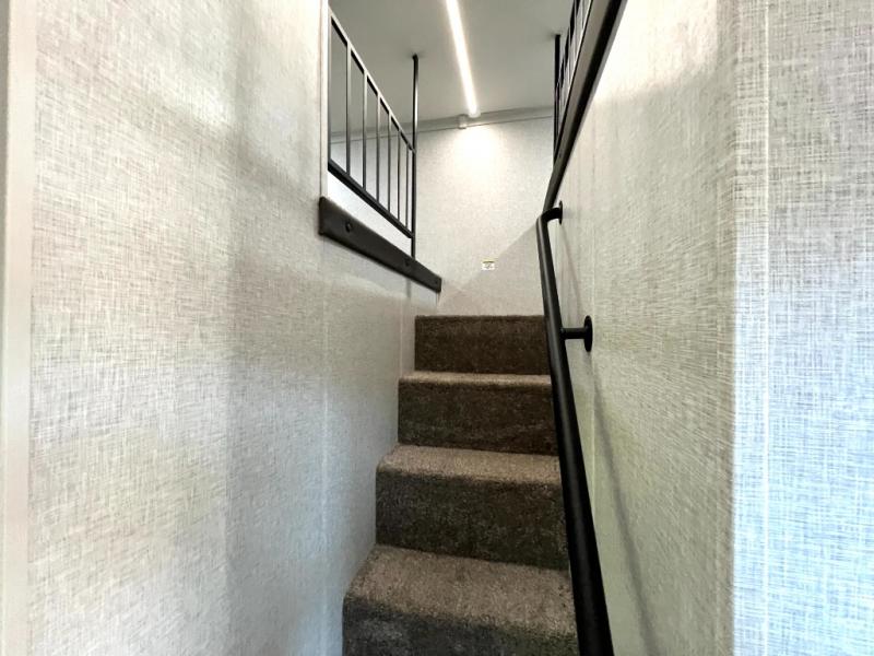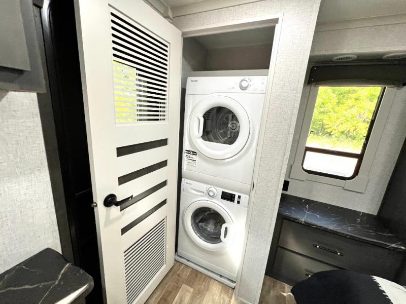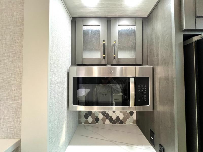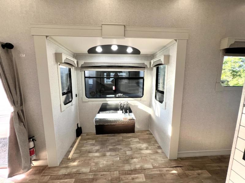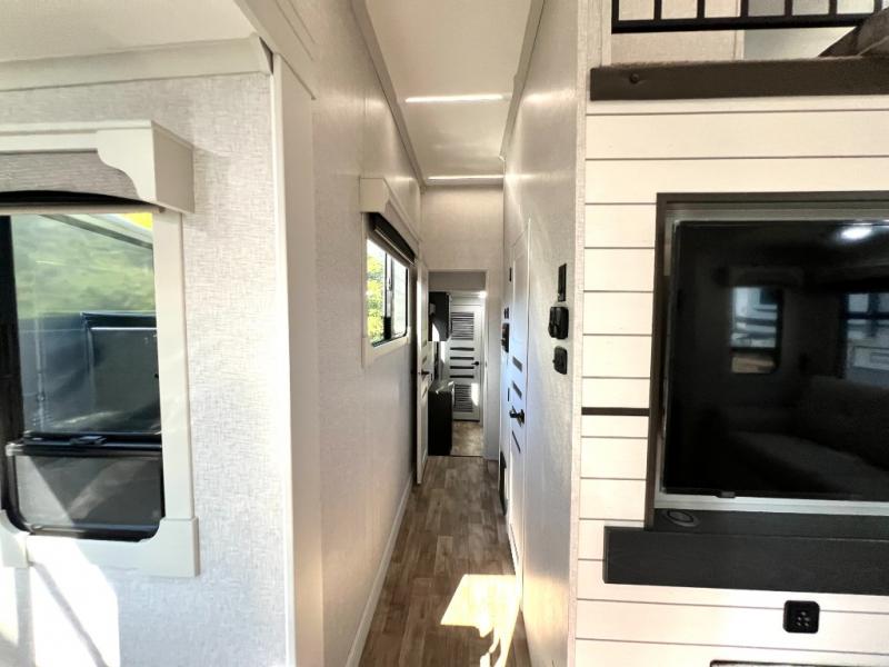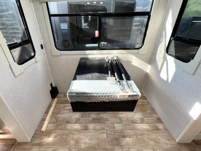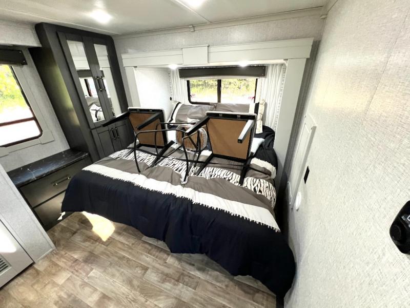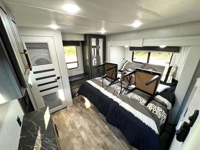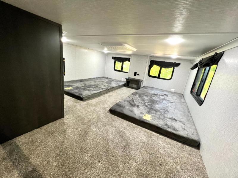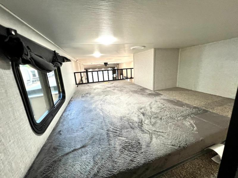 If you are looking for a destination trailer with more space and a larger sleeping capacity, this is the one! There are double loft areas; one above the bedroom with dual bunk mats and one above the bedroom with a third bunk mat. You'll find the rear bedroom ultra inviting with its king bed slide out, entertainment center with a 39" TV, plus a wardrobe and dresser to keep your things organized. If you have any other guests, they can sleep on the 72" sofa in the middle living area. There is also theater seating here, a ceiling fan, plus a fireplace and 50" TV. And the free-standing table with chairs and a bench provides a place to dine and play games in the evening. Head to the front kitchen where you'll find generous counter space, a bar top with two stools, and all the kitchen appliances to create your best meals!