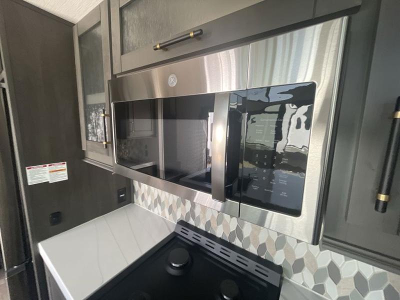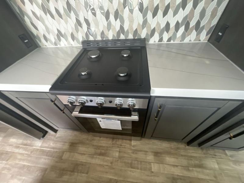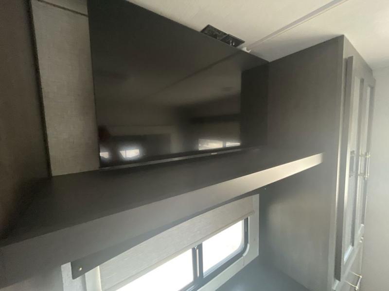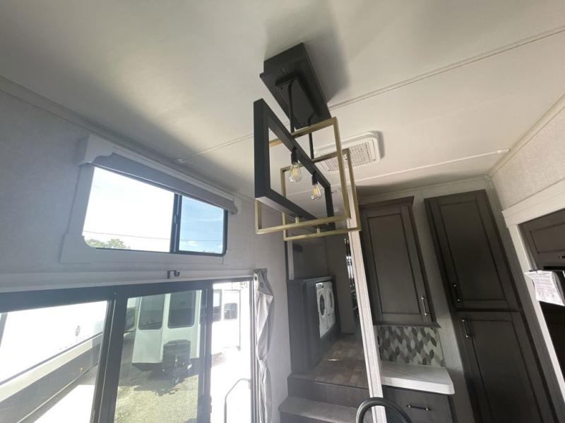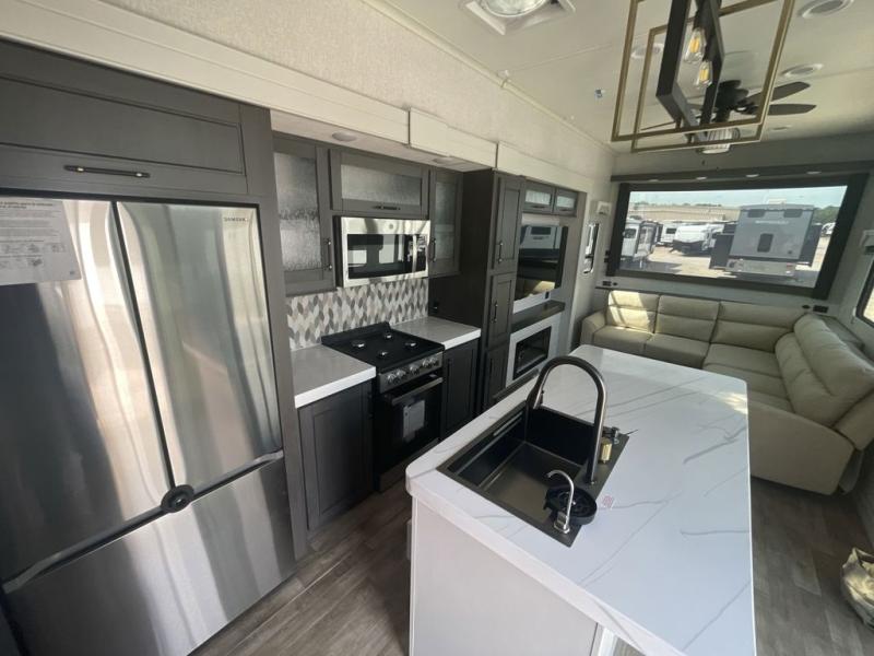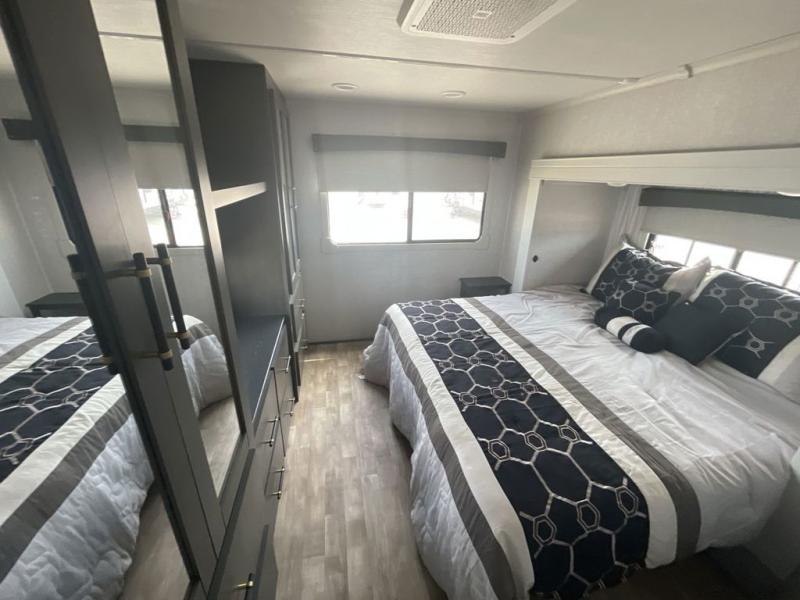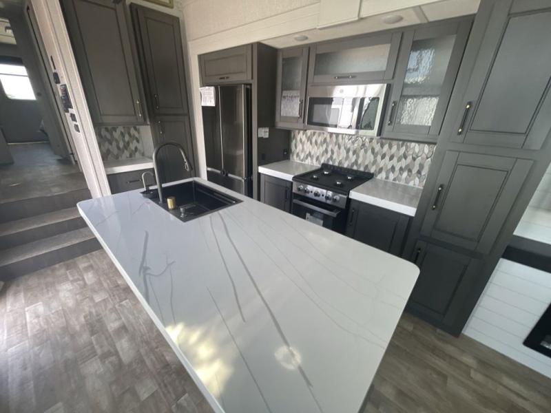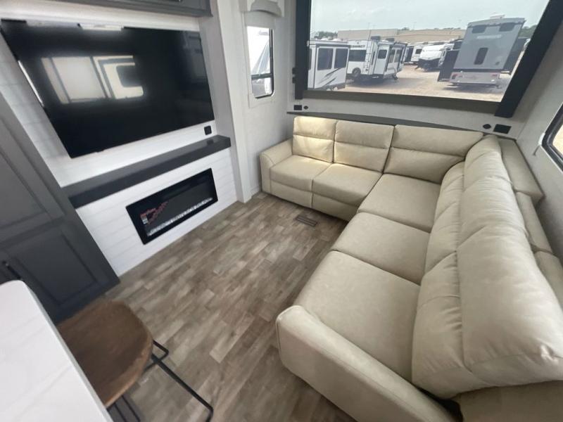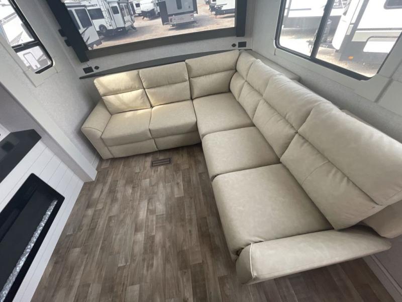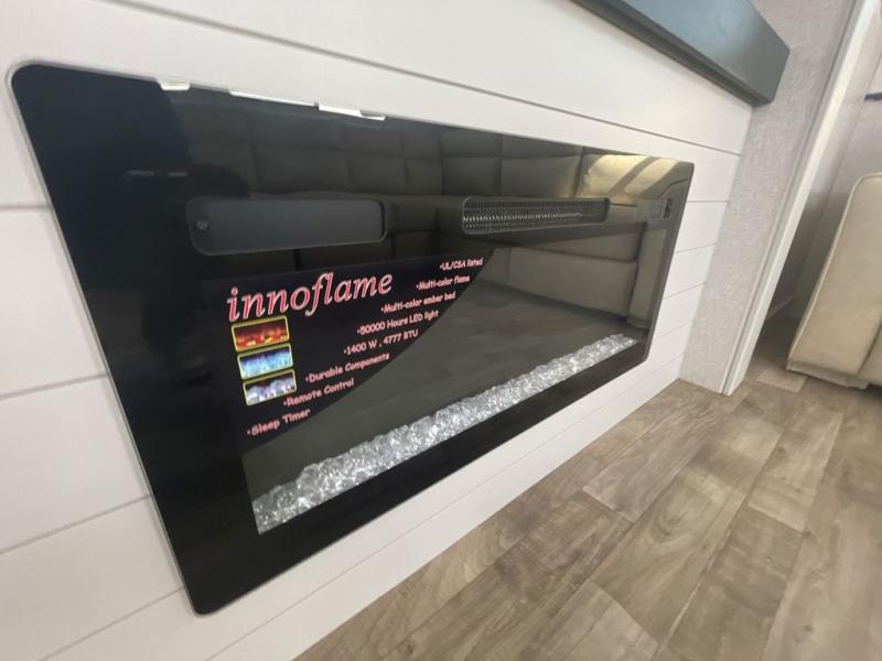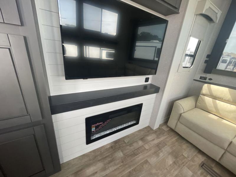 You're going to love time spent in this triple slide out destination trailer! A front L-shaped sectional sofa provides your crew with a space to relax in the evenings, and the fireplace here with a 65" TV is sure to make it feel like home. A large kitchen island with stools gives you a more counter space and a place to dine at together. You will also enjoy the sliding door here for more natural light. The full bath includes a spacious 48" shower plus dual bath sinks so you both can get ready for bed at the same time. You'll feel right at home in the rear bedroom with its king bed slide out, dual nightstands, two wardrobes and a dresser for maximum storage space!