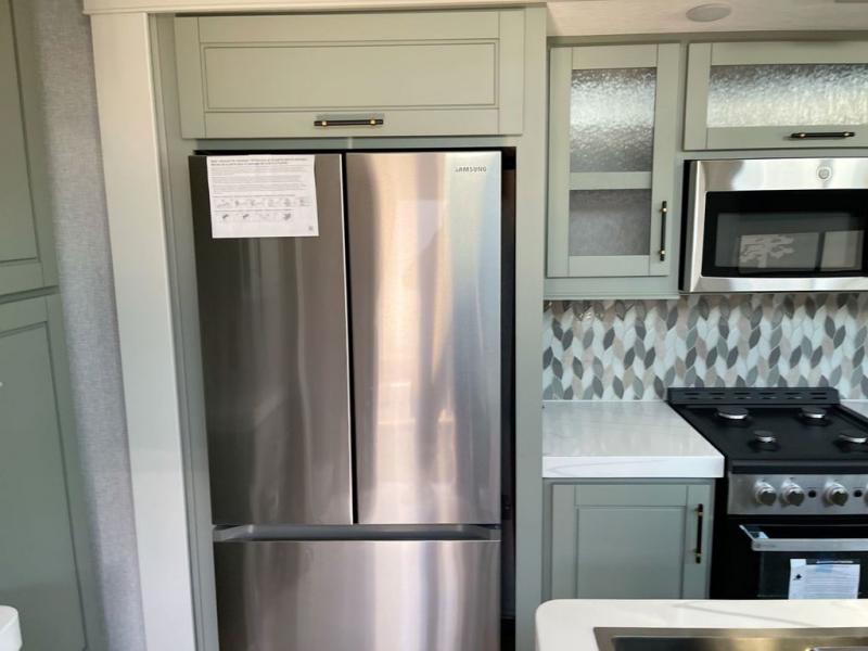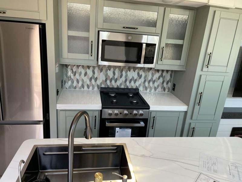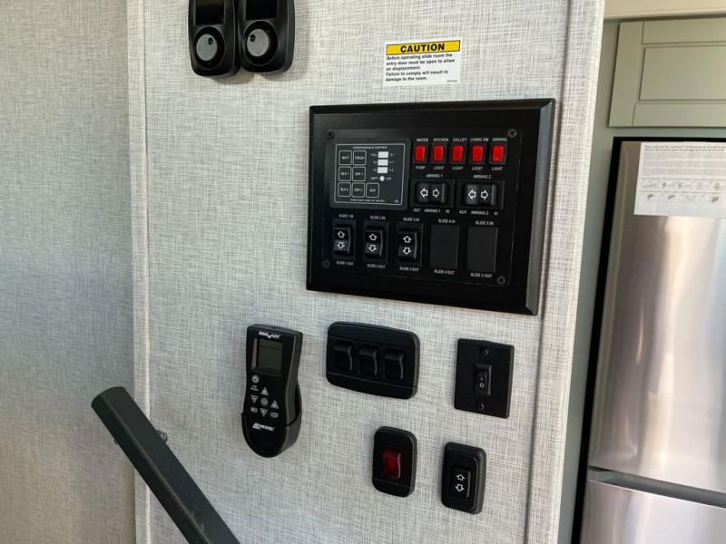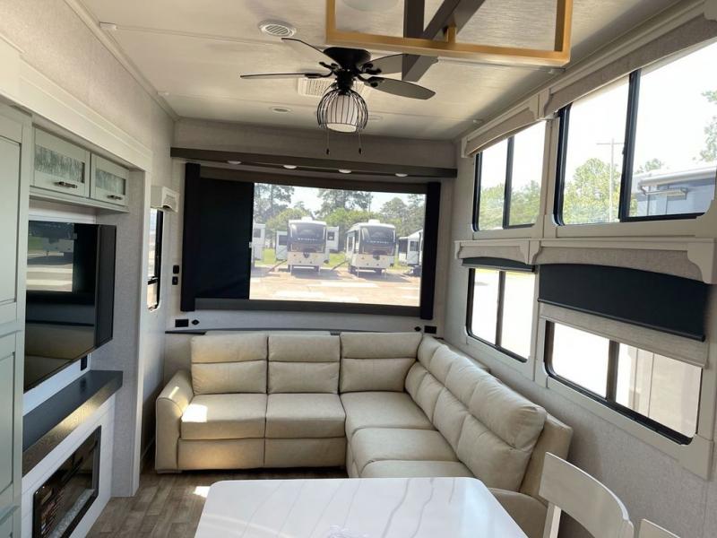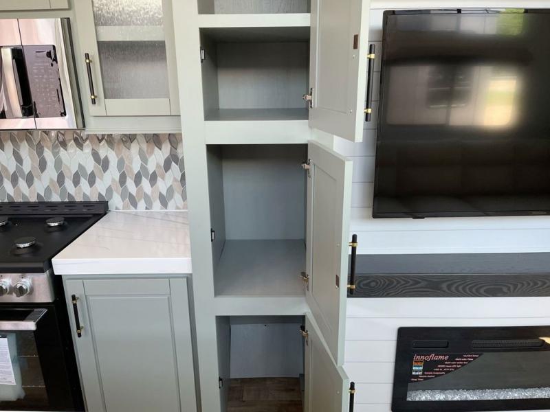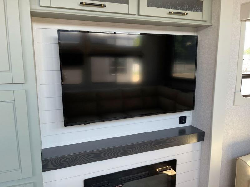 You're going to love time spent in this triple slide out destination trailer! A front L-shaped sectional sofa provides your crew with a space to relax in the evenings, and the fireplace here with a 65" TV is sure to make it feel like home. A large kitchen island with stools gives you a more counter space and a place to dine at together. You will also enjoy the sliding door here for more natural light. The full bath includes a spacious 48" shower plus dual bath sinks so you both can get ready for bed at the same time. You'll feel right at home in the rear bedroom with its king bed slide out, dual nightstands, two wardrobes and a dresser for maximum storage space!