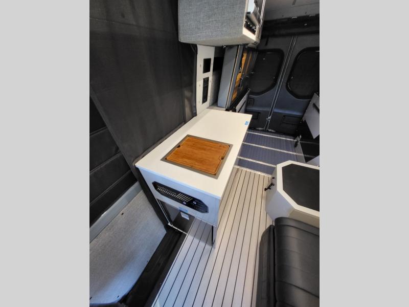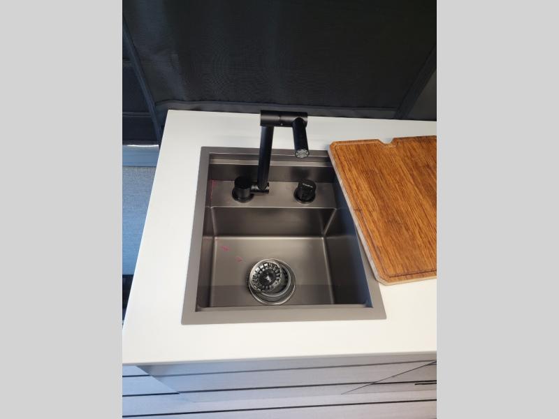Forget basic van meals—the Oasis features a fully equipped galley kitchen with an induction cooktop, refrigerator, deep sink, and ample counter space, allowing you to cook gourmet meals even in the most remote locations. The sleek, modern design of the kitchen ensures a comfortable cooking experience on the go. -