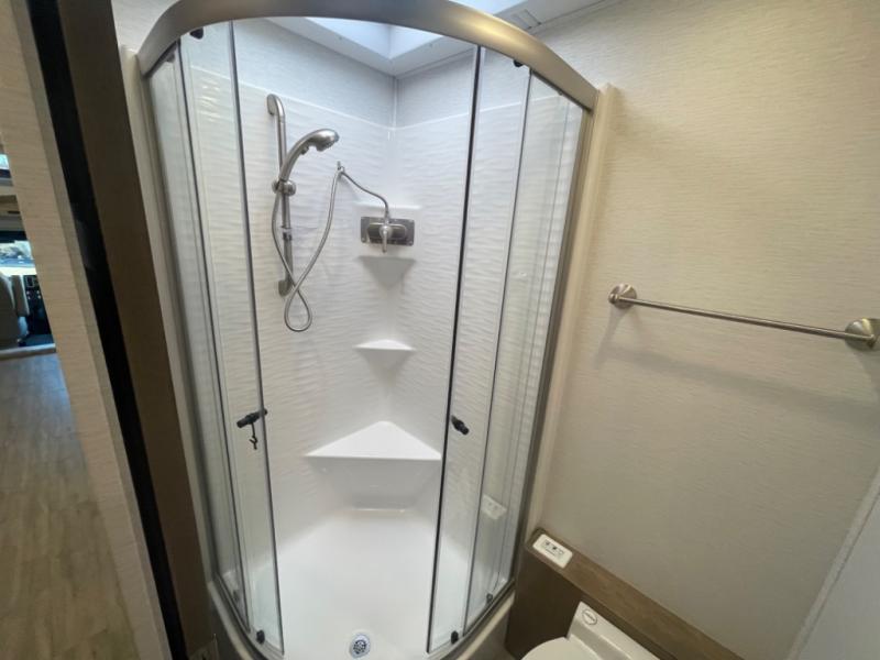 Spa-Like Bathroom: Enjoy a large shower with glass door, porcelain toilet, and a well-designed vanity area—perfect for staying refreshed on the road.