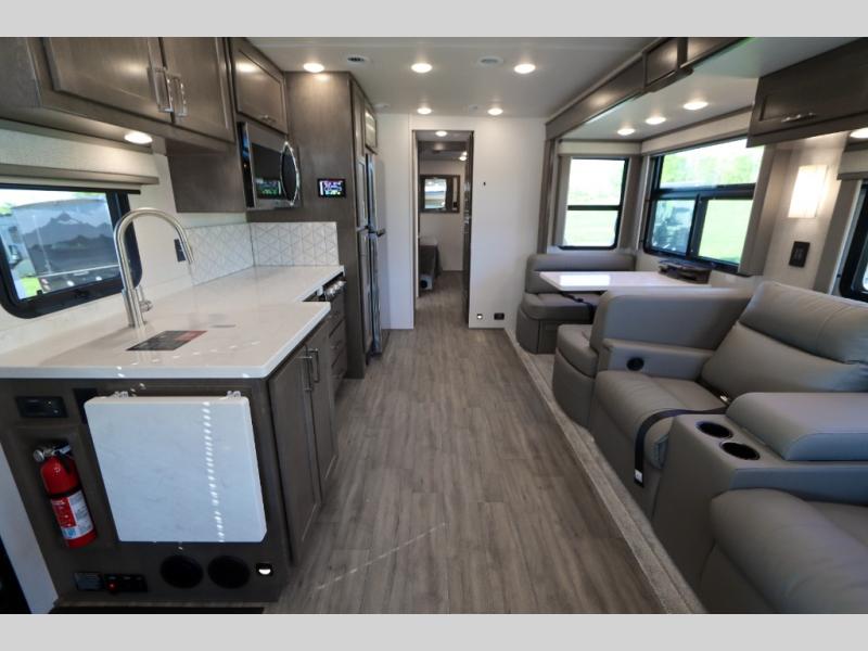 You will experience comfort and luxury with this motorhome! The rear private bedroom has a 66" x 74" mini-king bed across from a 32" Smart LED TV with a dresser below and closets on either side, plus it leads into the separated bathroom. The bathroom has a radius shower with a skylight above for natural lighting as you get ready and a closet that pre-wired and plumbed for an optional washer and dryer for clean clothes throughout your entire trip. The sofa sleeper and booth dinette offer a comfortable place to relax and convert to sleeping space. Grab a cold beverage from the 18 cu. ft. residential stainless steel refrigerator then head to the exterior entertainment center to watch the big game on the 32" Smart LED TV with a sound bar on a swivel and USB charging!
