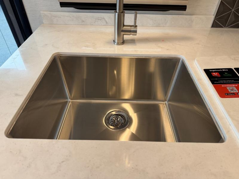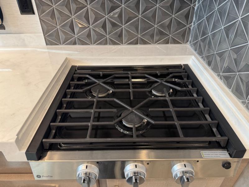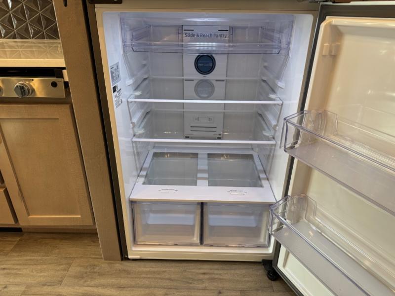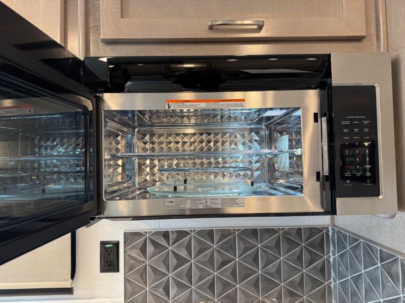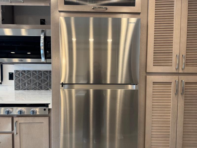 - Gourmet Kitchen – The kitchen in the Valencia 38BB is truly a chef’s dream. Featuring stainless steel appliances, a large residential refrigerator, a convection microwave, a three-burner cooktop, and solid surface countertops, this kitchen makes meal preparation an absolute joy. Whether you’re cooking a quick snack or preparing a full meal, the layout and amenities in the Valencia 38BB will allow you to do so with ease.