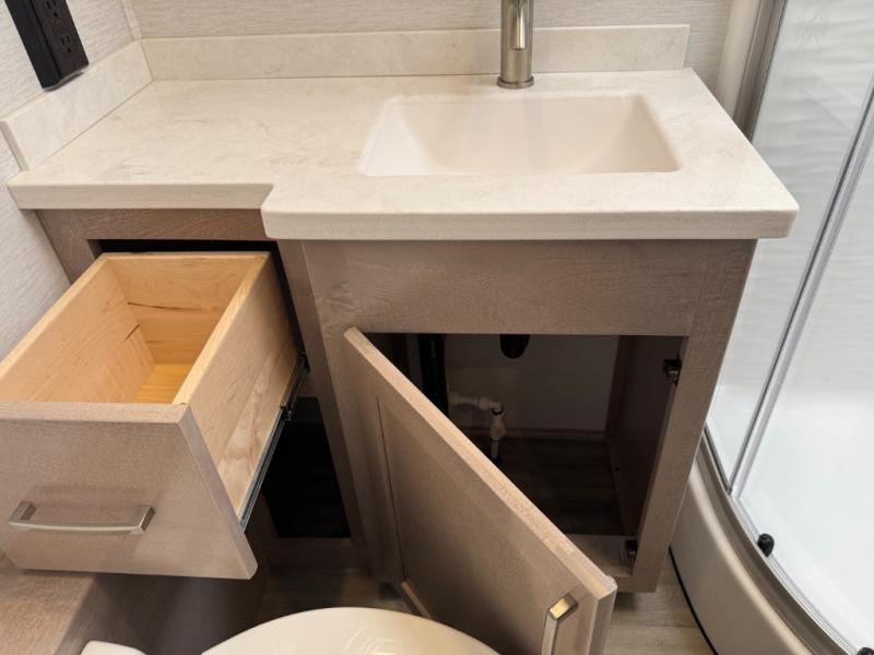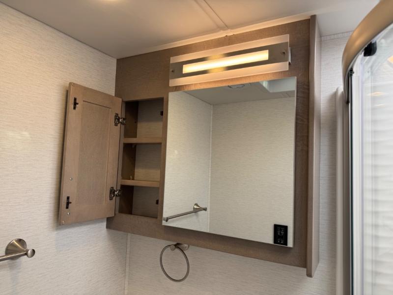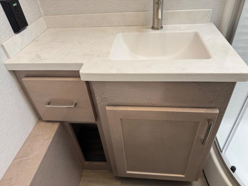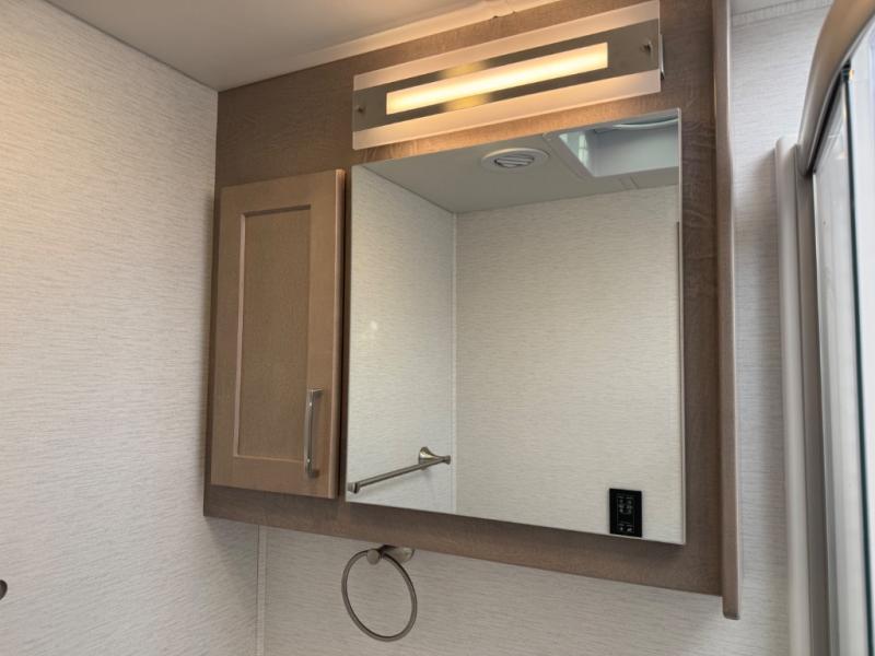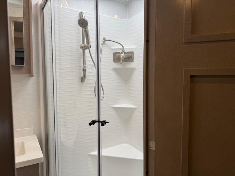 - Modern and Functional Bathroom – The 2025 Renegade Valencia 38BB comes equipped with a luxurious bathroom that offers plenty of space and high-end finishes. The large shower with a built-in seat, stylish vanity, and modern fixtures make this bathroom as functional as it is beautiful. With thoughtful touches like a medicine cabinet, premium countertop space, and a separate water closet, you’ll feel like you’re in a spa every time you step inside.