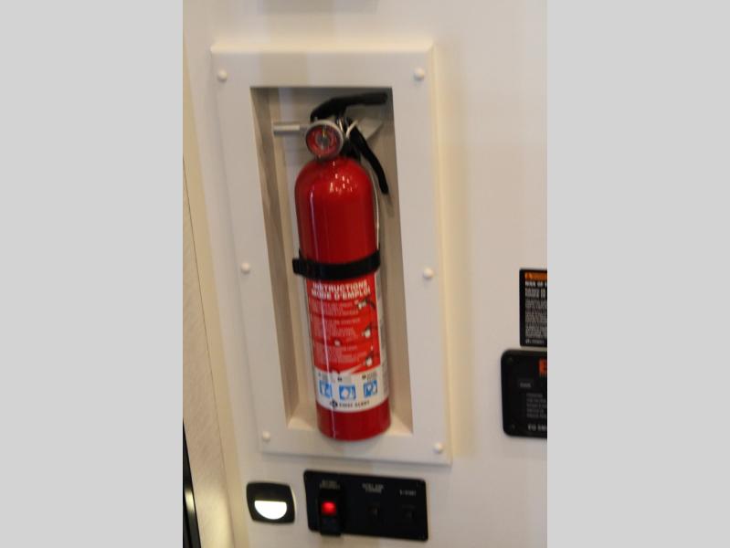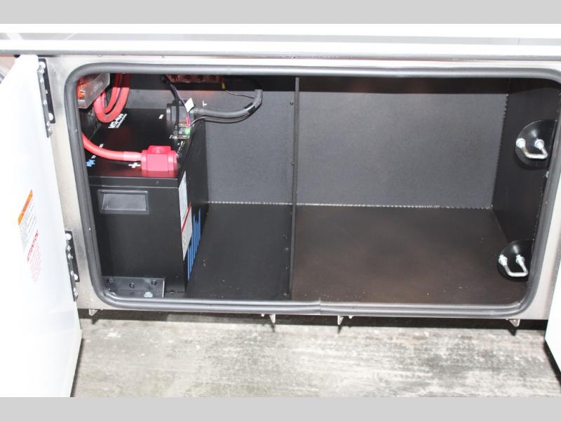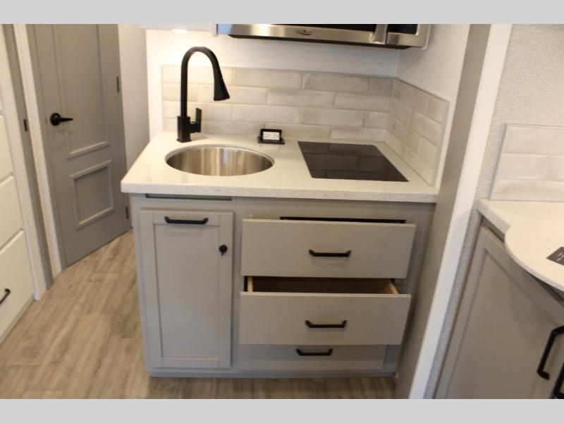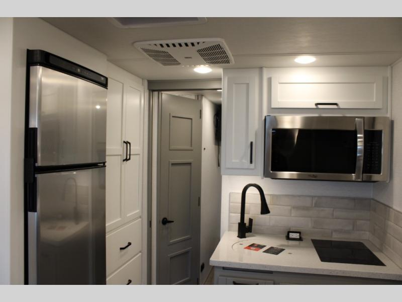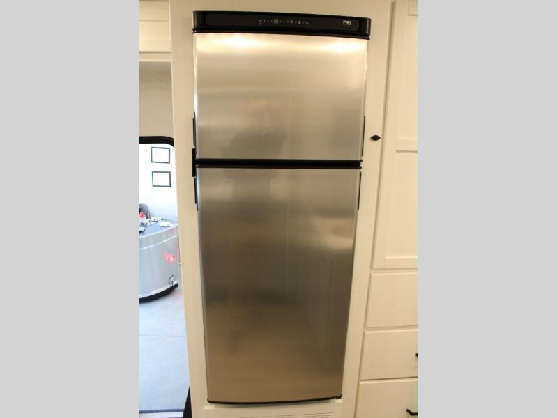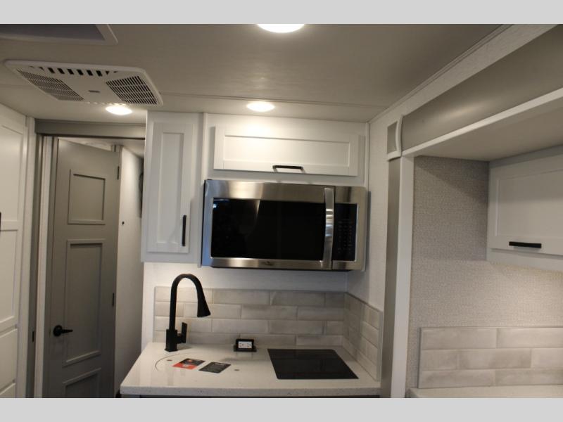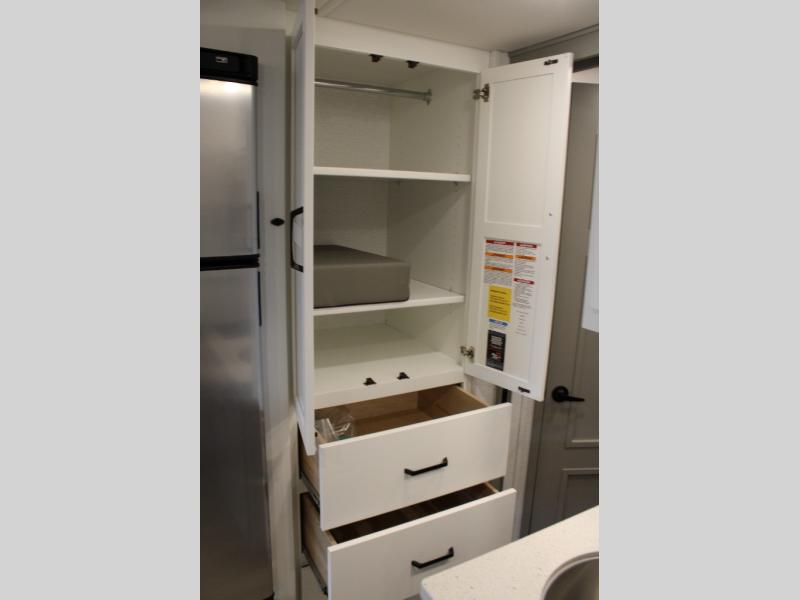 The galley kitchen features a two-burner cooktop, 10 cu. ft. stainless steel refrigerator, microwave, pantry storage, and a spacious closet to help you prepare meals just like you would at home. The smart kitchen layout makes cooking on the road convenient and enjoyable.