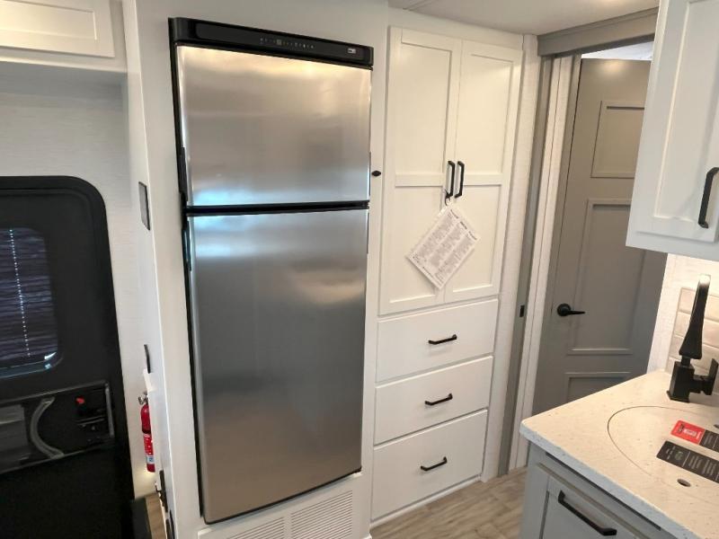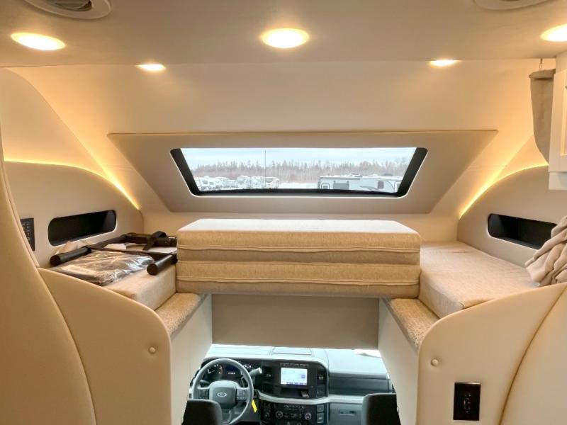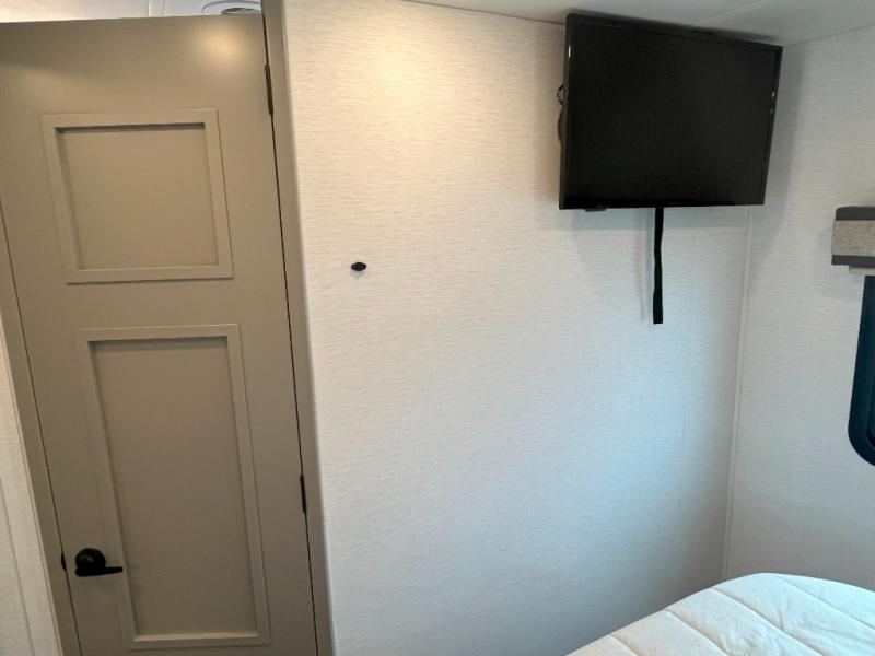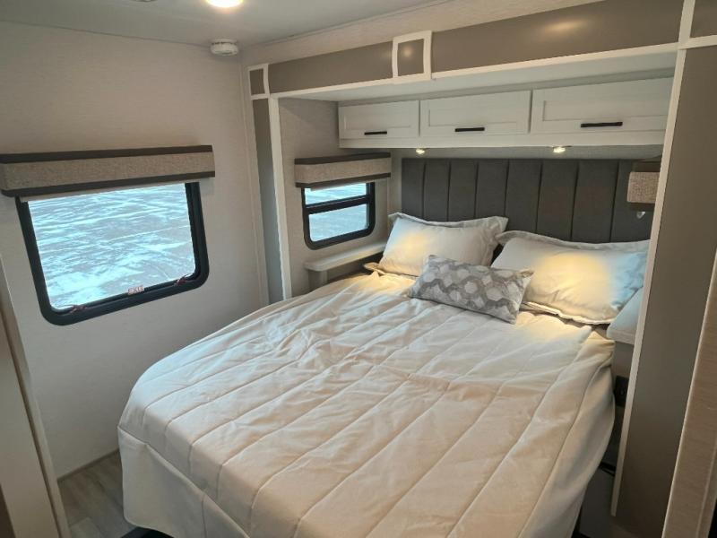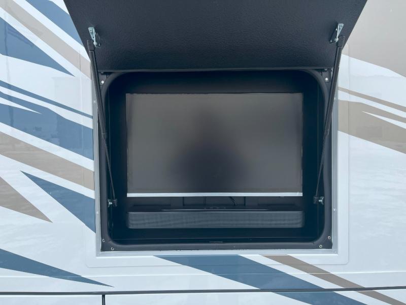 Experience ultimate luxury on wheels in this motor home bedroom. A 65 x 75 queen bed comfort with 32” LED TV entertainment and a full bathroom convenience with ample storage. The kitchen is fitted with spacious closet organization, 10 cu. stainless steel refrigerator, microwave, two-burner cooktop, overhead cabinets, and a pantry storage ideal for storing different stuff. In the living room, you will find a 42” LED TV, overhead cabinets, sofa sleeper flexibility, dinette dining, and a cab-over bed for extra sleep. This unit is also equipped with outdoor entertainment, perfect for socializing and outdoor fun, allowing you to experience extended trips with family during vacations, ideal for those who are adventure-seekers. Unforgettable adventures await! Experience the freedom of luxury motorhome living.