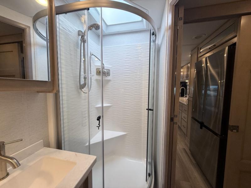 - Radius shower with skylight and glass door