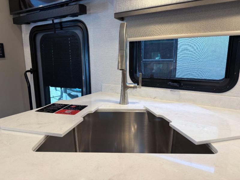- Solid surface countertops and generous prep space