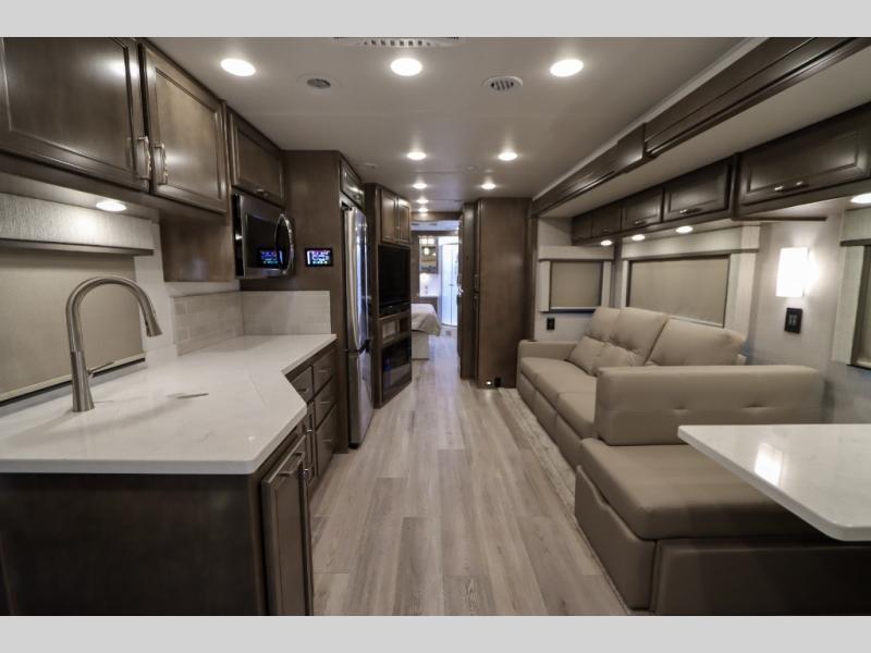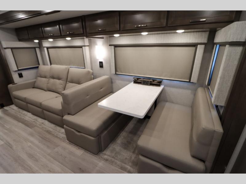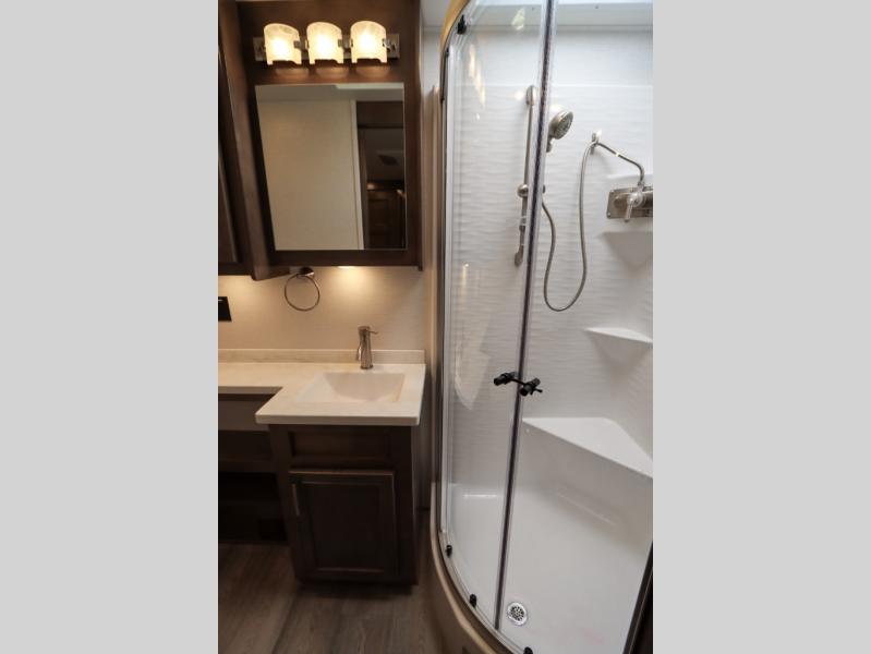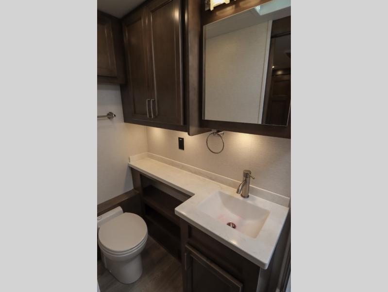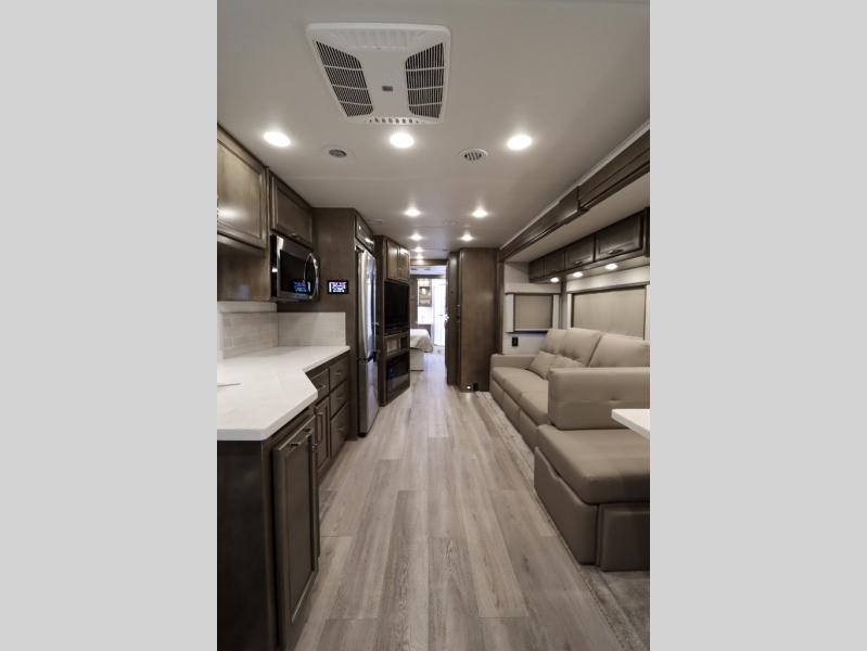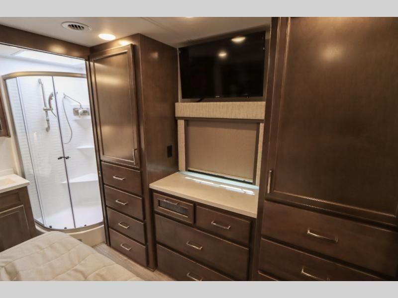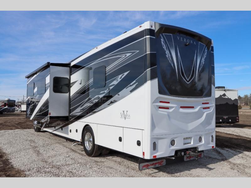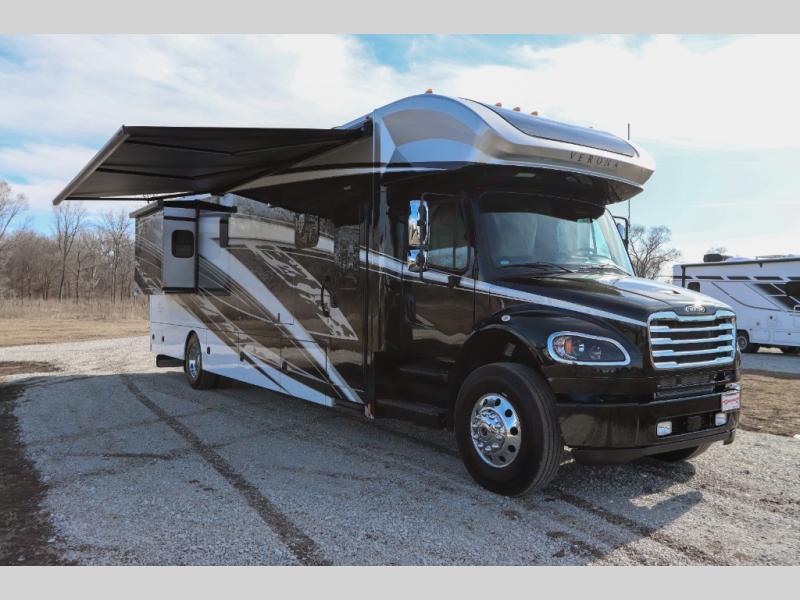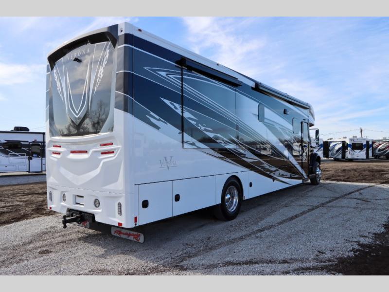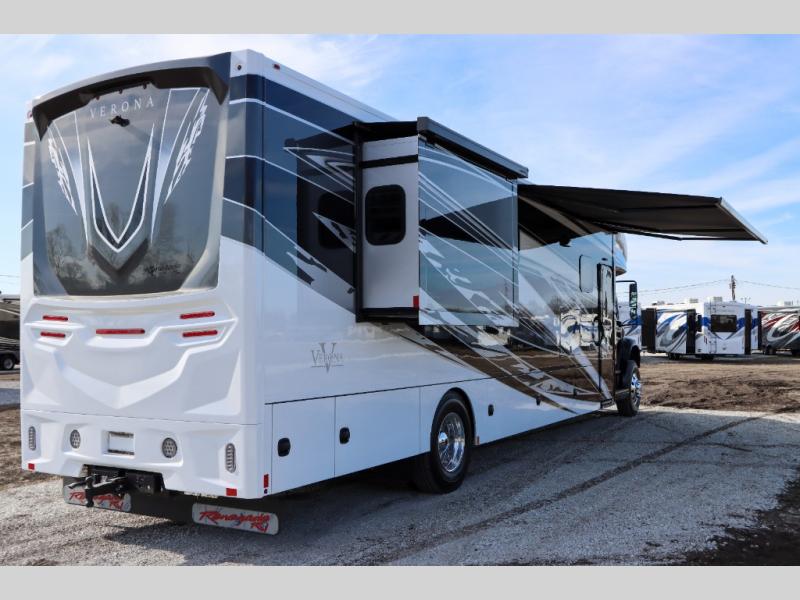 With any Renegade Verona Super C diesel motorhome, you will have confidence to explore the open road! The Cummins 360HP 3200TRV Allison transmission gives you the power and performance to travel anywhere, and the 3000-watt true sine inverter makes this an electric coach, plus the aluminum automotive cab construction is designed and tested for occupant protection. The interior boast about the solid hardwood cabinets including every cabinet stile and passage door are made from hardwood for true residential craftsmanship and the articulating cabinet hinges complete the package. More luxurious features include the polished solid surface countertops, the memory foam mattress, and the wavy patterned fiberglass shower with glass door. Choose extreme luxury, purpose and durability, take a Verona on the road today!