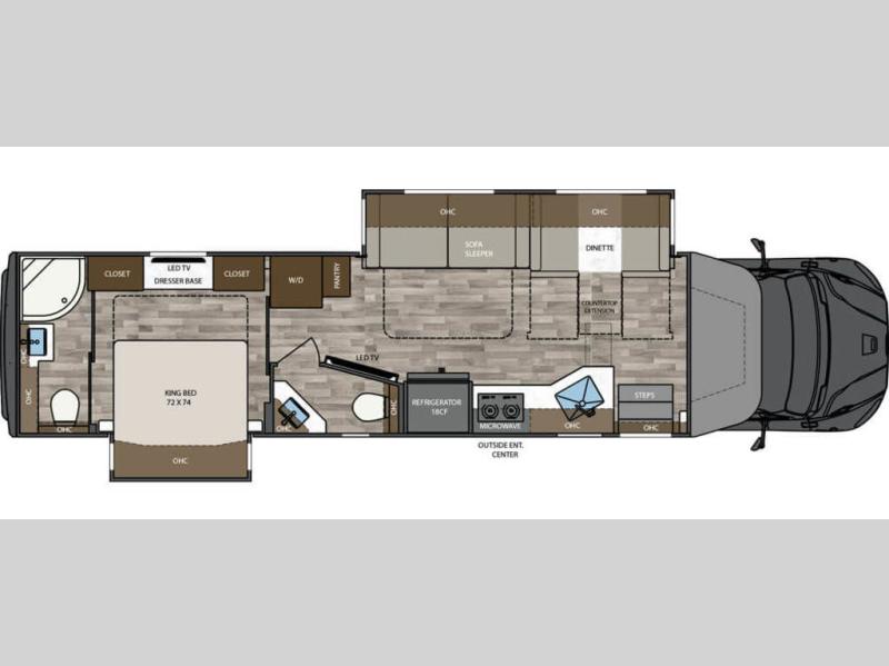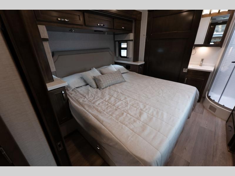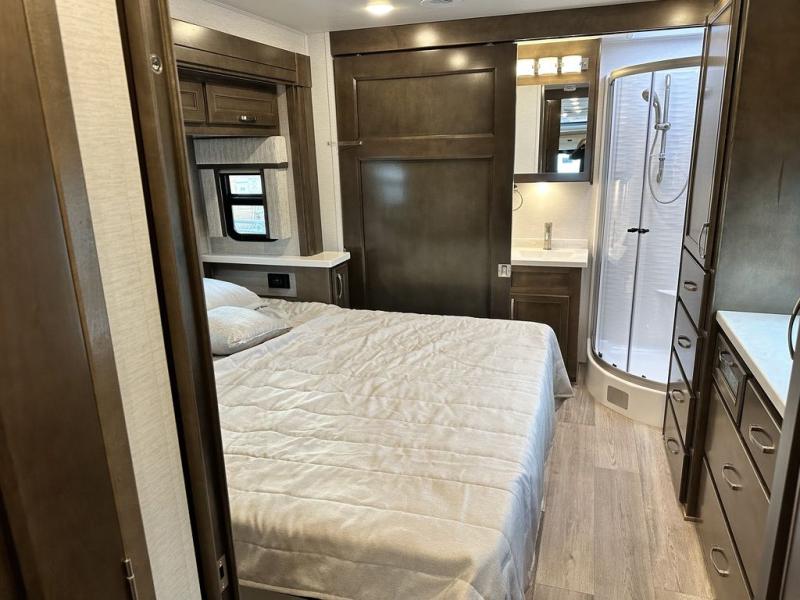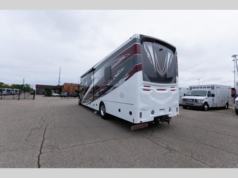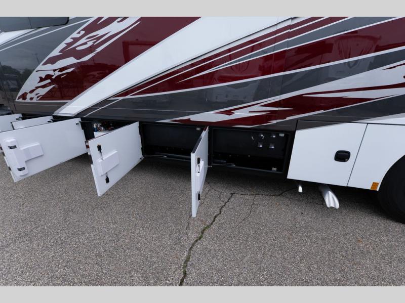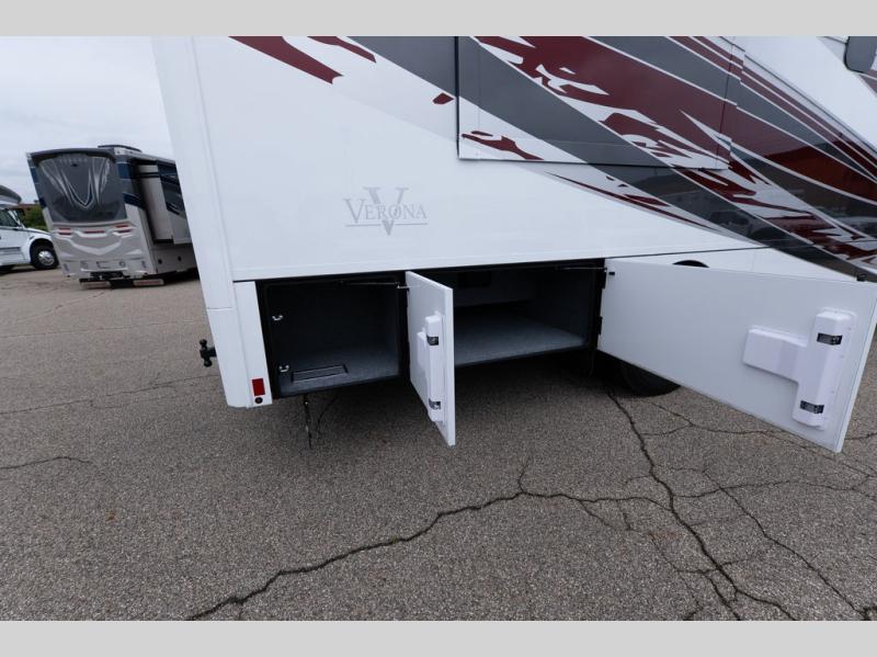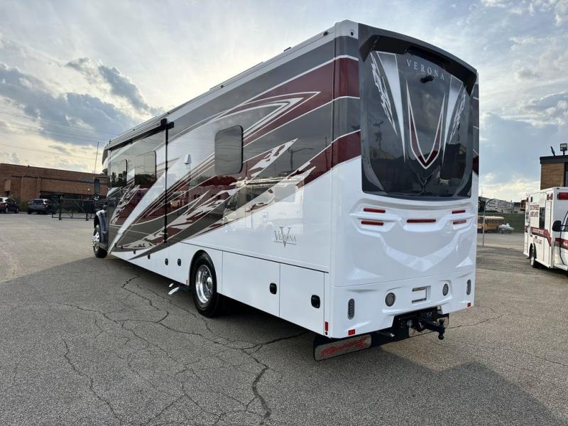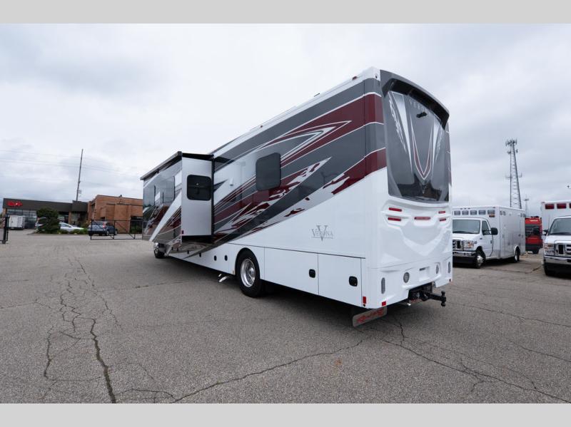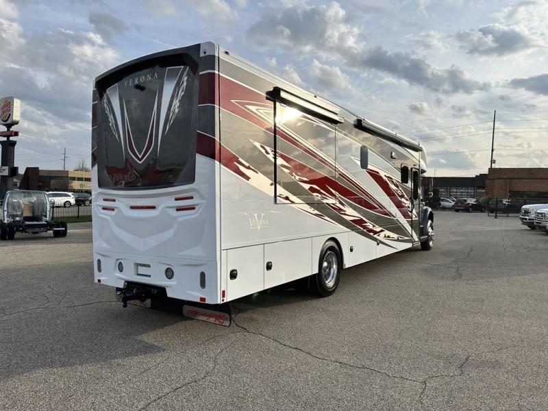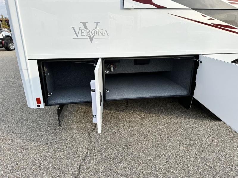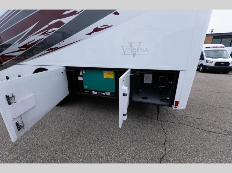 With any Renegade Verona Super C diesel motorhome, you will have confidence to explore the open road! The Cummins 360HP 3200TRV Allison transmission gives you the power and performance to travel anywhere, and the 3000-watt true sine wave inverter makes this an electric coach, plus the aluminum automotive cab construction is designed and tested for occupant protection. The interior boast about the solid hardwood cabinets including every cabinet stile and passage door are made from hardwood for true residential craftsmanship and the articulating cabinet hinges complete the package. More luxurious features include the solid surface countertops, the memory foam mattress, and the wavy patterned fiberglass shower with a glass door. Choose extreme luxury, purpose and durability; take a Verona on the road today!