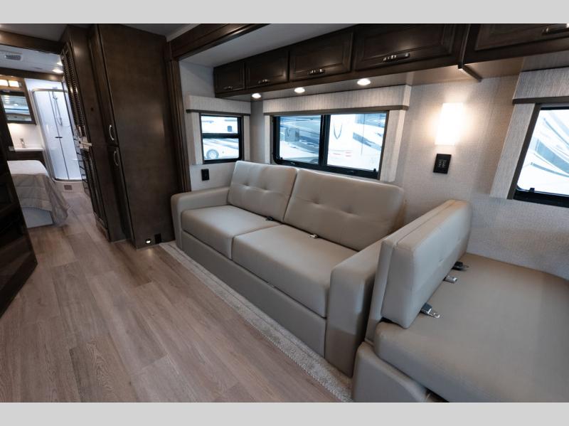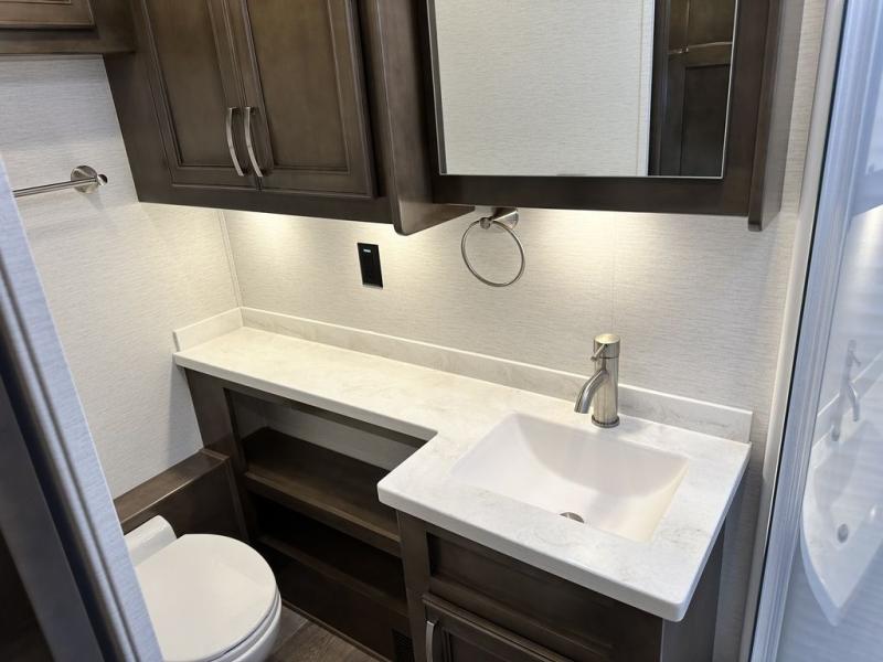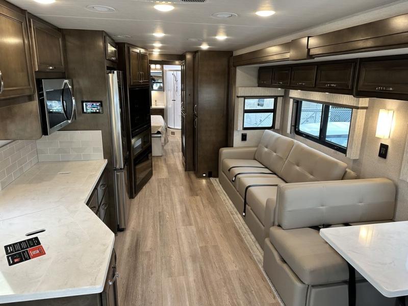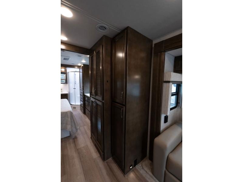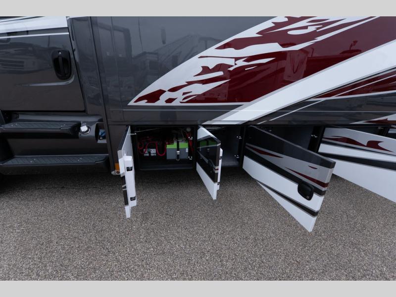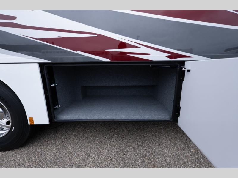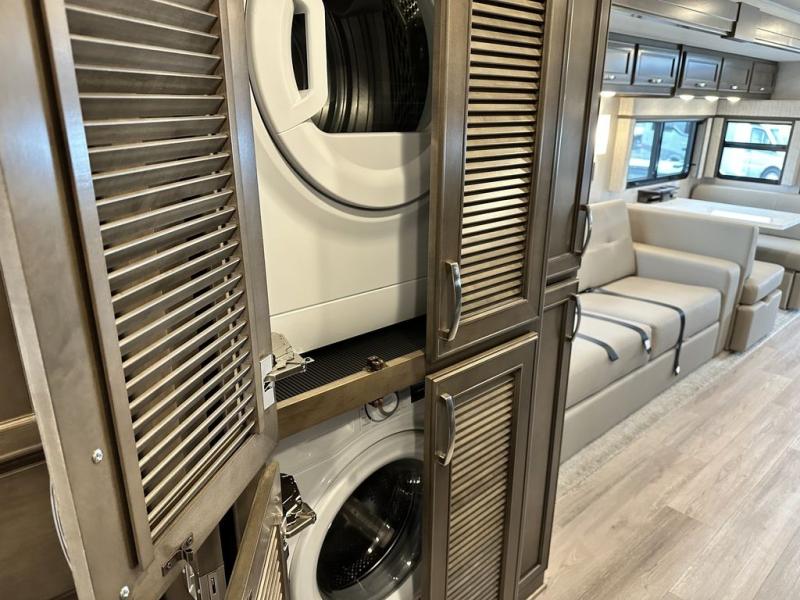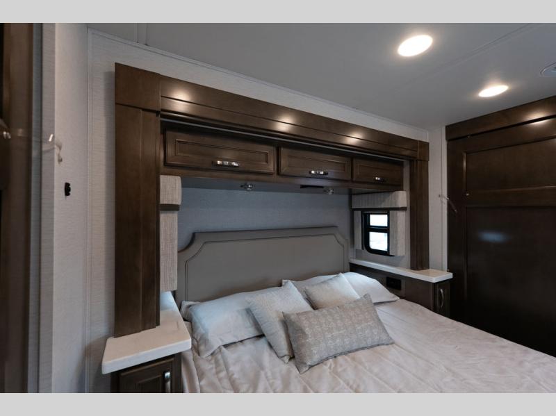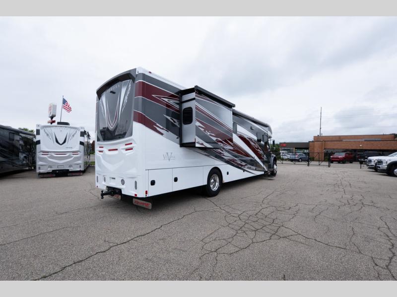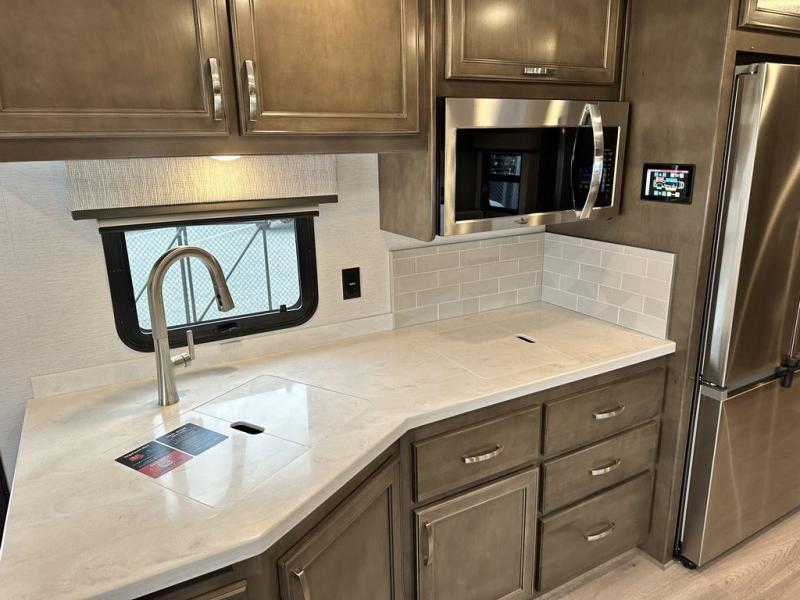With any Renegade Verona Super C diesel motorhome, you will have confidence to explore the open road! The Cummins 360HP 3200TRV Allison transmission gives you the power and performance to travel anywhere, and the 3000-watt true sine wave inverter makes this an electric coach, plus the aluminum automotive cab construction is designed and tested for occupant protection. The interior boast about the solid hardwood cabinets including every cabinet stile and passage door are made from hardwood for true residential craftsmanship and the articulating cabinet hinges complete the package. More luxurious features include the solid surface countertops, the memory foam mattress, and the wavy patterned fiberglass shower with a glass door. Choose extreme luxury, purpose and durability; take a Verona on the road today!