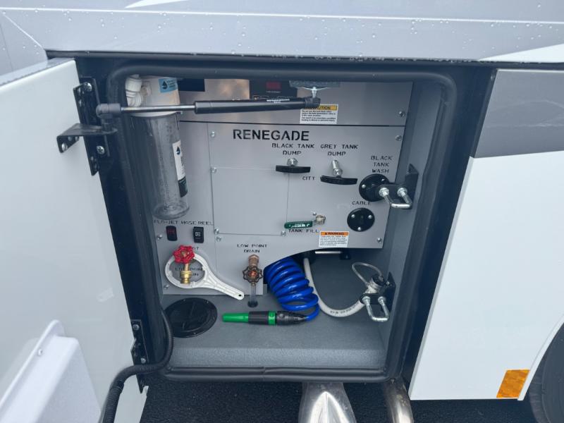 With any Verona LE Super C diesel motorhome by Renegade, you will be wowed by all the luxury features. The 2" vacuum laminated sidewalls feature welded aluminum framing for added support, and the 1.5" high density foam insulation in the sidewalls and roof means you can travel all year long in any season. The captain will love how easy it will be to drive with the Allison 3200TRV electronic 6-speed transmission, plus there are rear and side view cameras for easy parking and an upgraded cab sound system to keep the tunes going. Each model includes dual 15,000 BTU roof A/C pumps, an Aqua-Hot 450D hydronic water and zone heating system, plus MaxxAir power vents to keep you comfortable all year long. All of your power needs will be met with an 8kW Onan Quiet diesel generator, 3,000w True Sine wave inverter, (2) 330Ah AGM house batteries, and (3) 200W solar panels. Inside, there are three modern decor options to choose from, along with solid surface countertops, grouted tile backsplash, Maple hardwood cabinetry, and many more comforts of home!