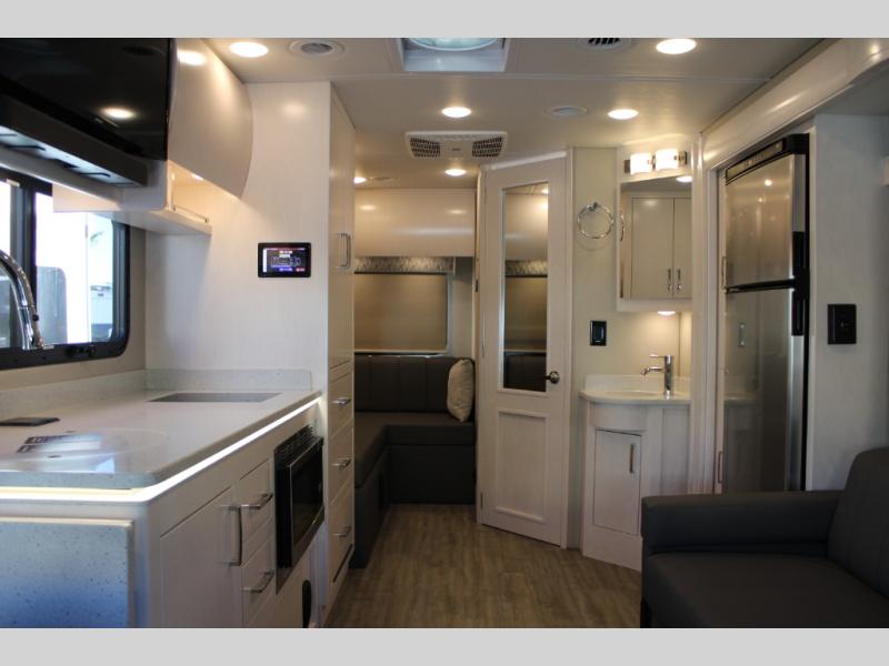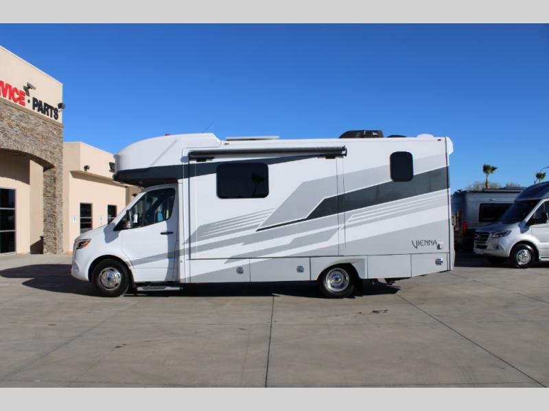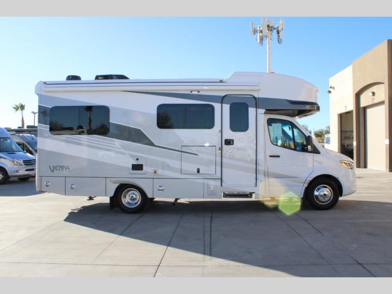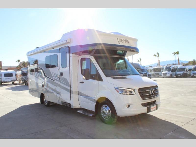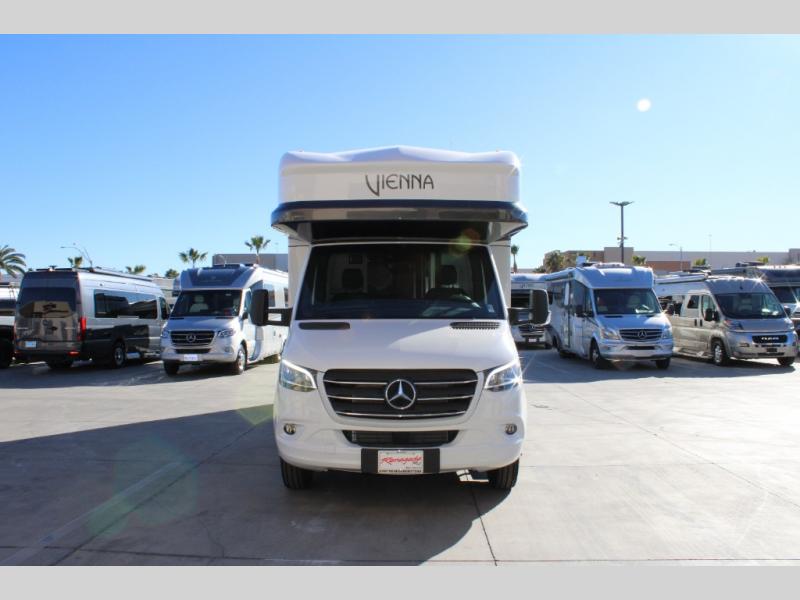 Luxury is in the details of each one of these Renegade Vienna Class C diesel motorhomes! They are built on a Mercedes-Benz Sprinter chassis, and include a four point hydraulic leveling system with app control, a 2000w true sine wave hybrid inverter, a 3.6KW LP generator with auto gen start, and Winegard Connect 2.0. You will appreciate the Truma™ Comfort Plus tankless water heater when showering, the accent lighting at the galley countertop for style, and the USB charging in the living area, bedroom and kitchen to keep your electronics ready. The Maple hardwood cabinetry completes the luxurious décor throughout the inside. Make your selection today!